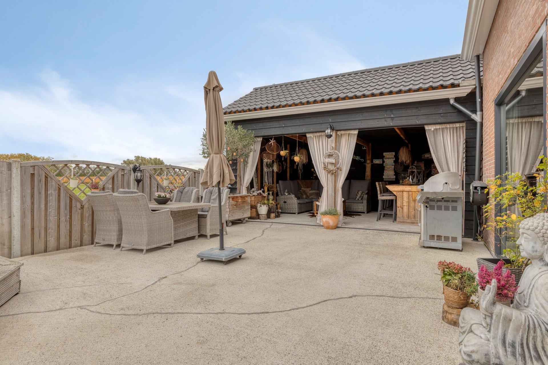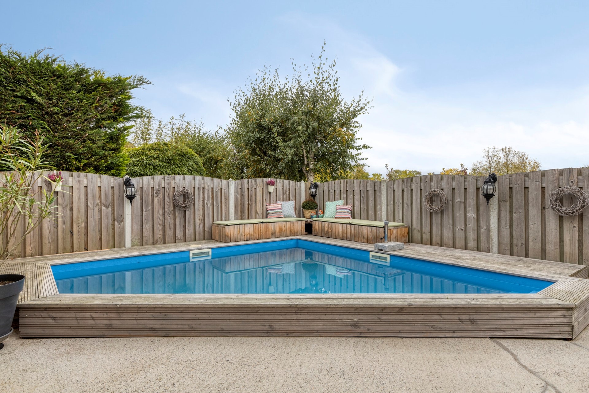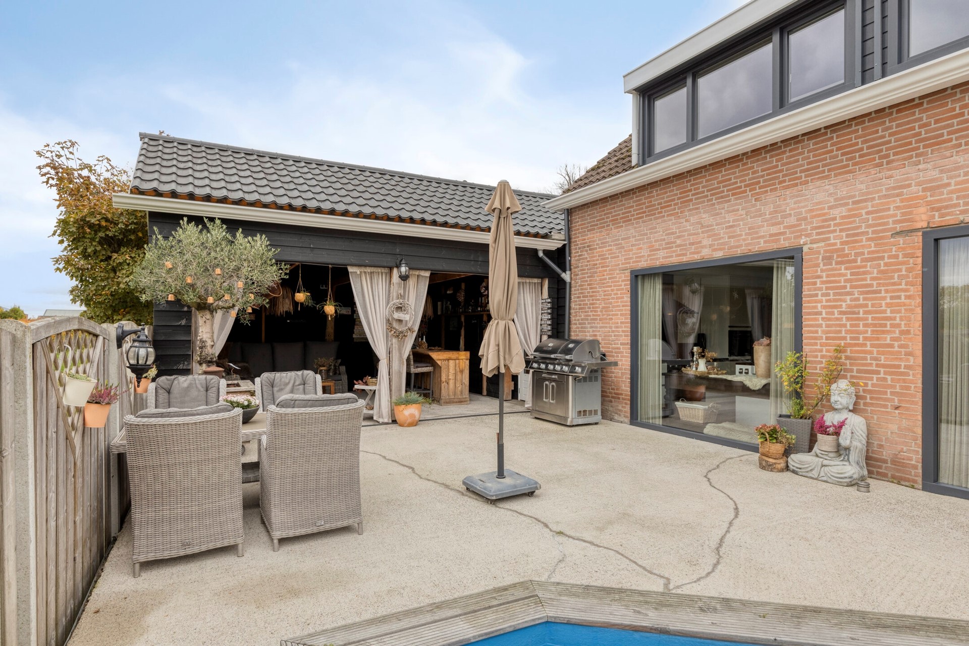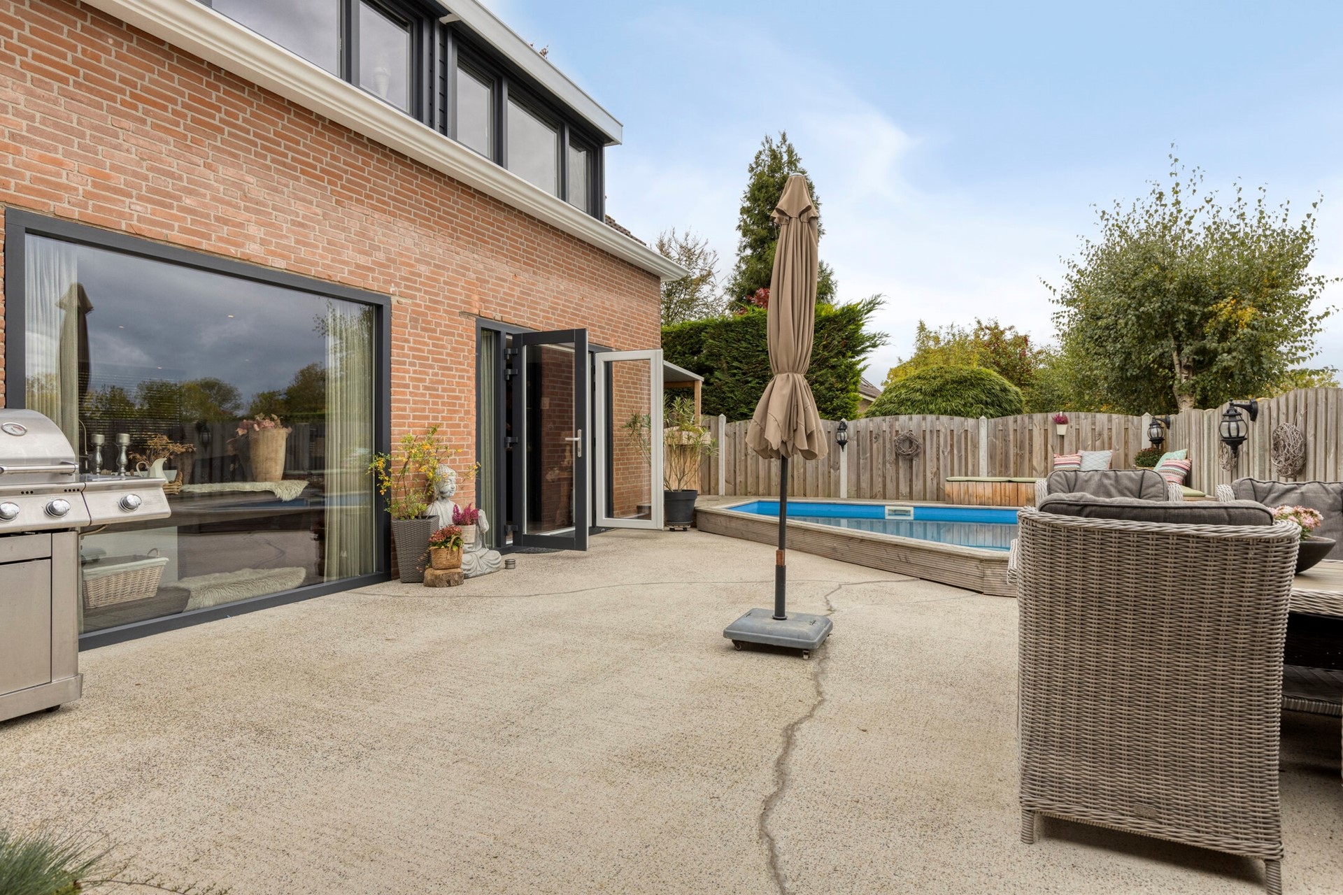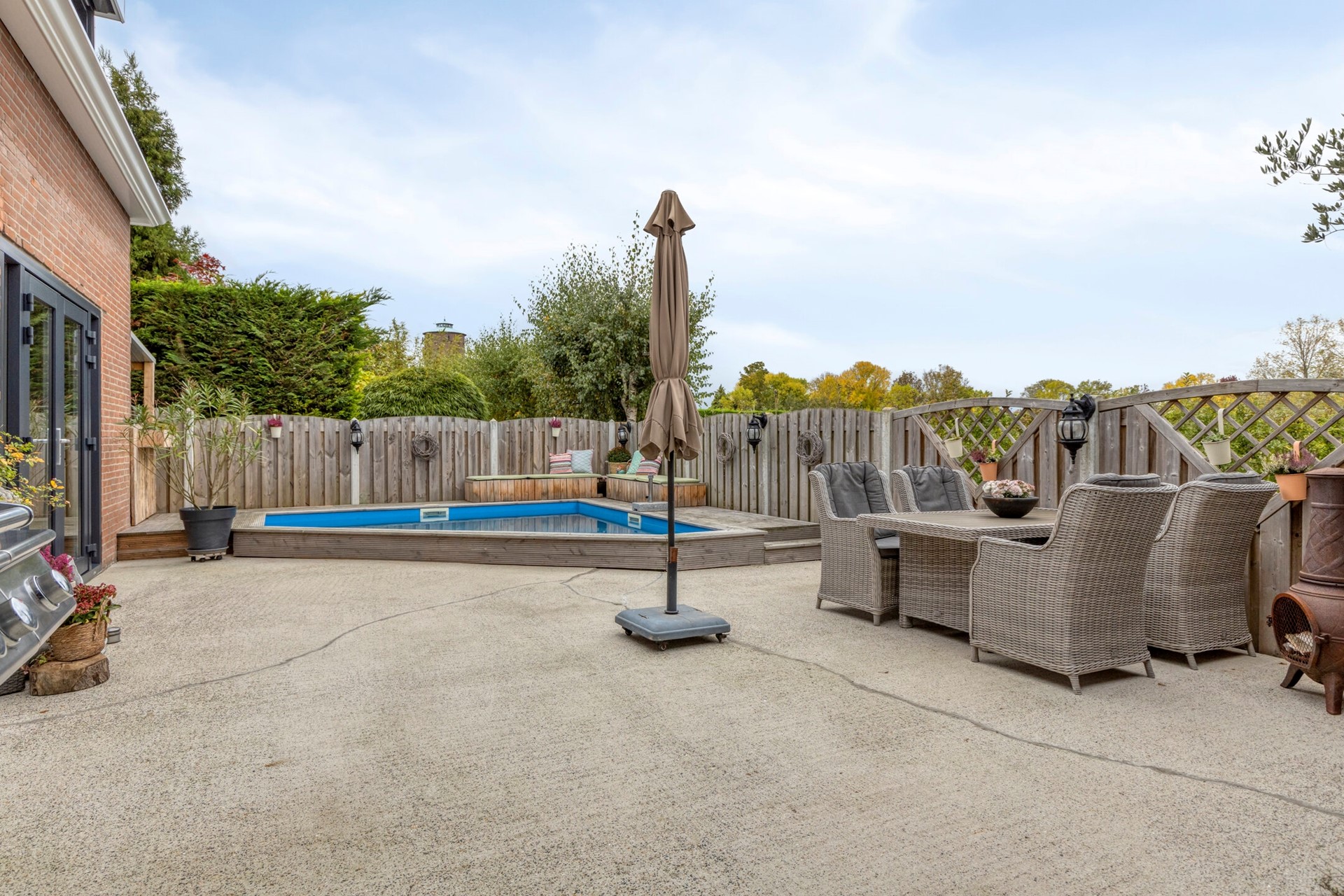 De woning beschikt over een heerlijke achtertuin met een prachtig uitzicht. De tuin is voorzien van een verwarmd buitenzwembad (incl. pompsysteem en chloor dispenser) en een sfeervolle veranda (2021).
