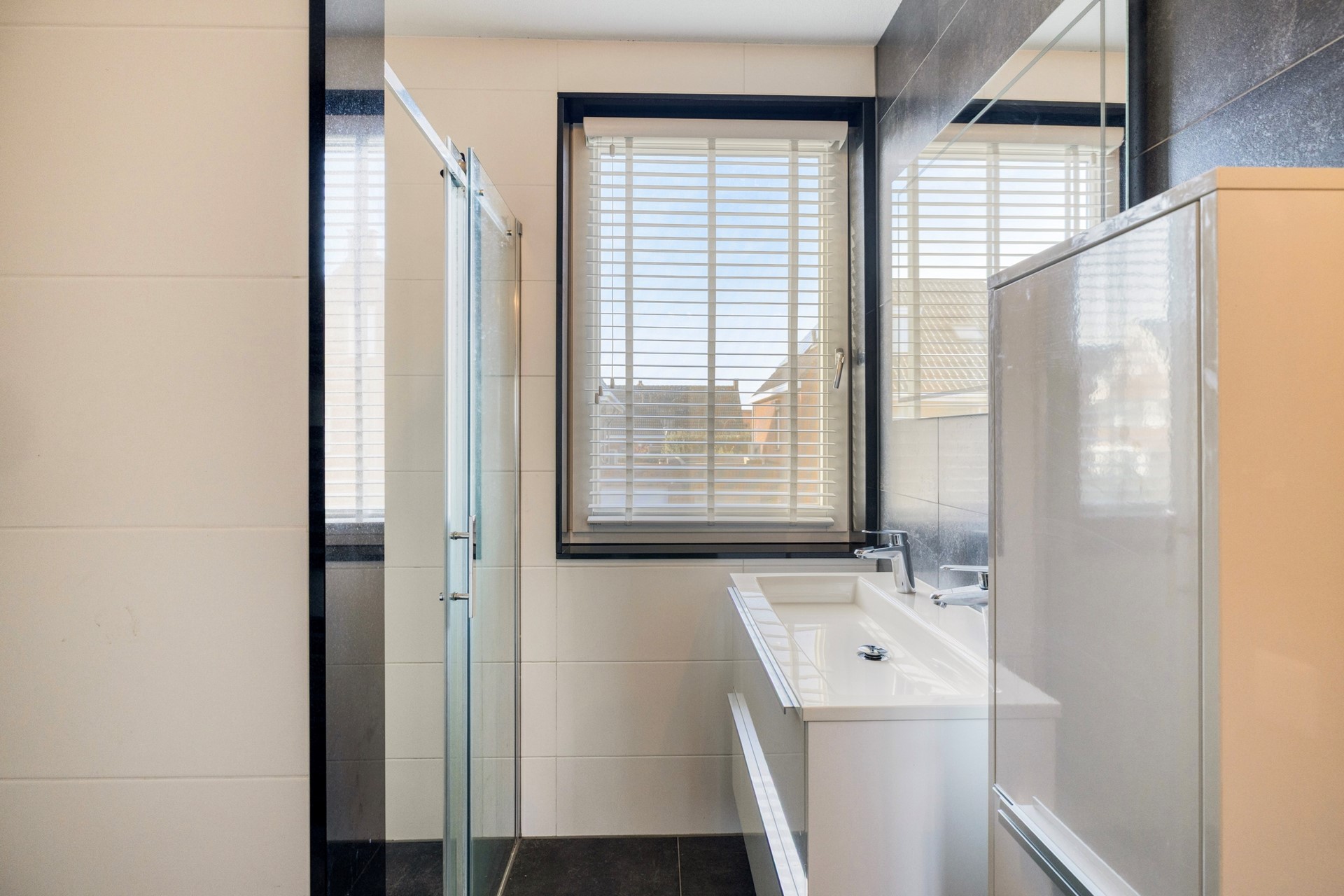 De badkamer is afgewerkt met een betegelde vloer, betegelde wanden en spuitwerk plafond. De badkamer is voorzien van een douche, wastafel met wastafelmeubel, tweede toilet en mechanische ventilatie.