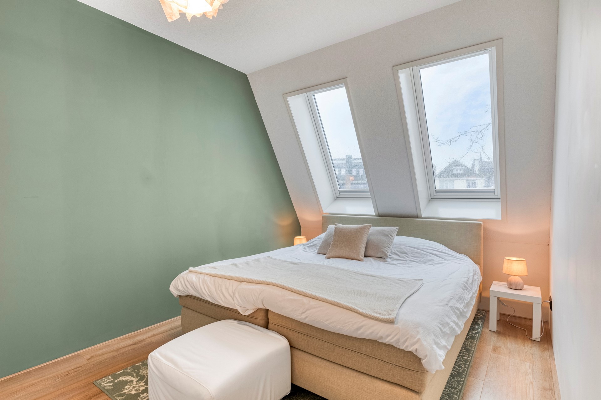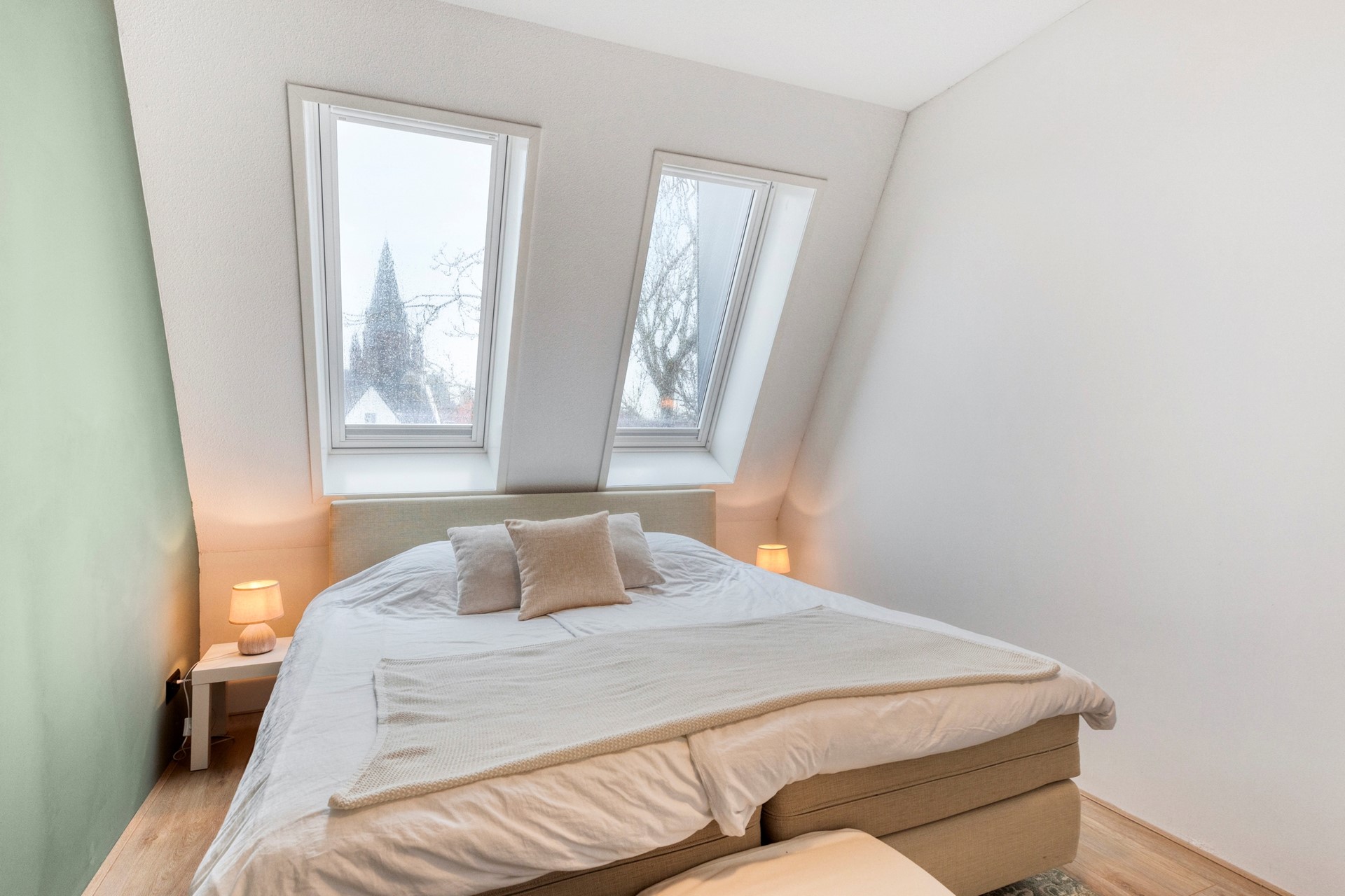 De riante slaapkamer is afgewerkt met een laminaatvloer, gestucte wanden en een spuitwerkplafond. De slaapkamer is voorzien van twee Velux dakramen die een zee van licht bieden en uitzicht op de Sint-Gummaruskerk en het Oude Stadshuis.