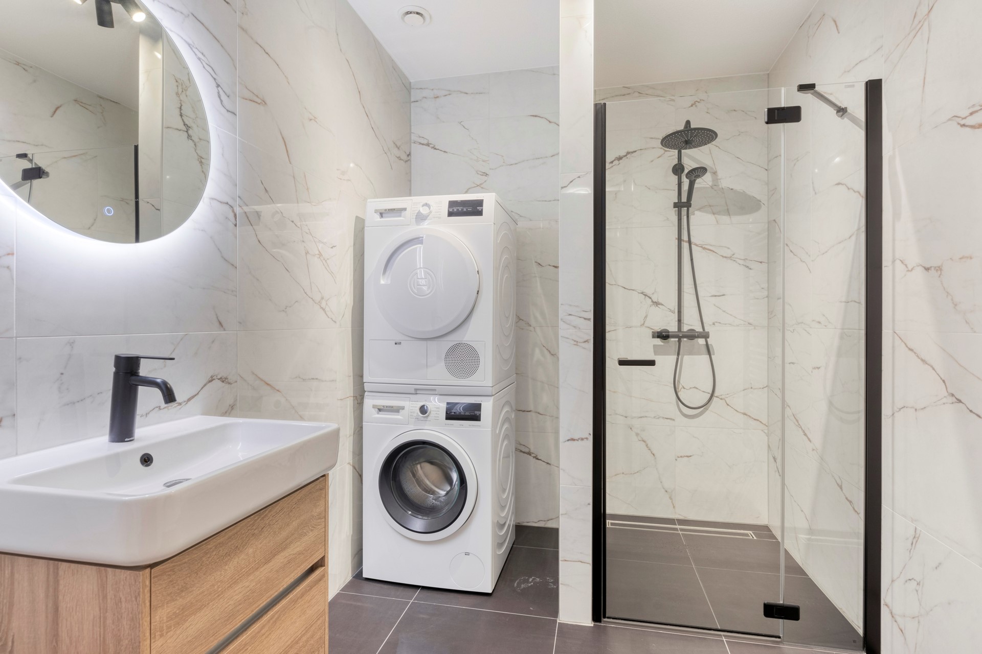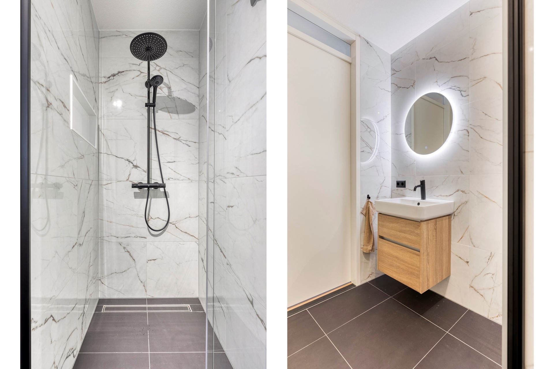 Wauw, wat een gave badkamer! De moderne badkamer is afgewerkt met een betegelde vloer, Betegelde wanden in koperkleurige marmerlook en een spuitwerkplafond. De badkamer is voorzien van een riante inloopdouche (incl. regendouche, inbouwnis en pendeldeur), wastafelmeubel met verlichte spiegel, aansluiting wasmachine en droger, designradiator en mechanische ventilatie.