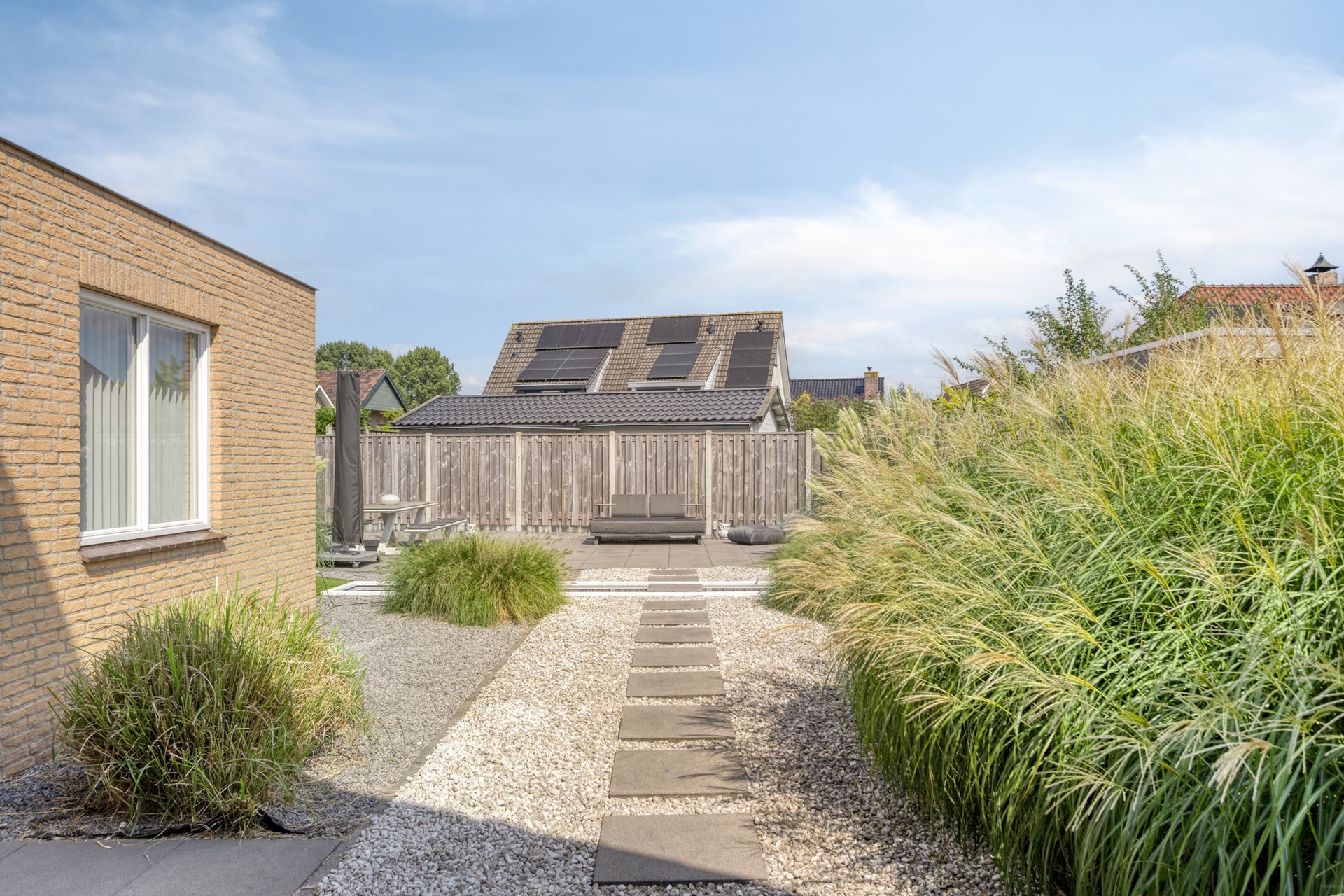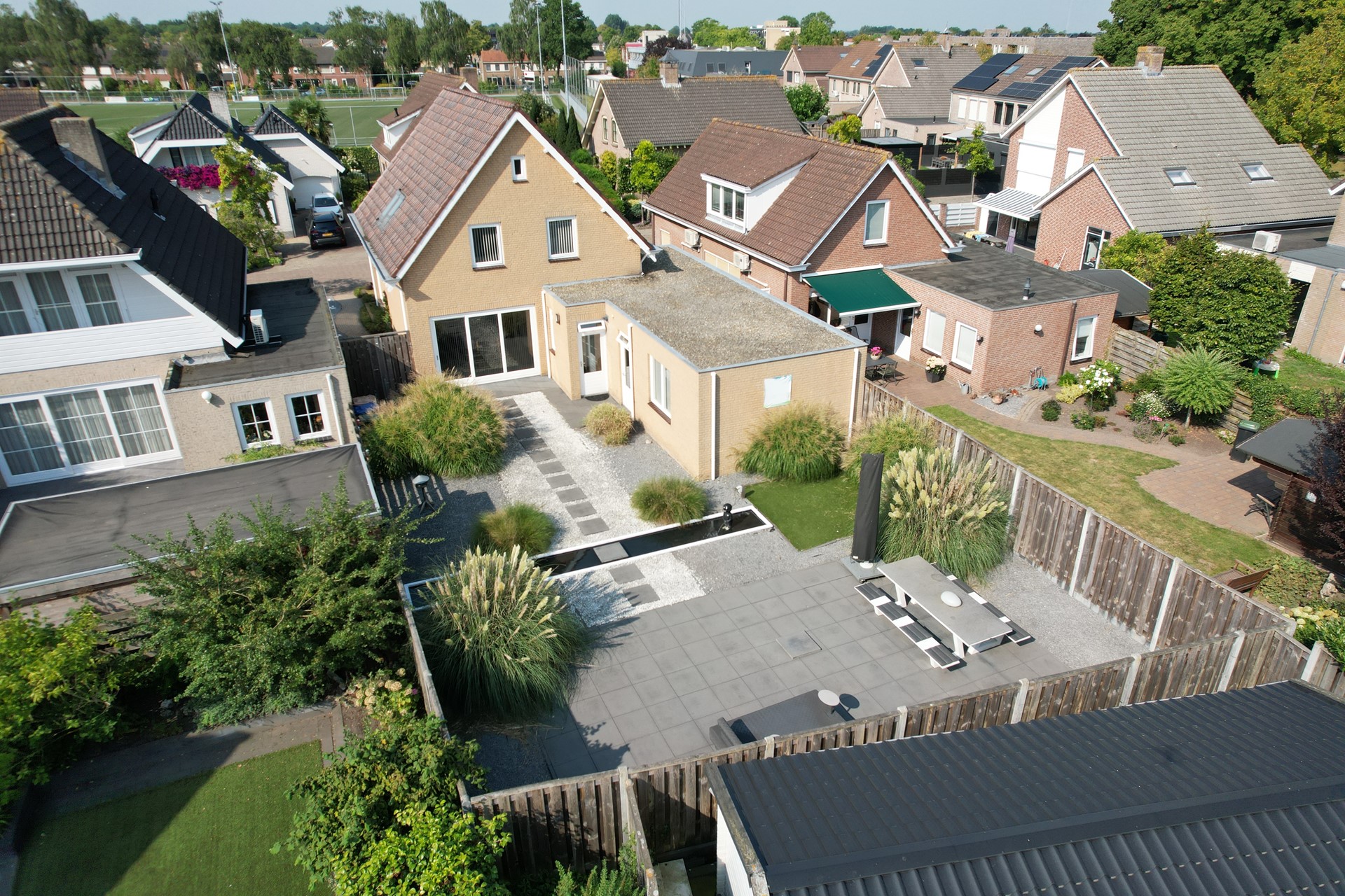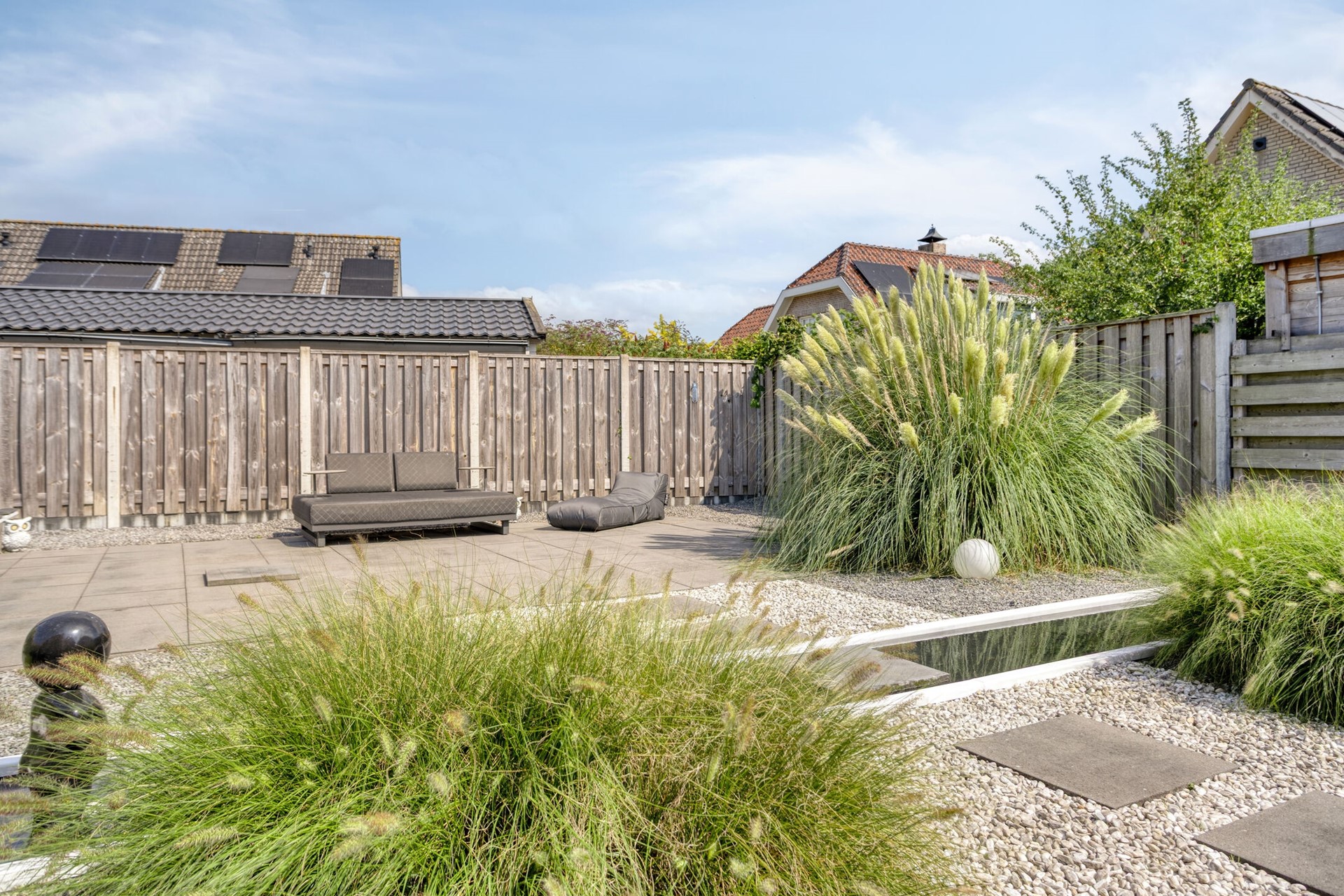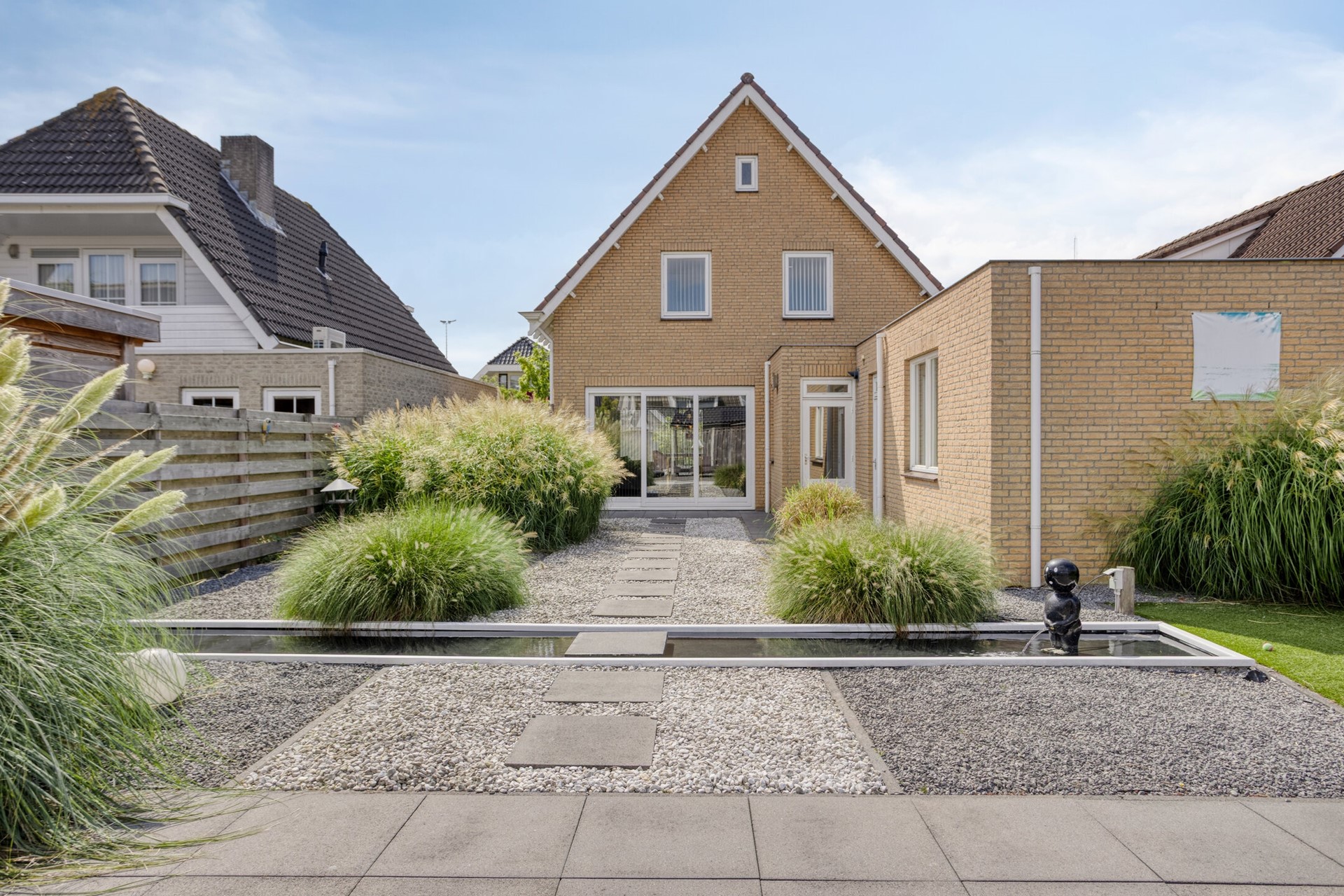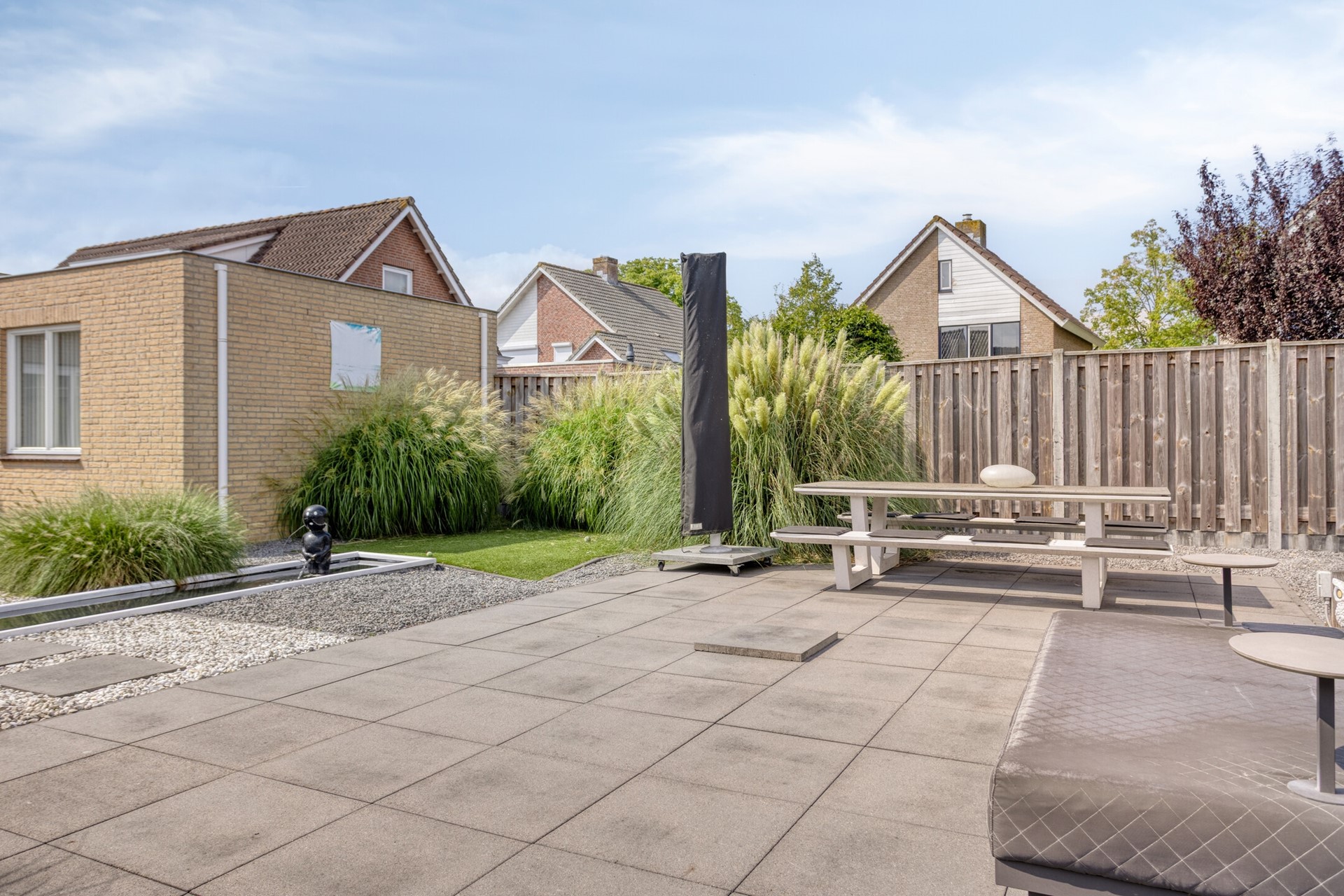De achtertuin is de ideale plek om te genieten van het buitenleven! Ontsnap aan de drukte van het dagelijks leven in jullie eigen stukje paradijs in de achtertuin. De achtertuin is voorzien van een terras, sierbestrating, borders, kunstgazon, vijverpartij, achteruitgang.