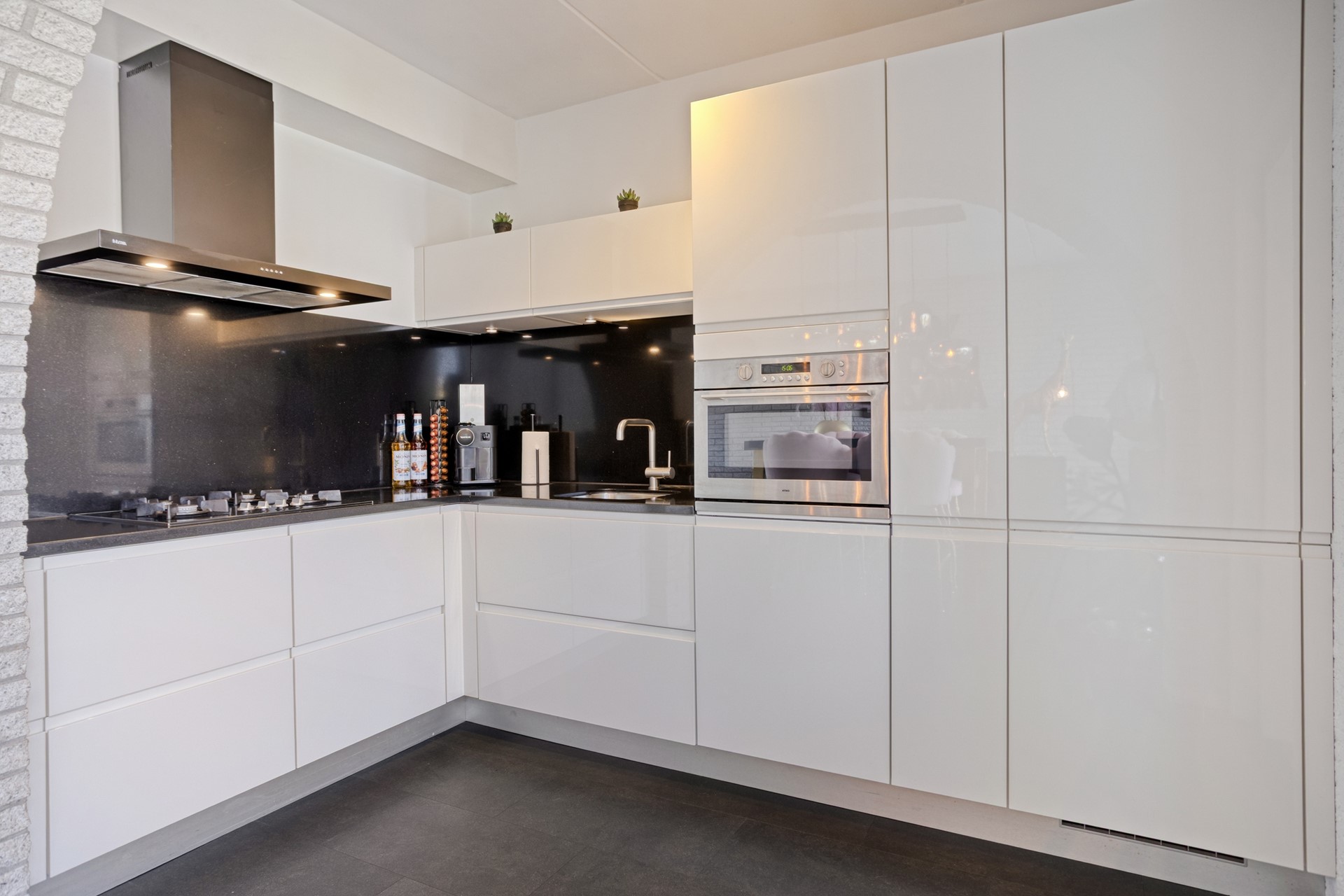 Houden jullie van koken? Dan laat deze open keuken jullie woondromen uitkomen. De open keuken is afgewerkt met een PVC vloer (incl. vloerverwarming), gestuct wanden en een spuitwerk plafond. De in hoek opgestelde keukeninrichting is voorzien van een graniet keukenblad, onder- en bovenkastjes, apothekerskast, gasfornuis, combi-oven, afzuigkap, koelkast en vaatwasser.