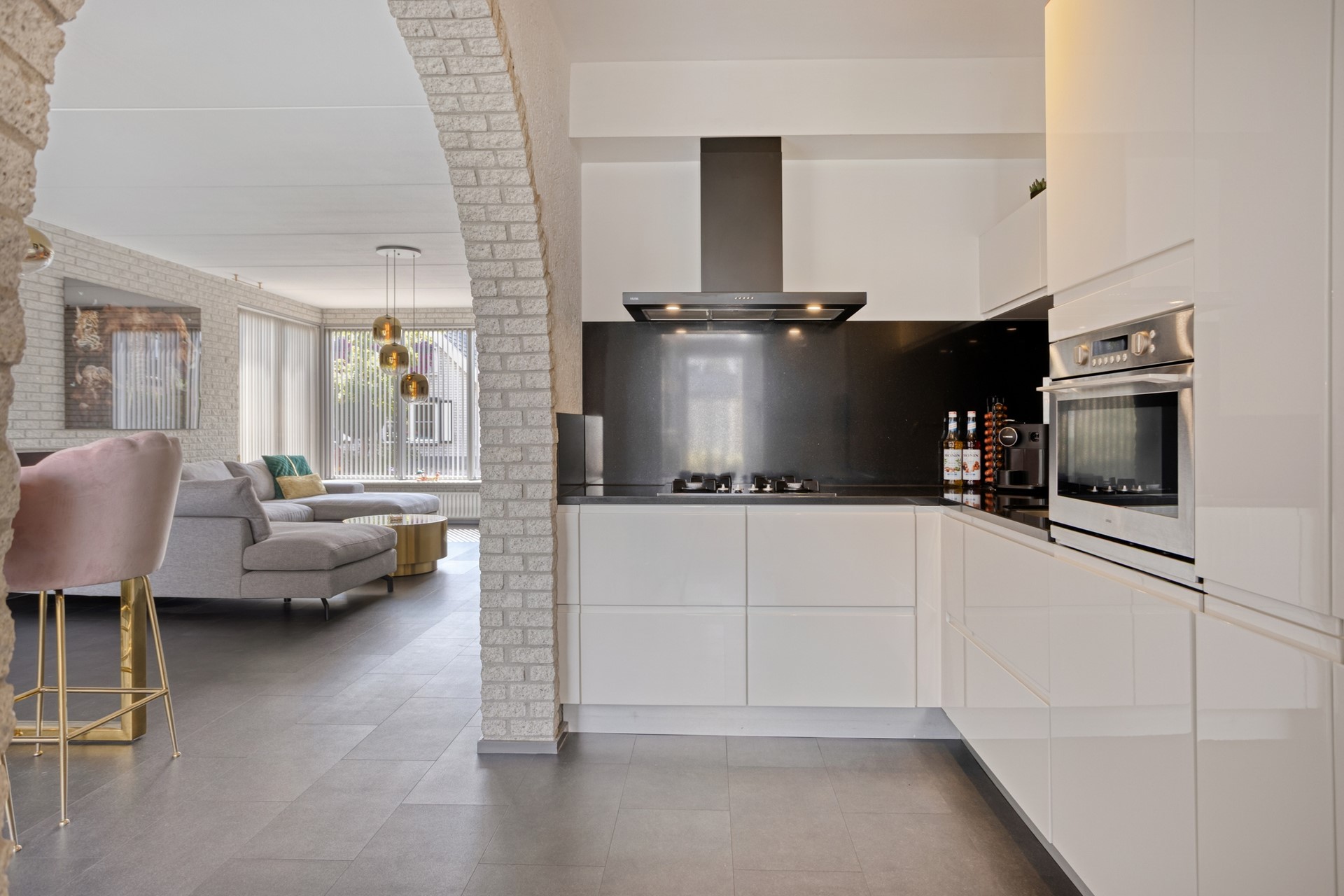 De sfeervolle woonkamer geeft jullie direct een gevoel van thuiskomen. De woonkamer is afgewerkt met een PVC vloer (incl. vloerverwarming), deels sierpleister en deels schoonmetselwerk wanden en een spuitwerk plafond. De woonkamer is voorzien van een convectorput en biedt toegang tot de tuin middels een hardhouten schuifpui.