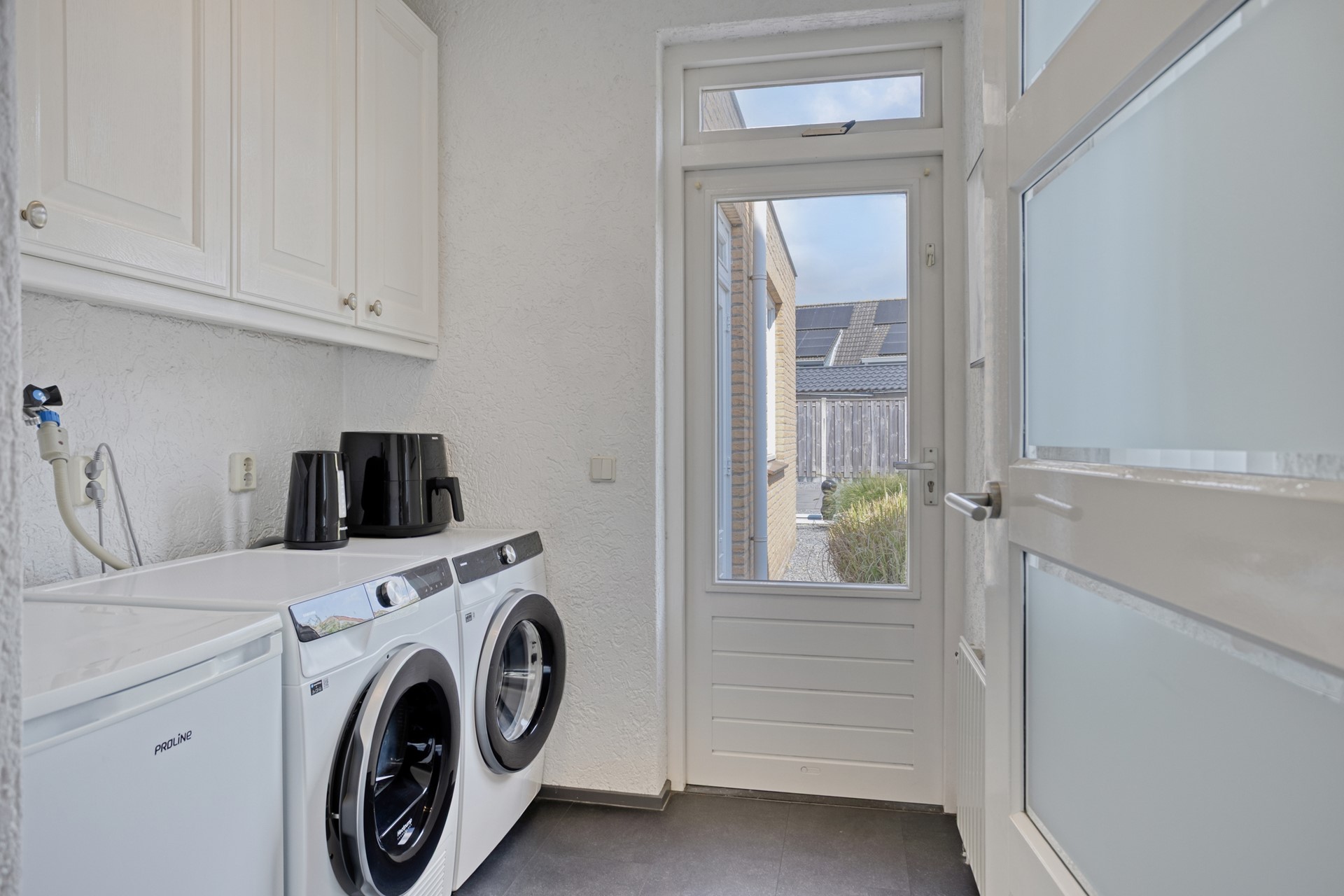 De bijkeuken is afgewerkt met een PVC vloer, sierpleister wanden en een spuitwerk plafond. De bijkeuken is voorzien van de aansluiting voor wasmachine en droger. Vanuit de bijkeuken is er toegang tot de achtertuin middels een openslaande tuindeur.