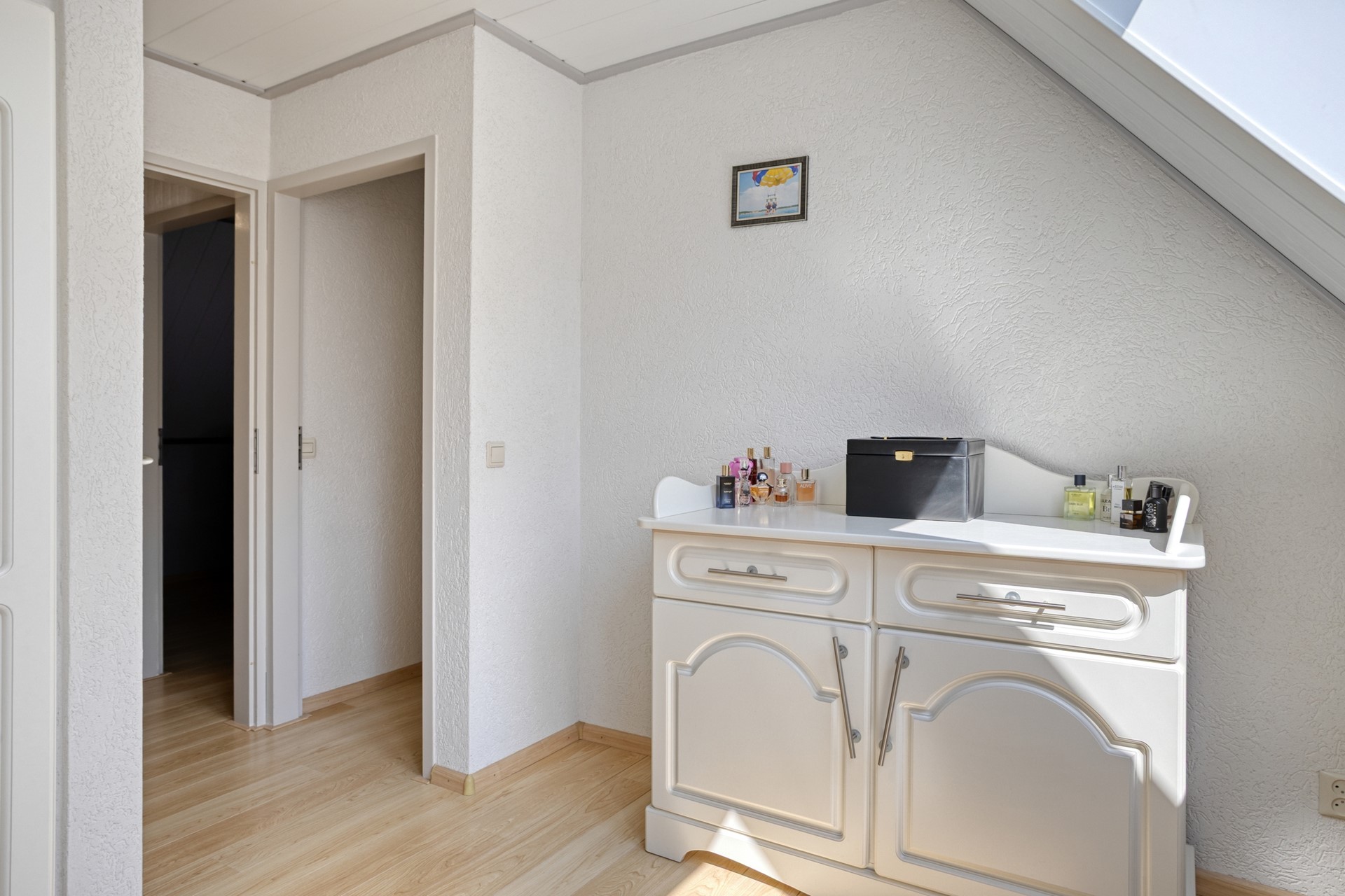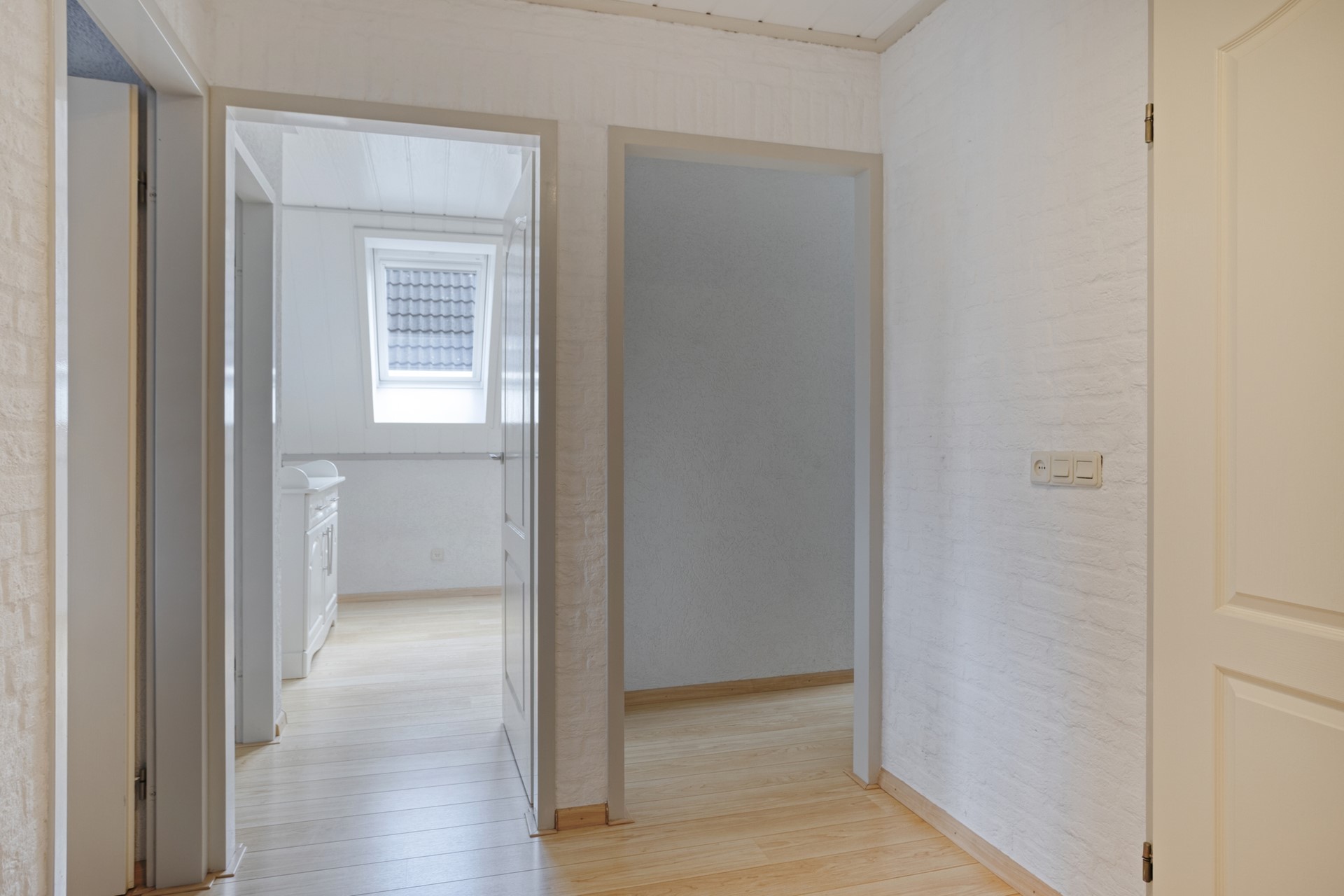 Slaapkamer 3 is afgewerkt met een laminaat vloer, sierpleister wanden en kunststof delen plafond. De slaapkamer is voorzien van twee Velux kunststof dakramen.