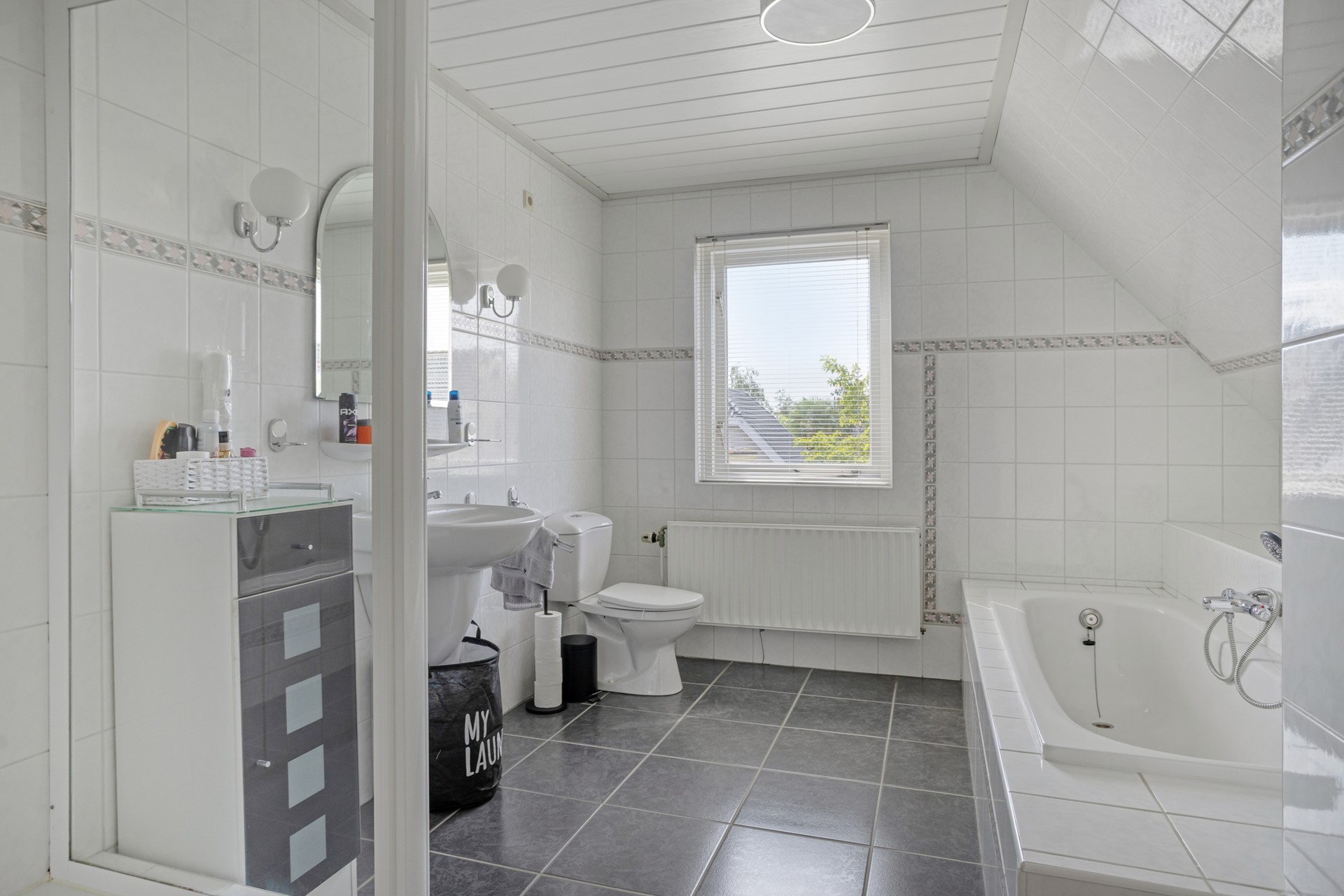 Me-Time! Ontsnap aan de dagelijkse drukt en kom tot rust in het heerlijke ligbad. De badkamer is afgewerkt met een betegelde vloer, betegelde wanden en een kunststof delen plafond. De badkamer is voorzien van een ligbad, 2e toilet, douche cabine, wastafel, radiator en natuurlijke ventilatie.