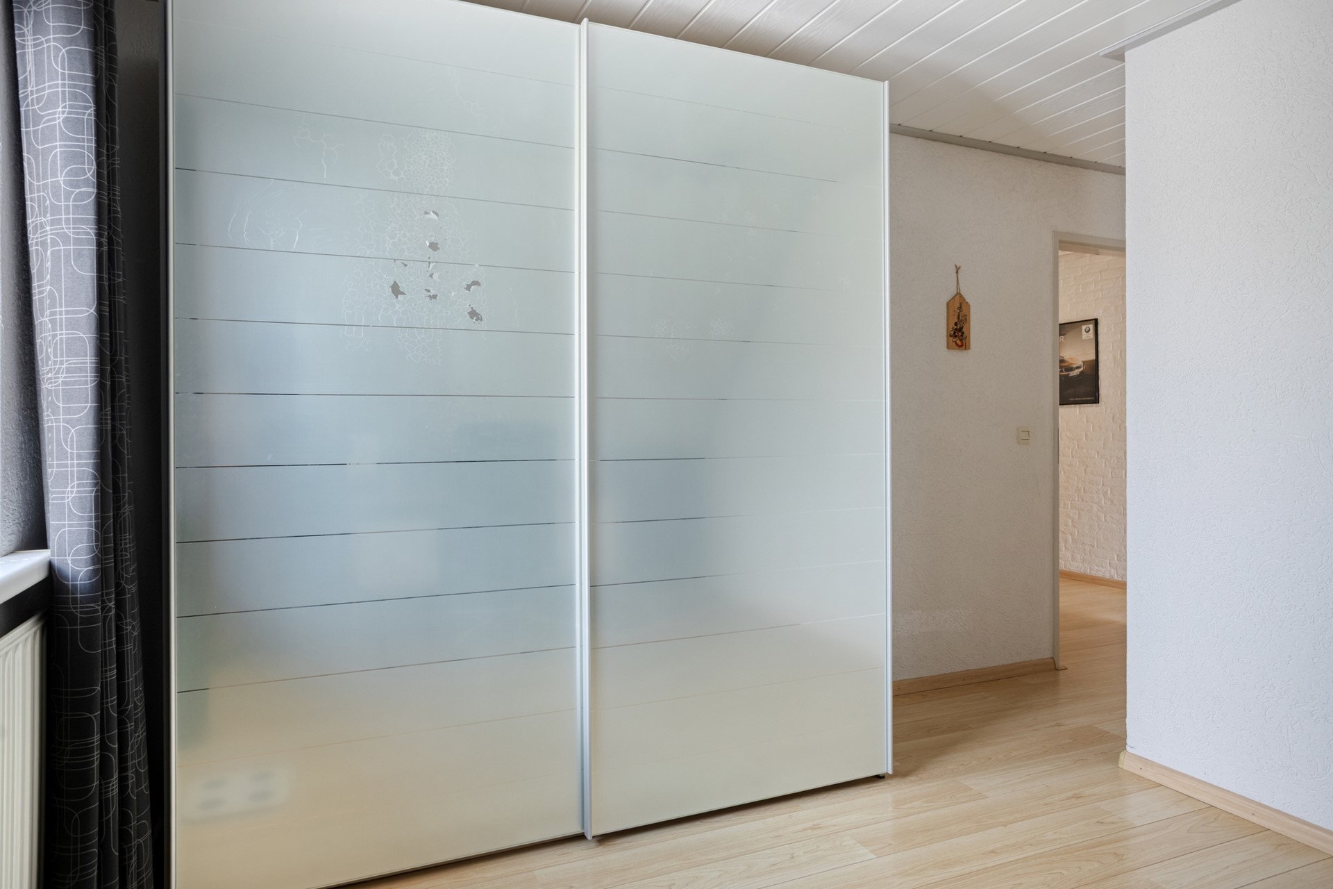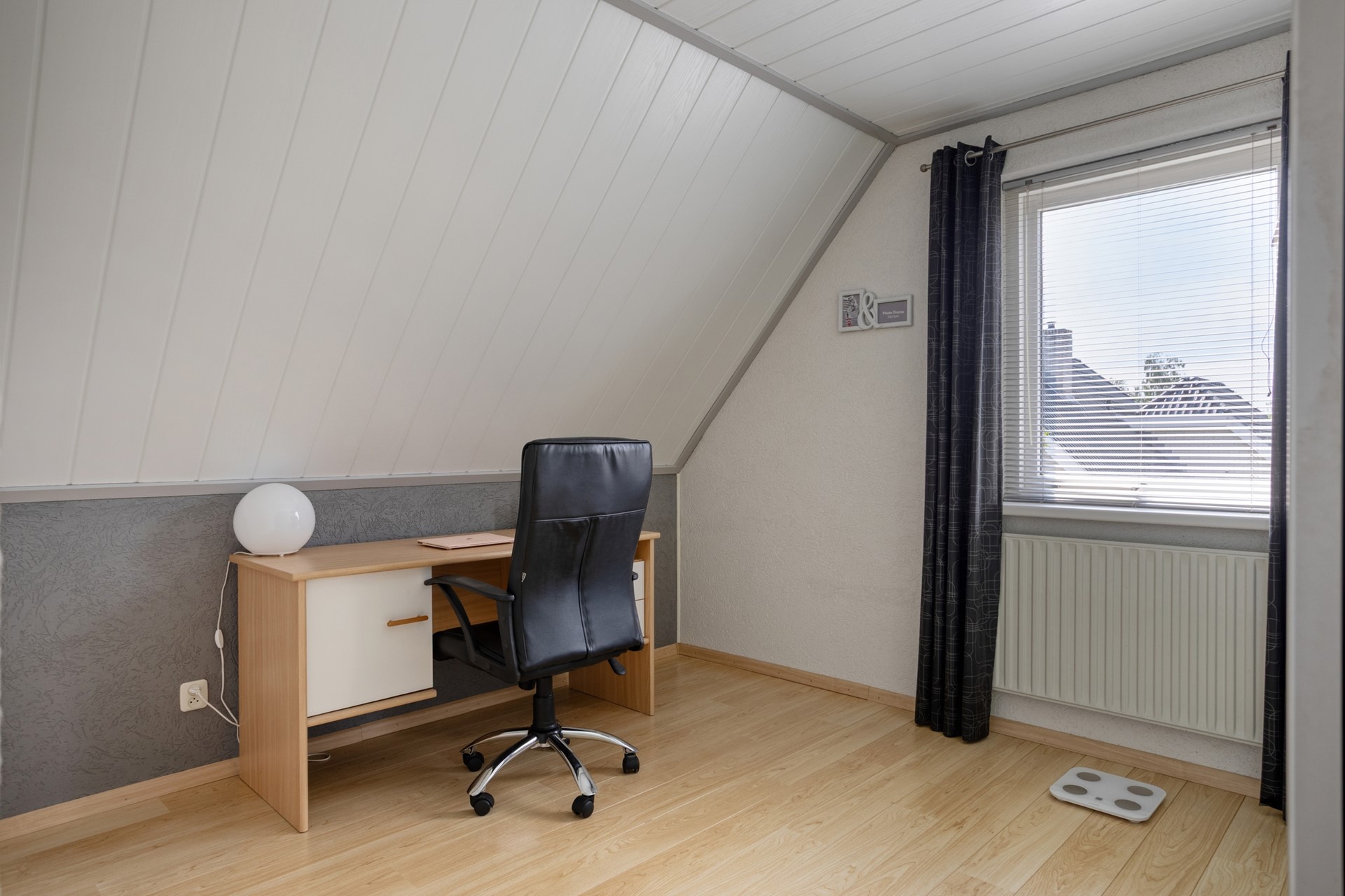 Slaapkamer 1 is afgewerkt met een laminaat vloer, gesauste wanden en kunststof delen plafond.