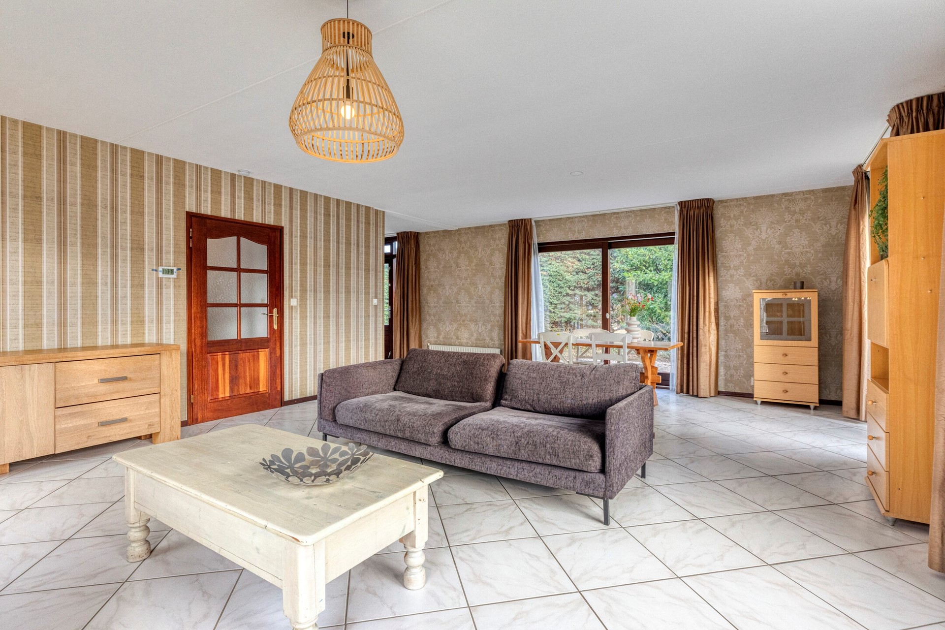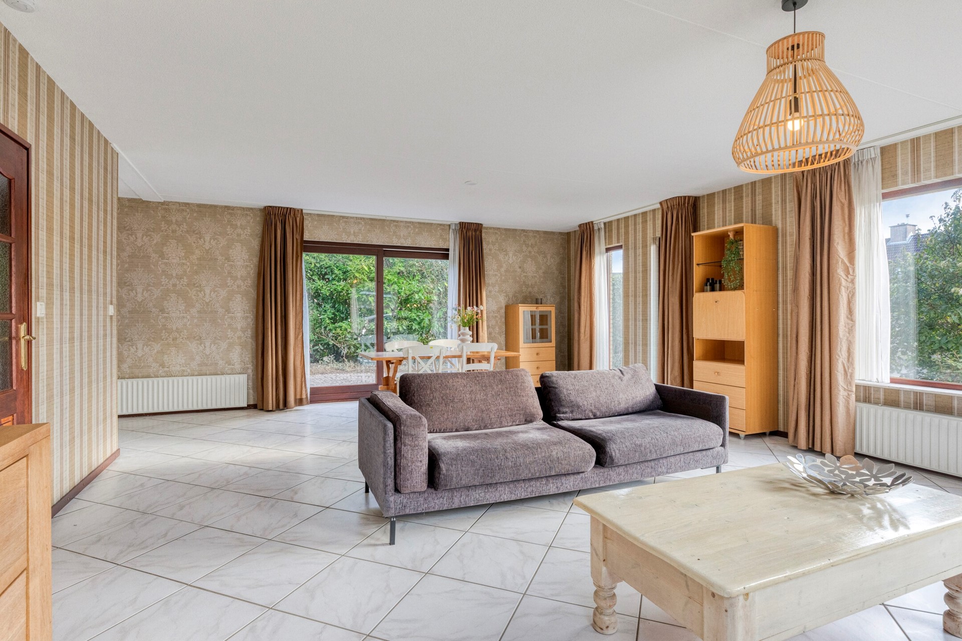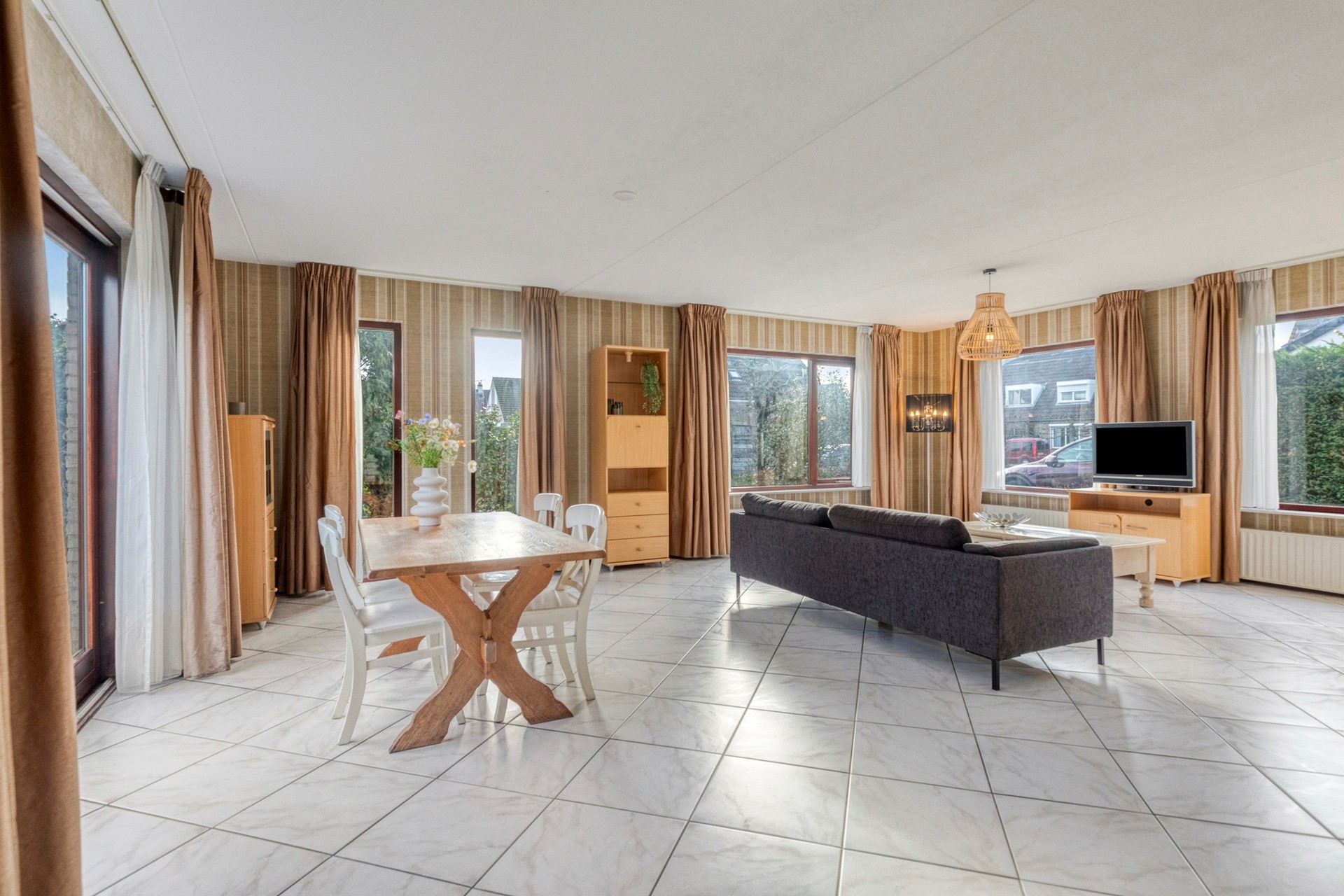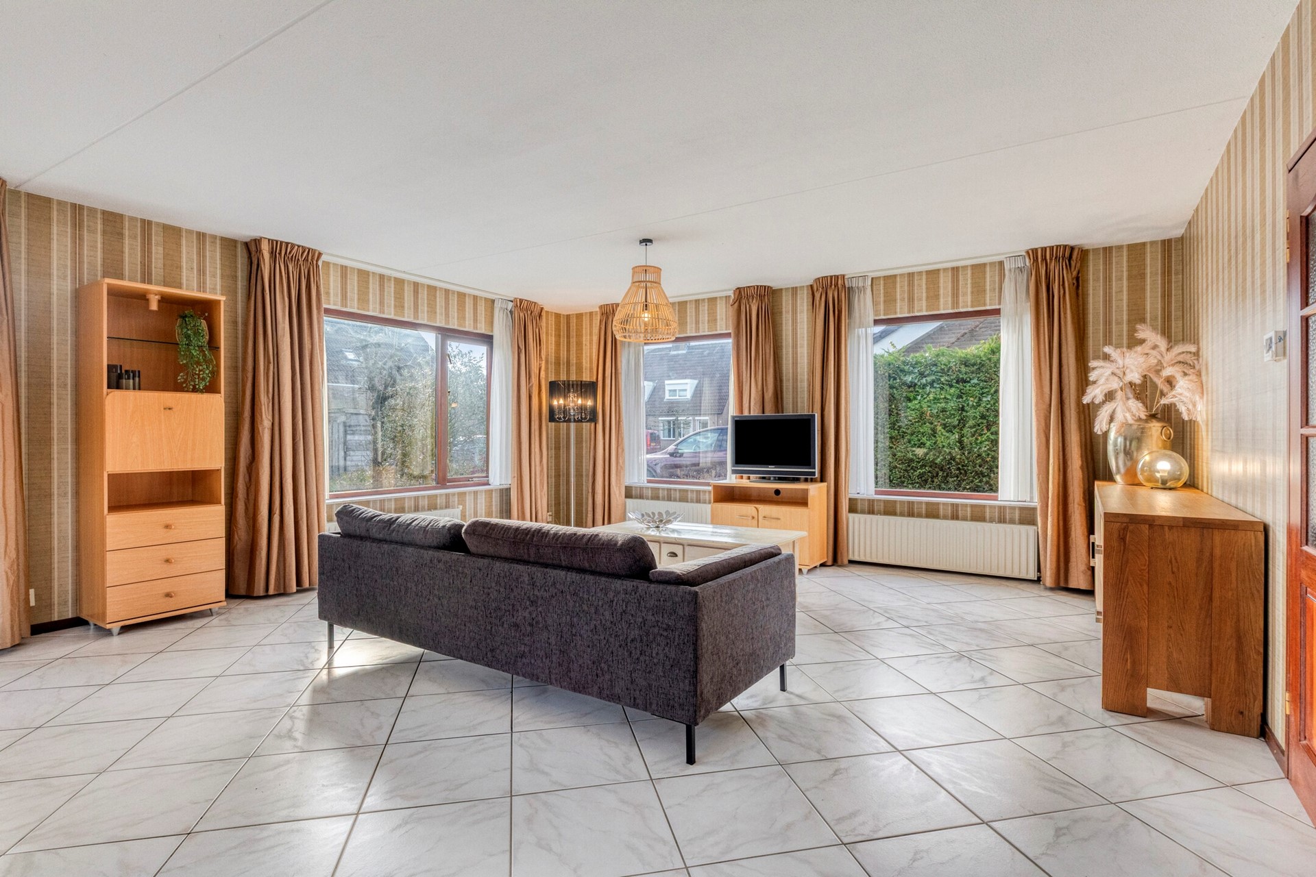De woonkamer is afgewerkt met een betegelde vloer, behangen wanden en een spuitwerk plafond. De woonkamer is voorzien van veel lichtinval door de vele raampartijen. Middels een hardhouten schuifpui is er toegang tot de achtertuin en staat binnen en buiten met elkaar in verbinding. Vanuit de woonkamer is er toegang tot de half open keuken.