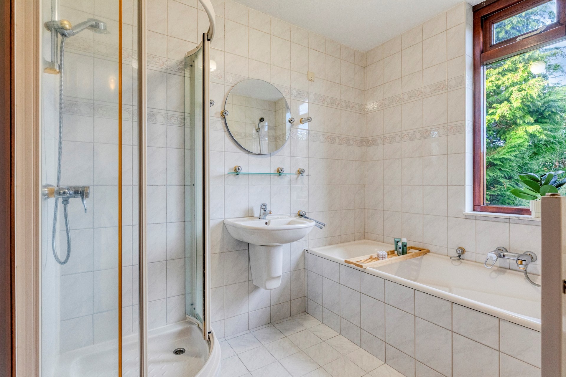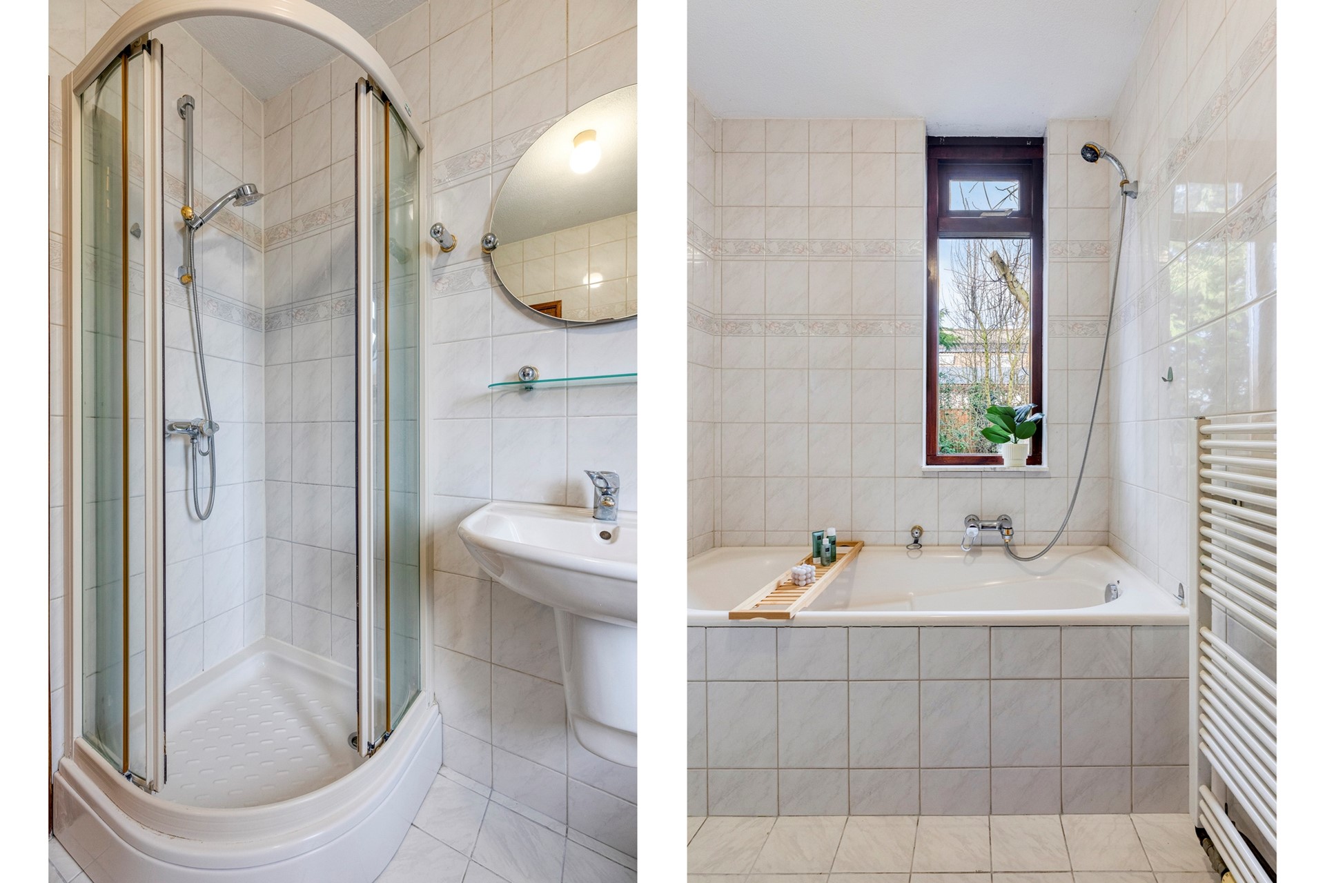 De badkamer is afgewerkt met een betegelde vloer, betegelde wanden en een spuitwerk plafond. De badkamer is voorzien van een douchecabine, wastafel, ligbad, natuurlijke ventilatie en een design radiator.