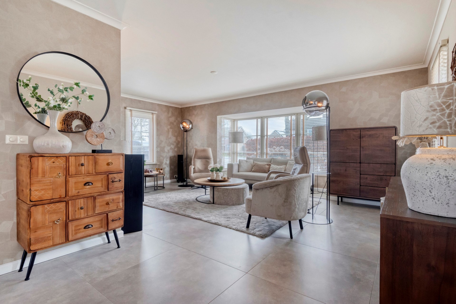 Een zee aan lichtinval! De erker in de woonkamer zorgt voor extra licht en ruimte. De woonkamer is afgewerkt met een betegelde vloer, deels behangen en deels gestucte wanden en een gestuct plafond. De modern afgewerkte living biedt toegang tot de eetkamer en de moderne keuken.