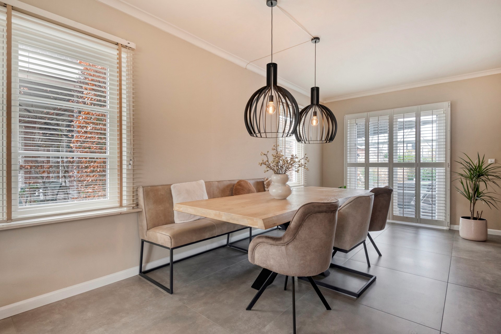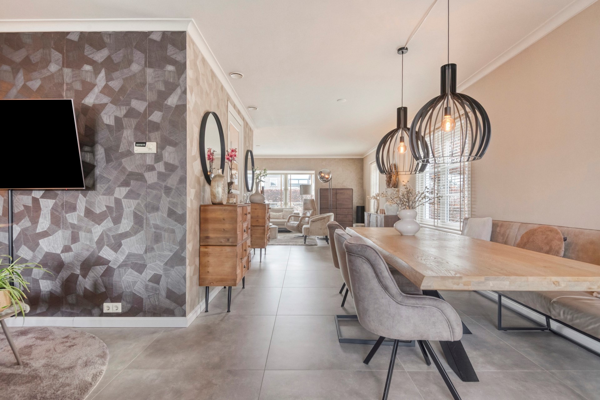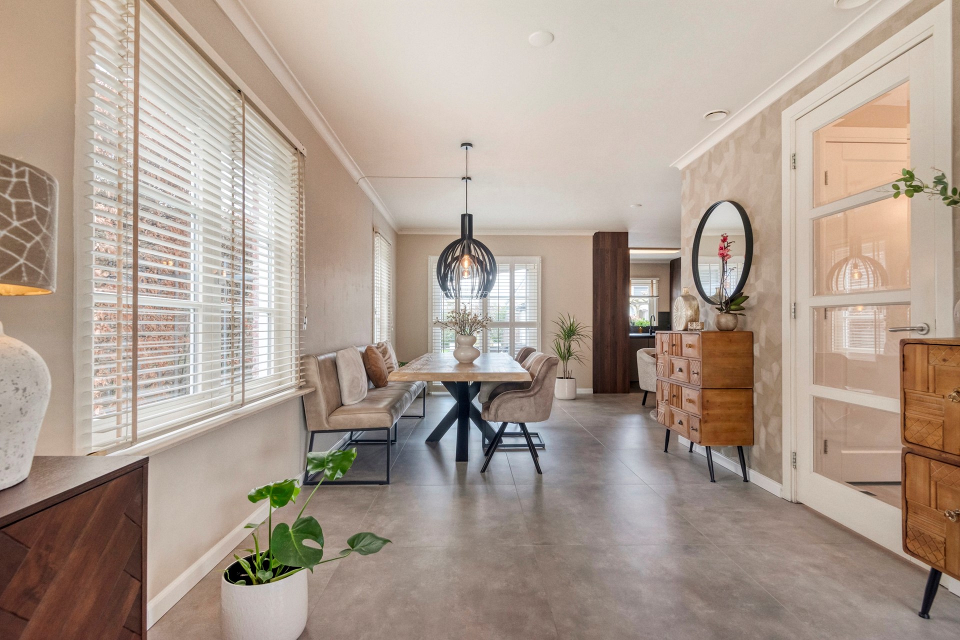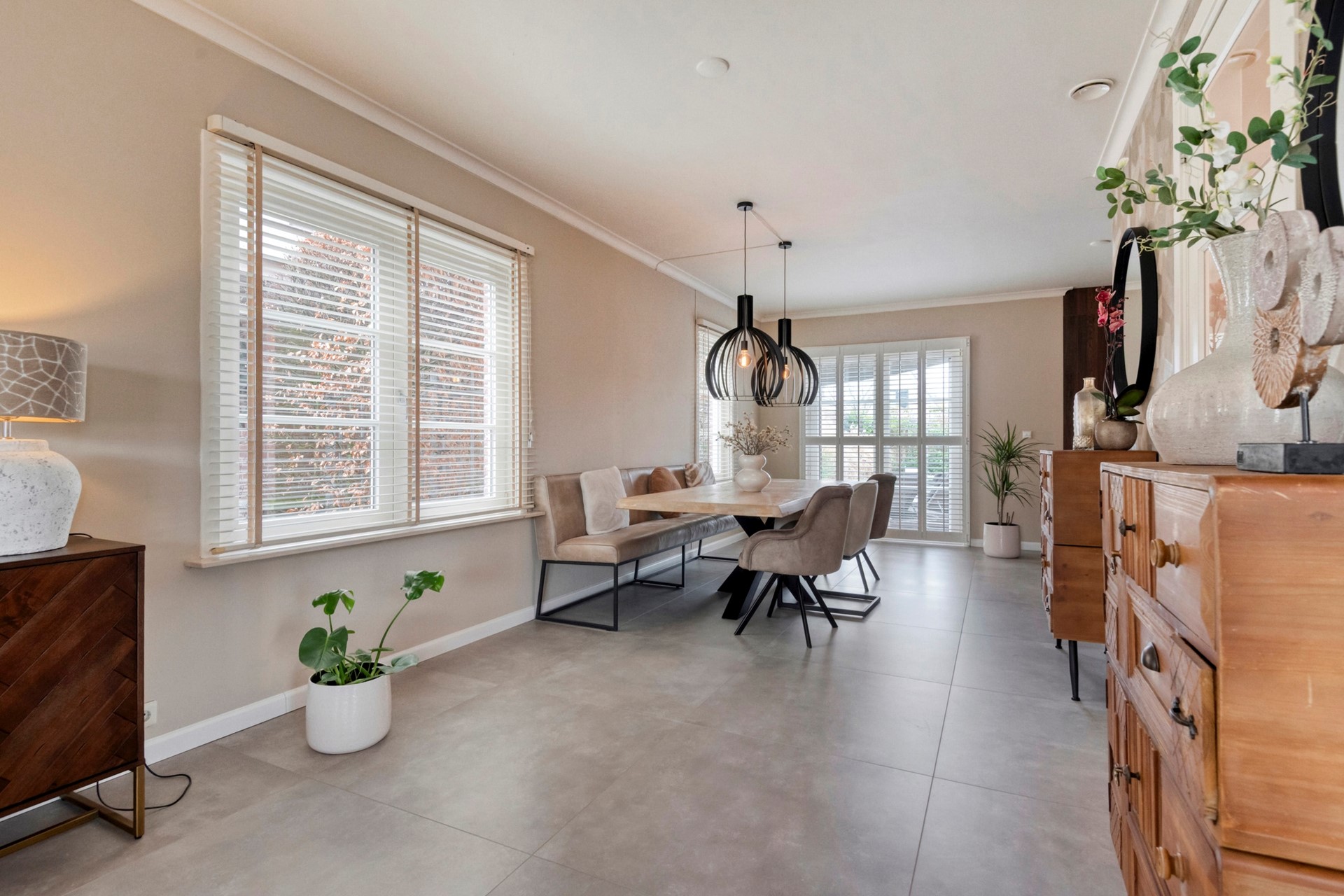 De eetkamer is perfect voor gezellige diners, met grote raampartijen die veel licht binnenlaten en een prachtig uitzicht op de tuin.