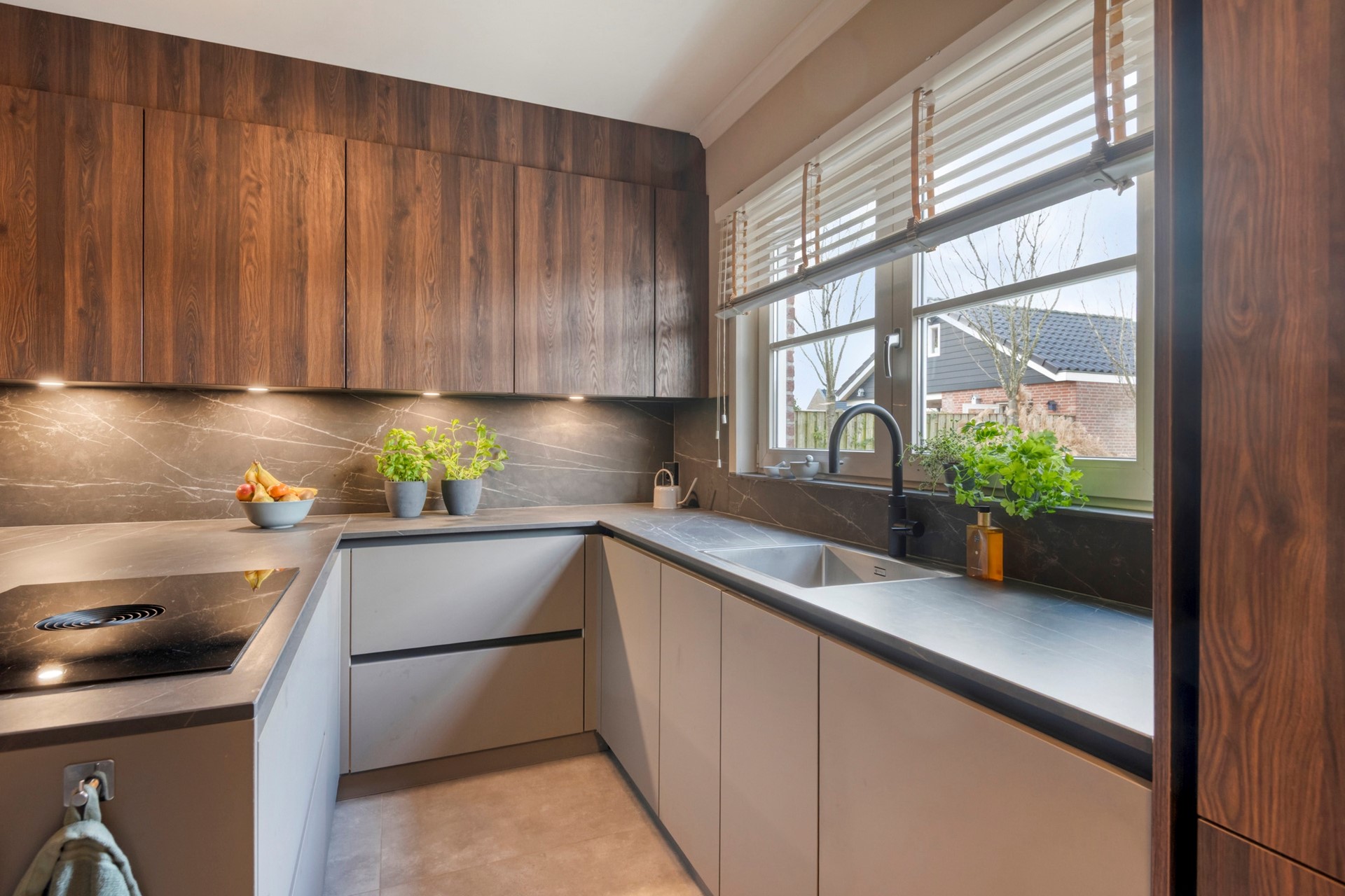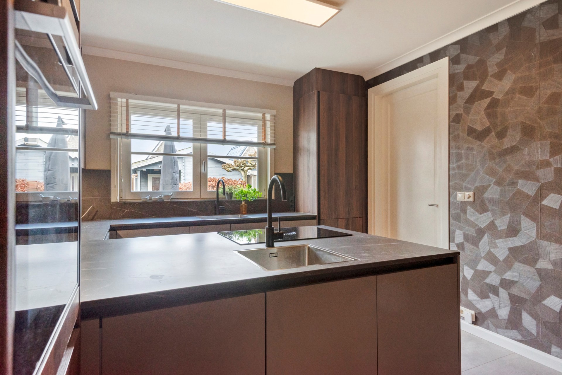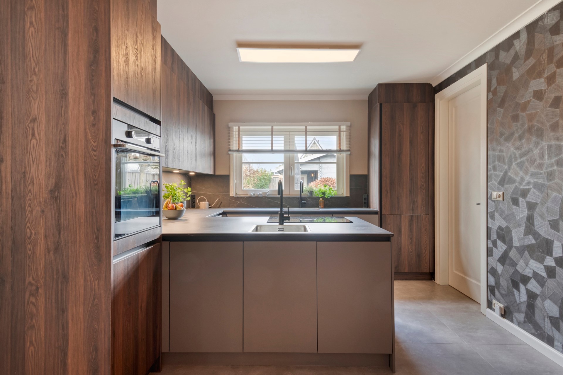 Culinaire droomplek! In deze prachtige keuken is koken elke dag een feestje. De moderne open keuken is afgewerkt met een betegelde vloer, deels behangen en deels gestucte wanden en een gestuct plafond. De in U-vorm opgestelde keuken is voorzien van een keramieken keukenblad, onder- en bovenkastjes, 2 spoelbakken ( waarvan 1 incl. Quooker), vaatwasser, combi-stoomoven en een inductie kookplaat met afzuiging (BORA). Vanuit de keuken is er toegang tot de bijkeuken.