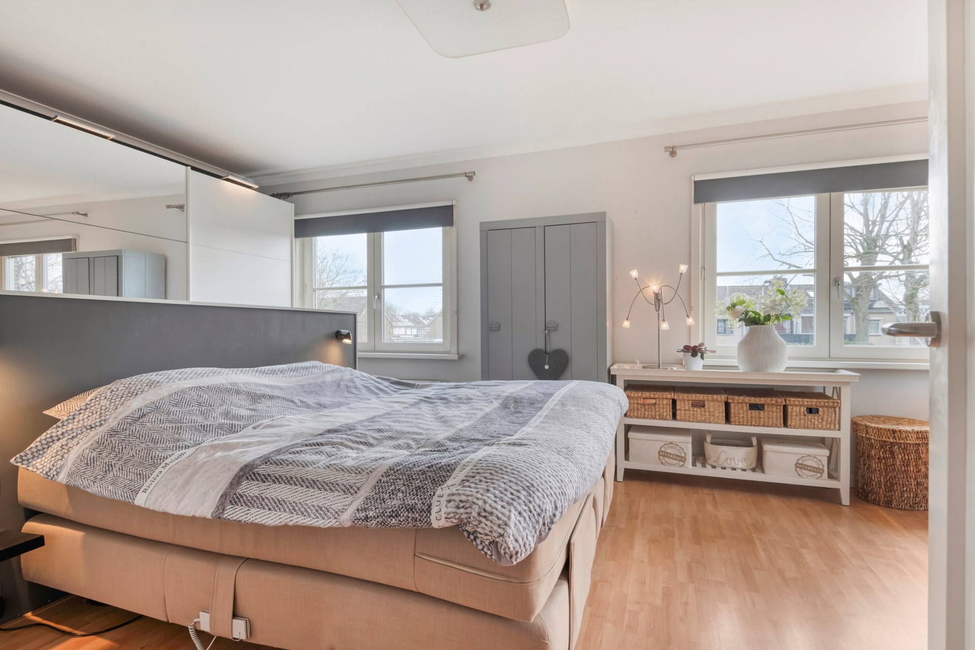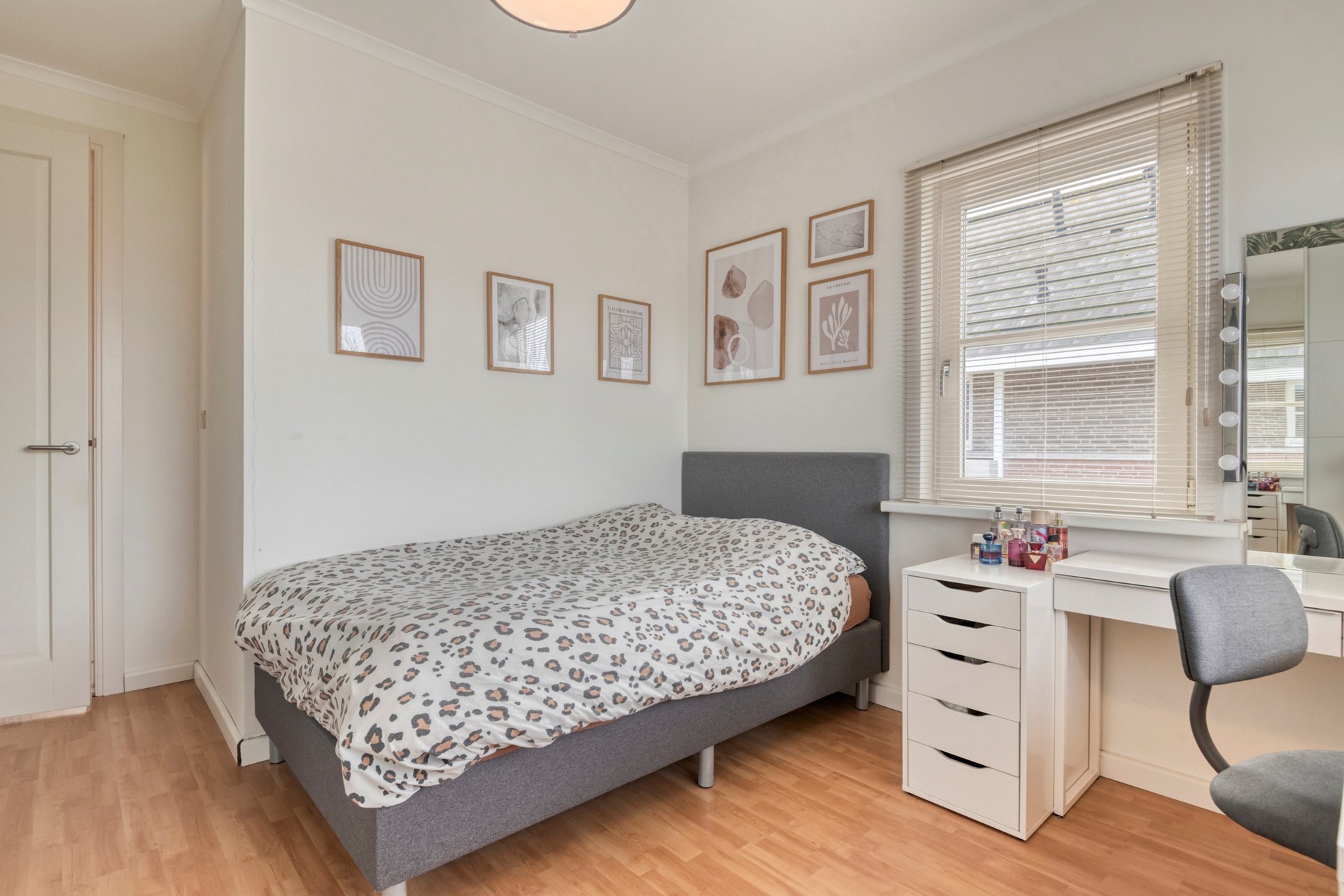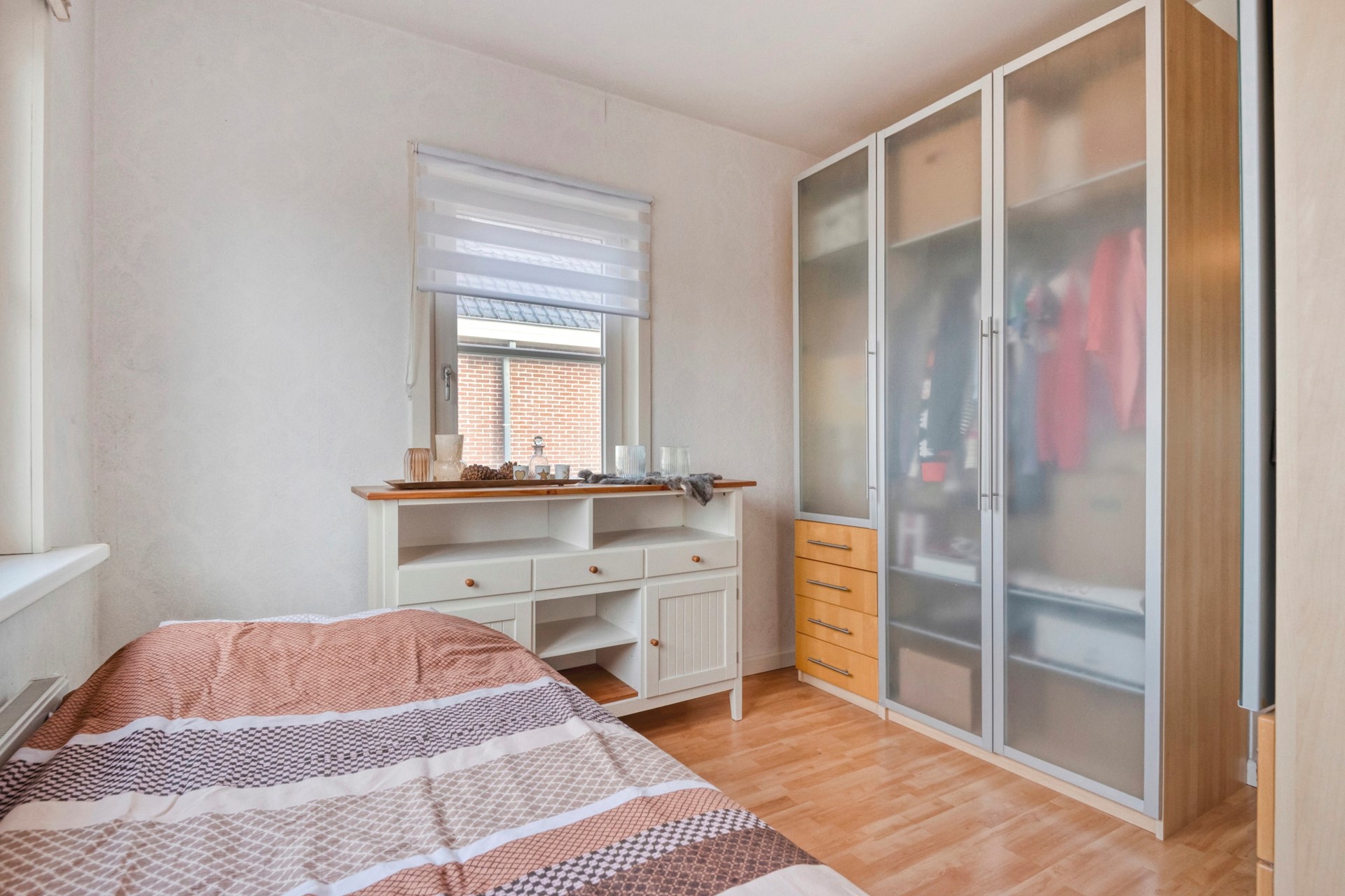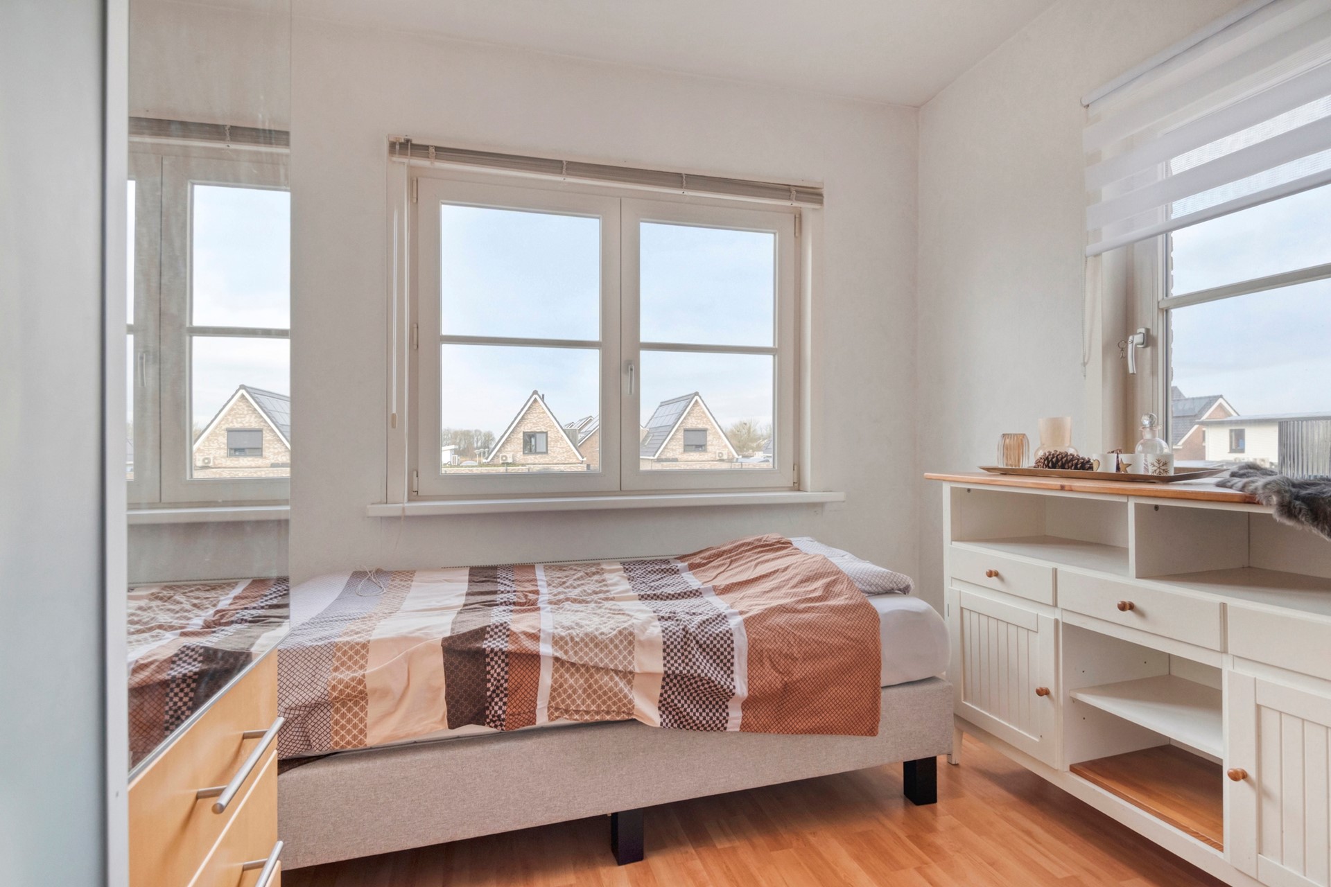 Slaapkamer 3 is afgewerkt met een laminaat vloer, gestucte wanden en een gestuct plafond.