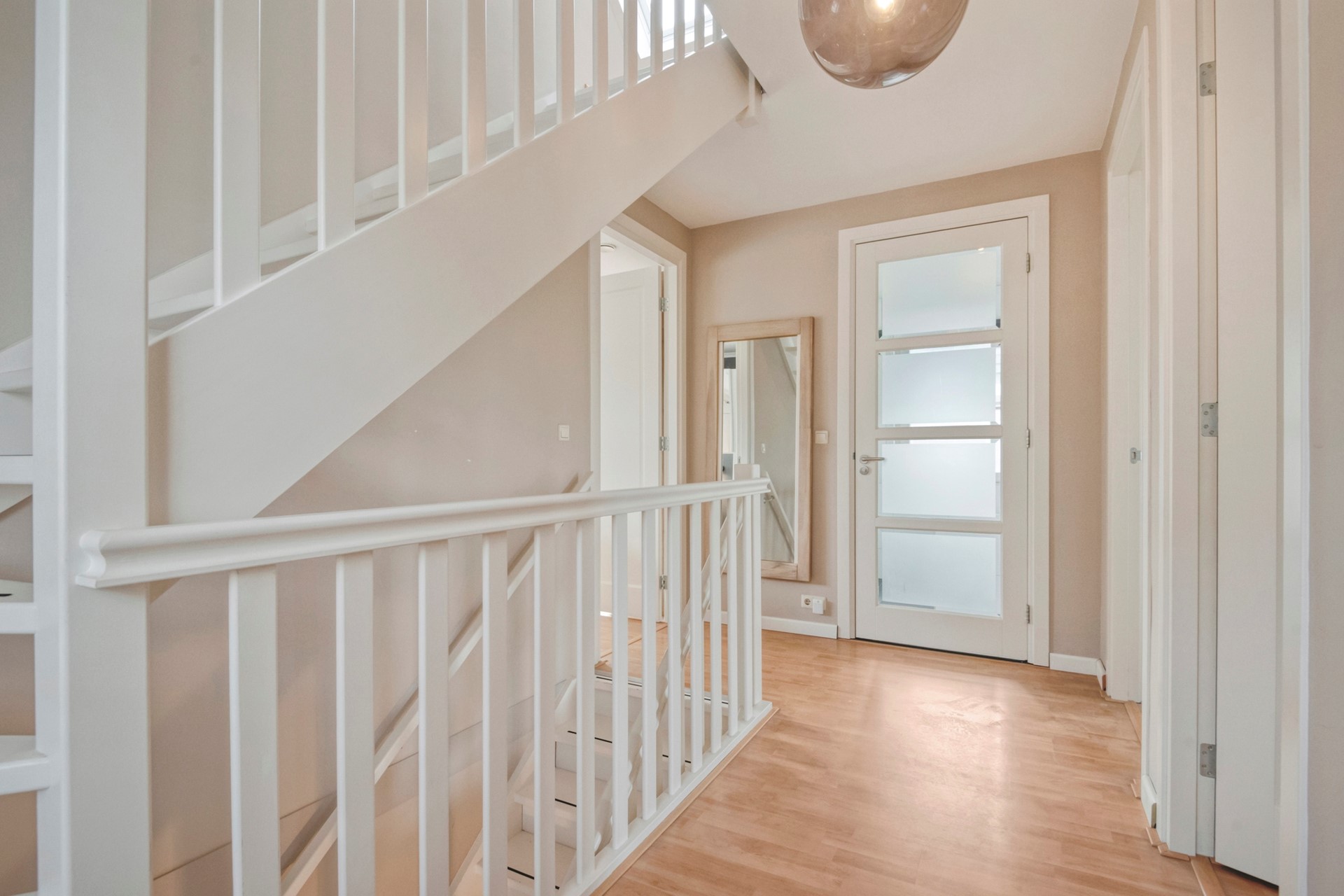 Middels de vaste trap op de begane grond bereiken jullie de overloop op de eerste verdieping. De overloop is afgewerkt met een laminaat vloer, stucwerk wanden en een spuitwerk plafond. De overloop biedt toegang tot drie slaapkamers, de badkamer, separaat toilet en tweede verdieping middels een vaste trapopgang.