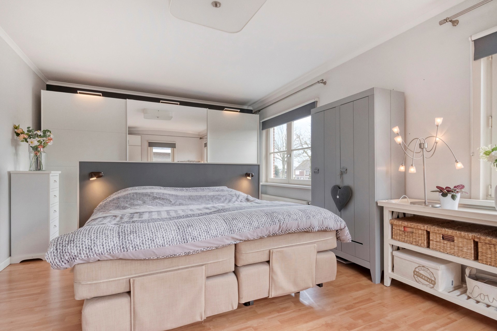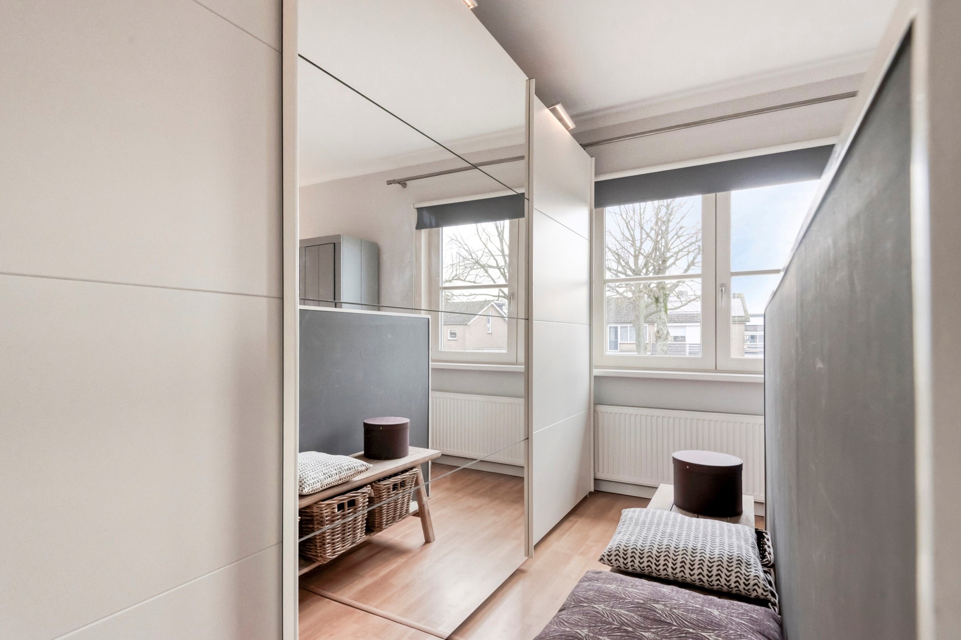 Slaapkamer 2 is afgewerkt met een laminaat vloer, deels behangen en deels gestucte wanden en een gestuct plafond.