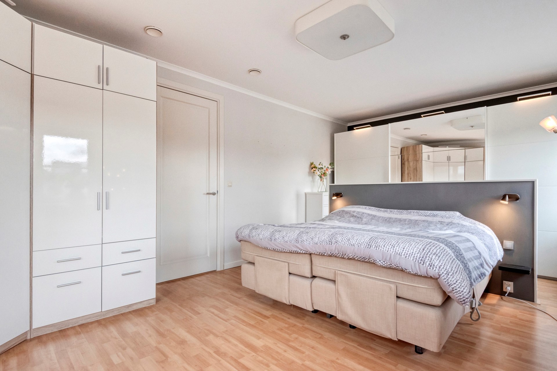 Slaapkamer 4 is afgewerkt met een laminaat vloer, gestucte wanden en een gestuct plafond.