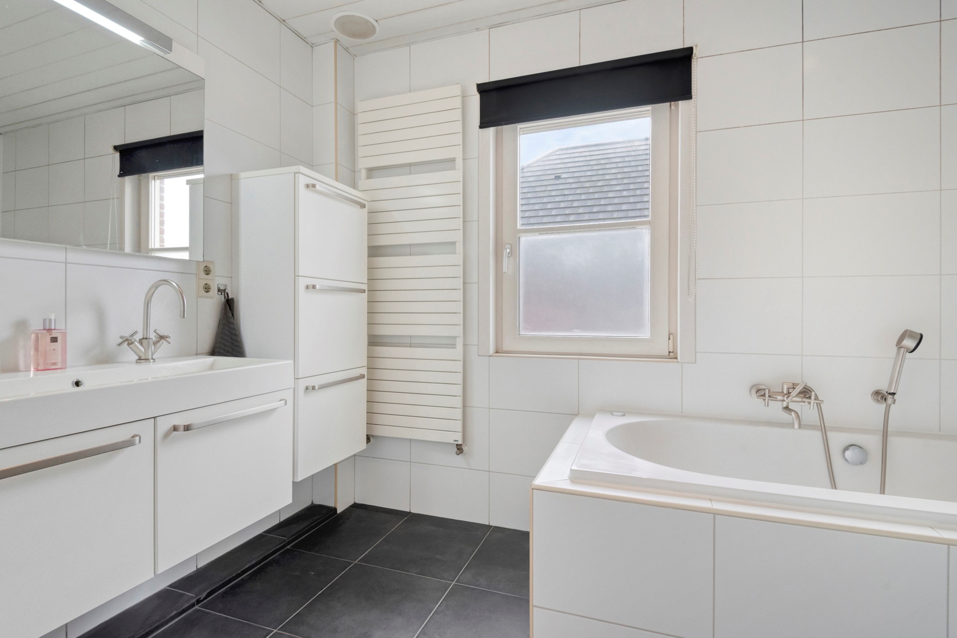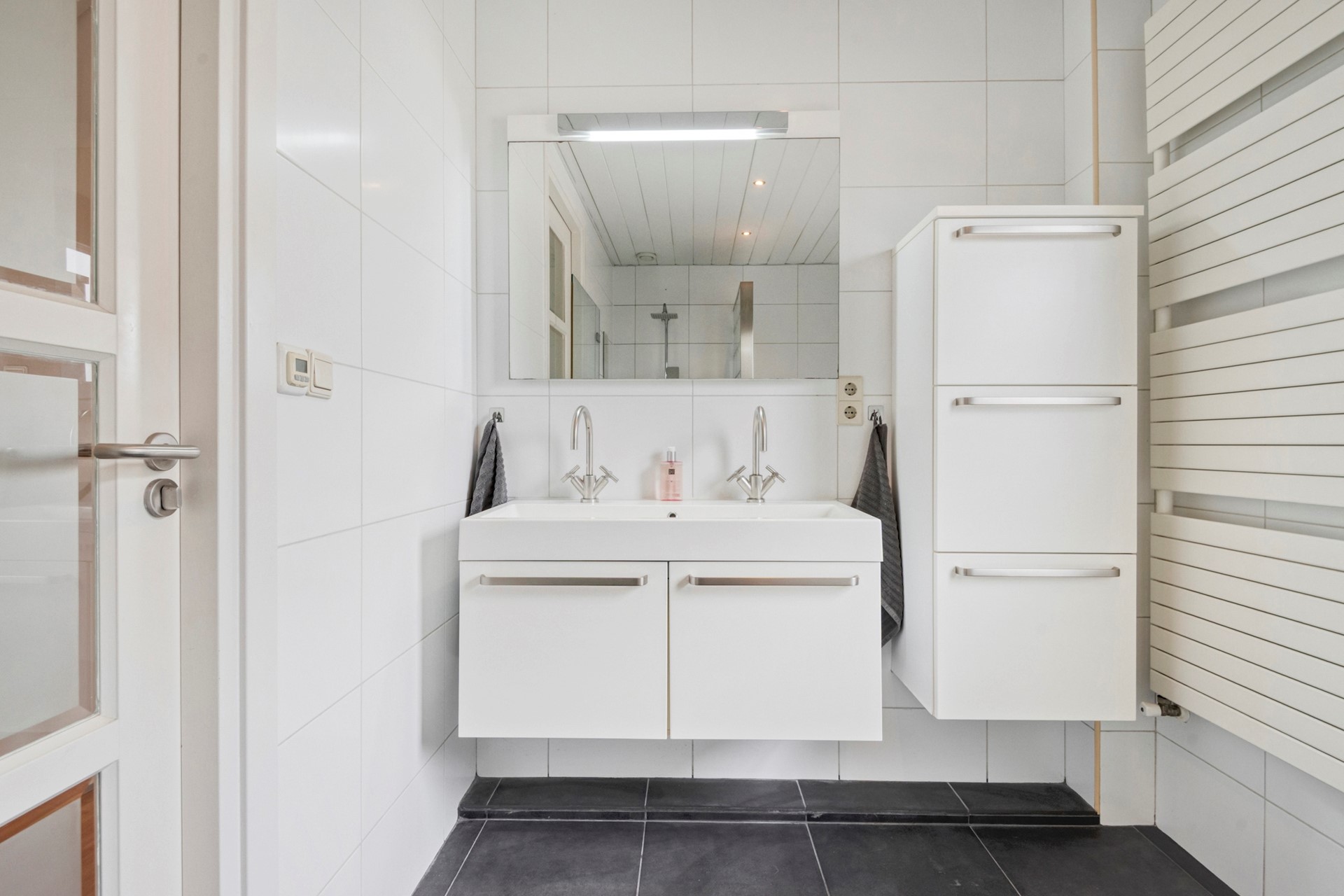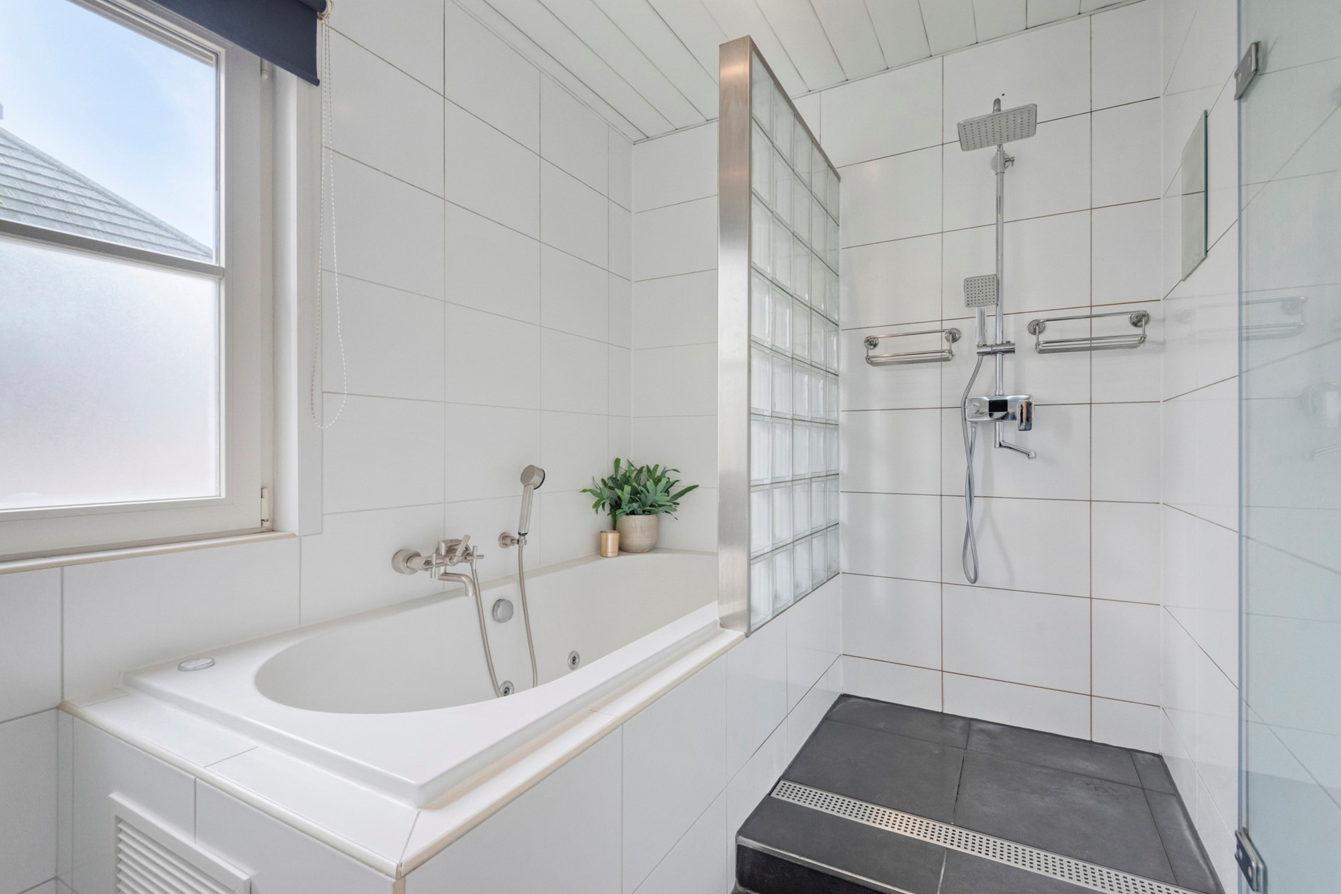 Een moment voor jezelf! Geniet van een warm bad en laad op in alle rust en comfort. De badkamer is afgewerkt met een betegelde vloer, betegelde wanden en een kunststof plafond. De badkamer is voorzien van een whirlpool, douche, dubbele wastafel, vloerverwarming en zowel natuurlijke- als mechanische ventilatie.