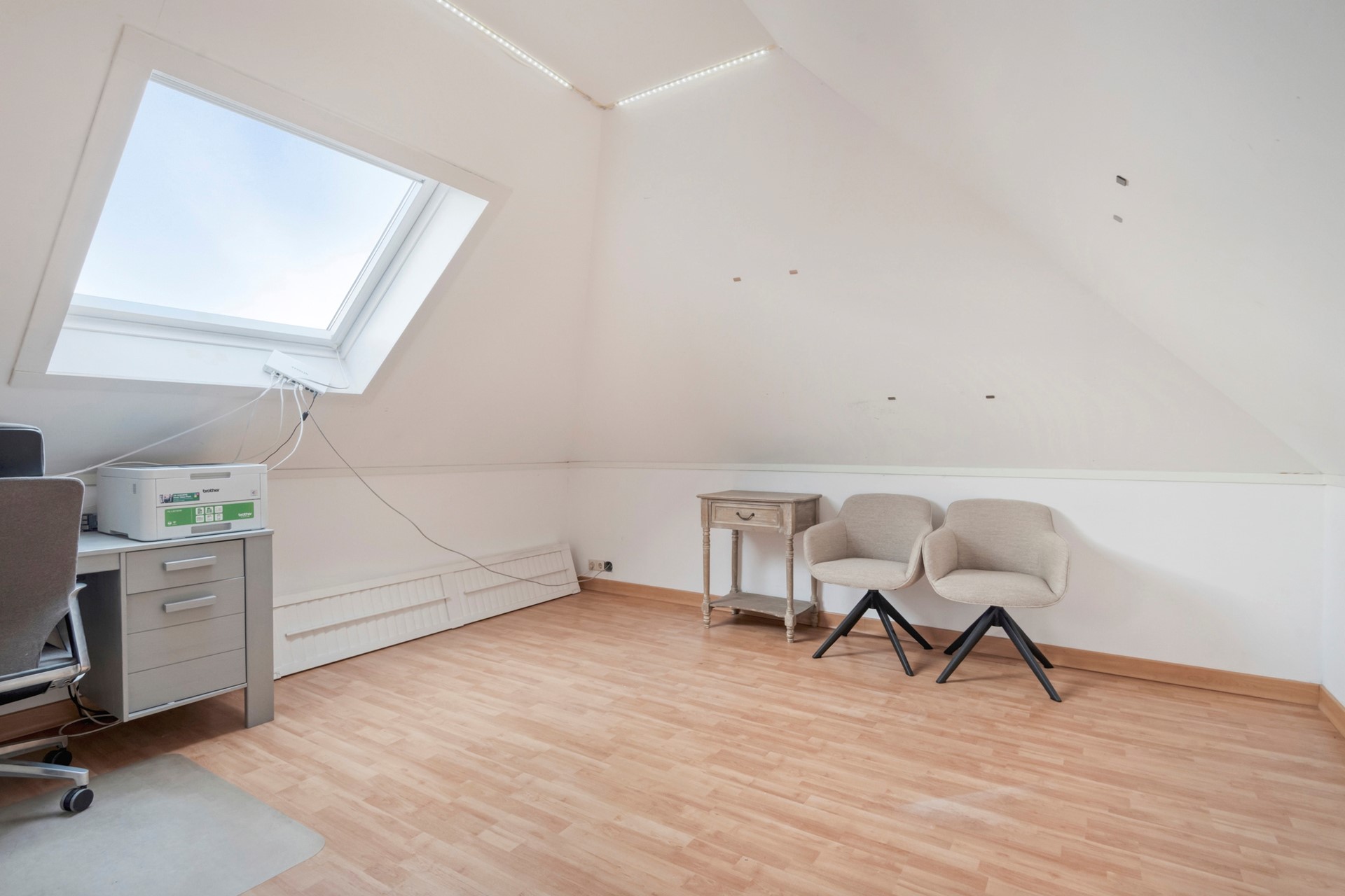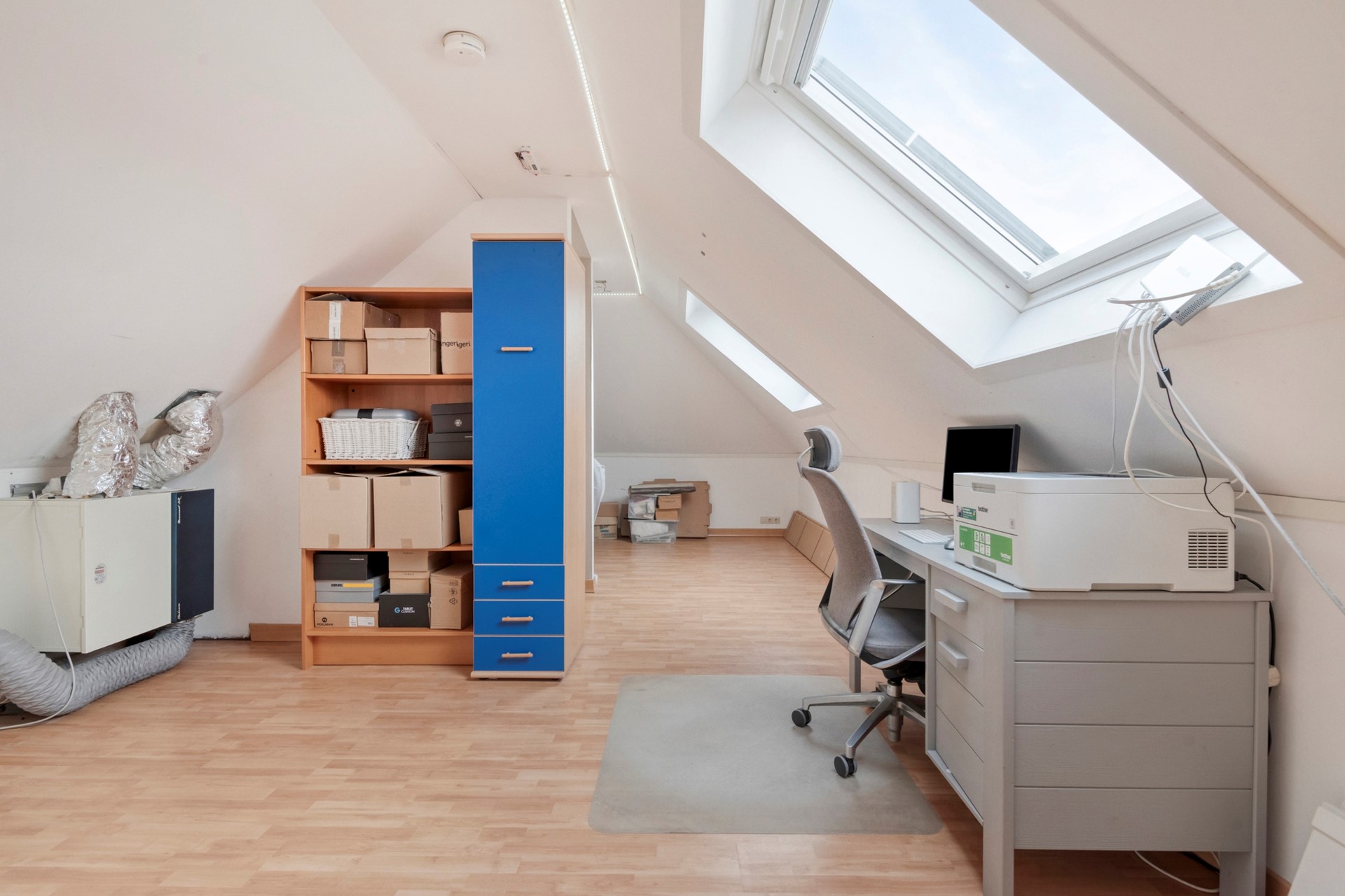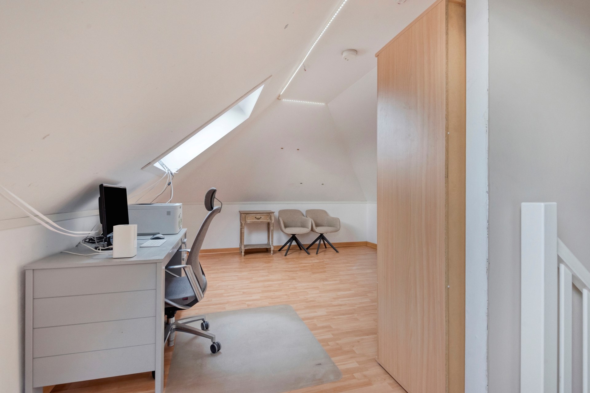 Middels de vaste trap op de eerste verdieping bereiken jullie de slaapkamer op de tweede verdieping. De slaapkamer is afgewerkt met een laminaat vloer, spuitwerk wanden en spuitwerk plafond. Vanuit hier is er toegang tot de technische ruimte met WTW-systeem. De slaapkamer is voorzien van bergruimte dat onder de kap doorloopt en 2 Velux dakramen.