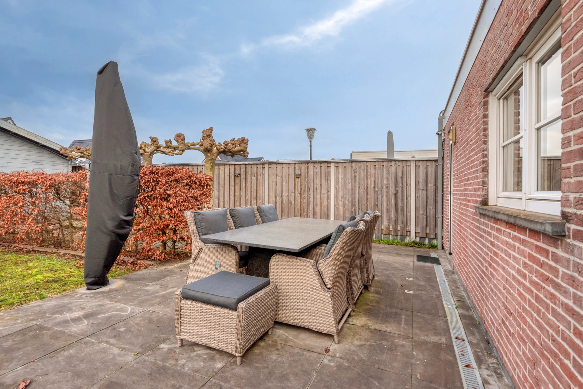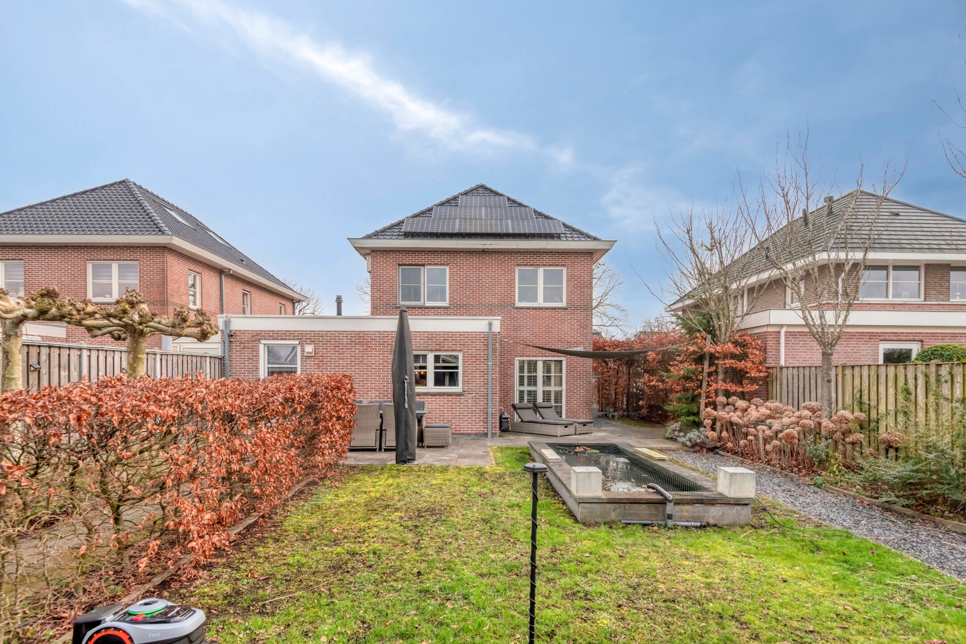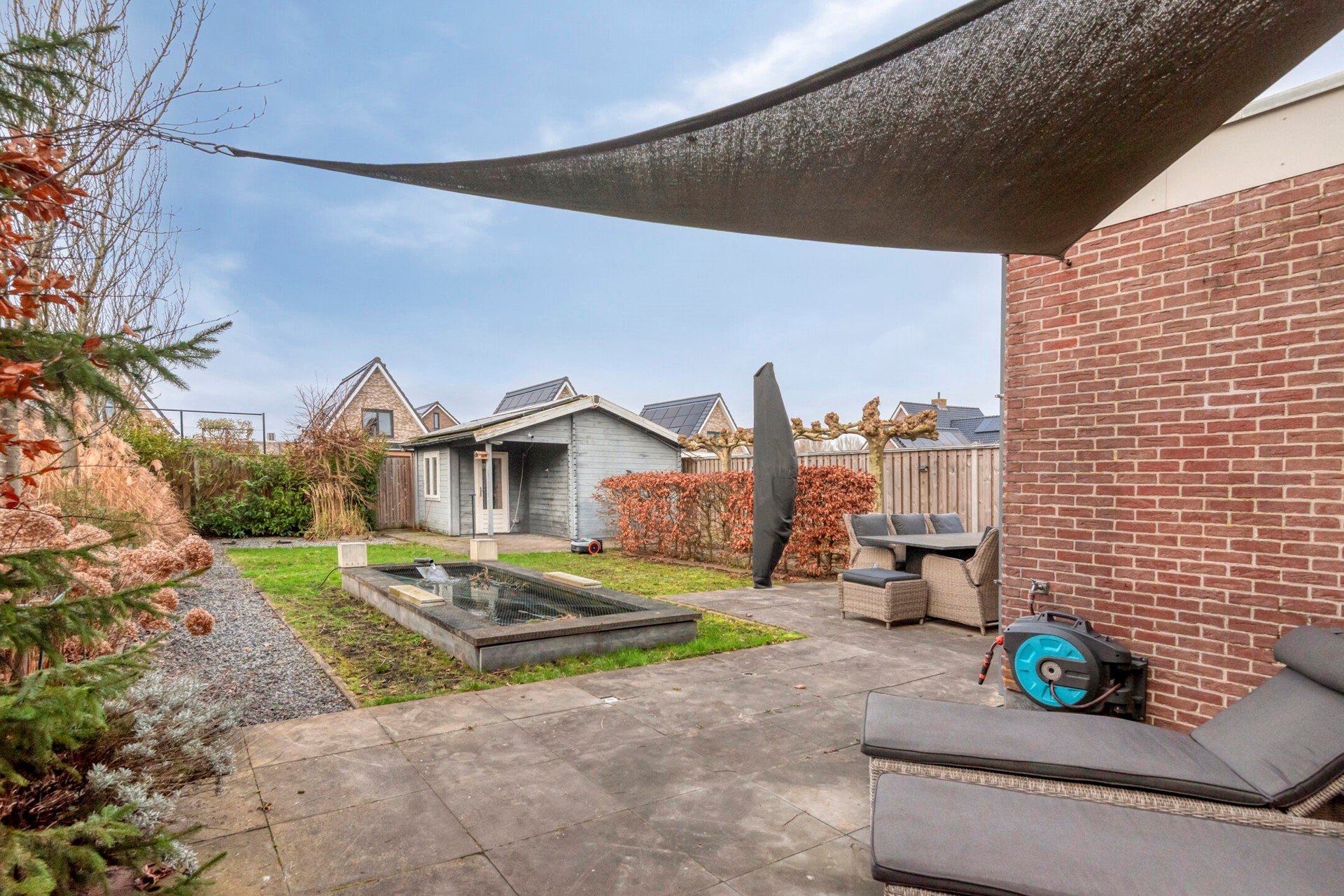 Zijn jullie op zoek naar een riante tuin waar jullie tijdens alle seizoenen optimaal kunnen genieten van het buitenleven? Check! De woning beschikt over een voor- zij- en achtertuin. Jullie zijn bourgondisch ingesteld en dat past goed bij deze achtertuin die beschikt over diverse gezellige zitplekken voor ieder moment van de dag. De achtertuin is voorzien van sierbestrating, terras, gazon, vijver en schuur.