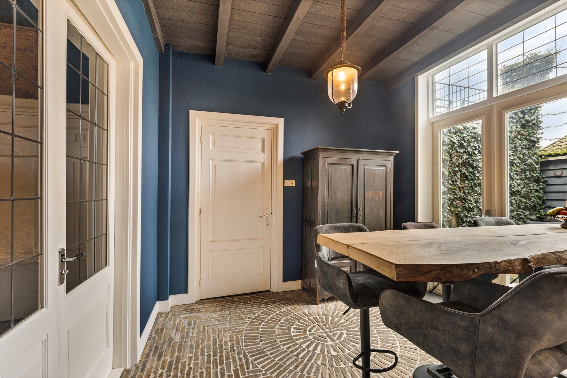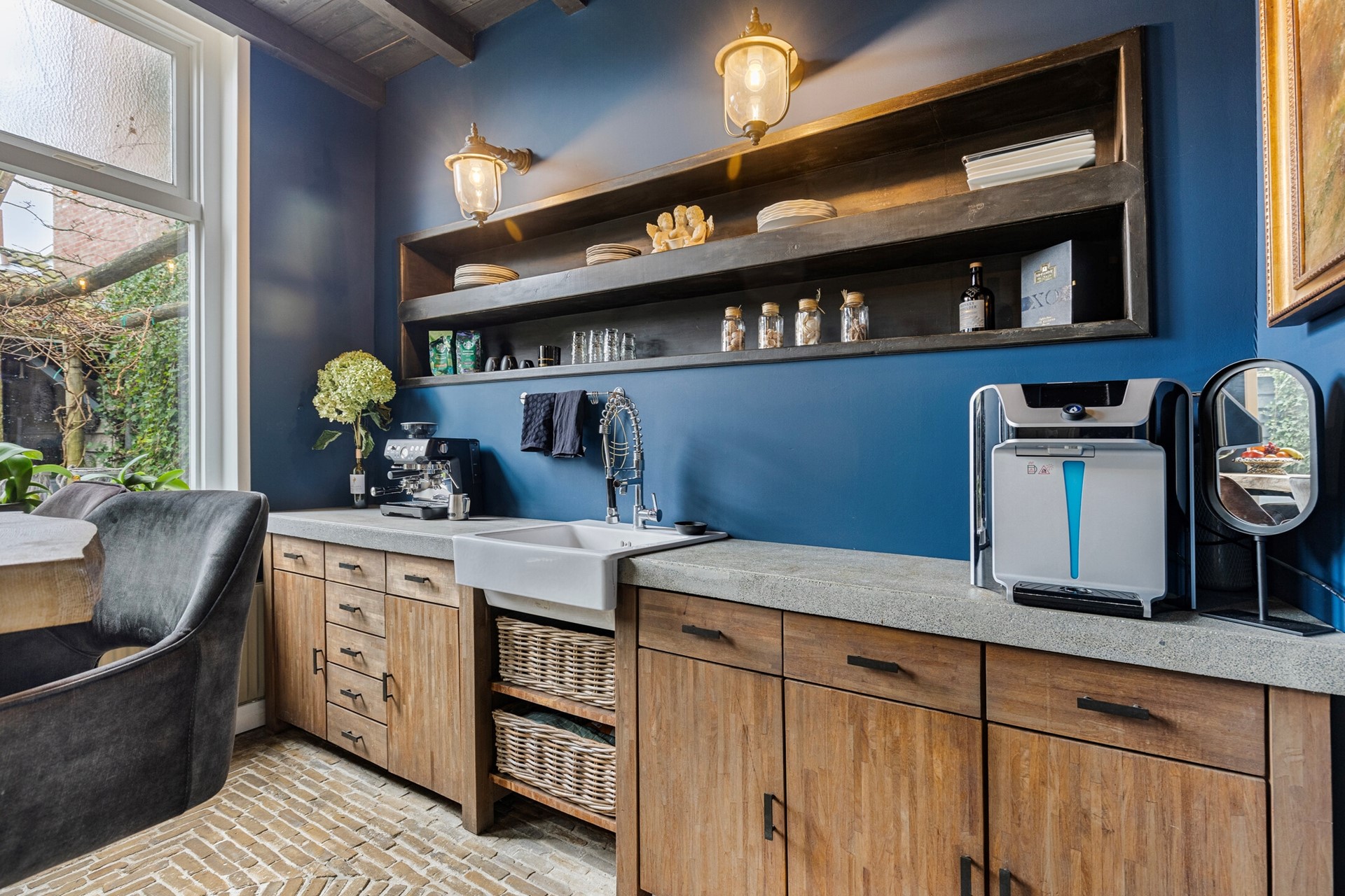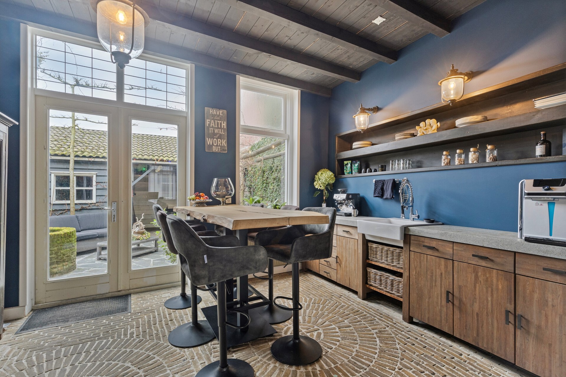 De karaktervolle tuinkamer is afgewerkt met ijsselsteentjes vloer (afkomstig uit de eigen kelder), gestucte wanden en een houten balken plafond. De kamer is voorzien van een recht opgesteld werkblad met natuurstenenblad, onderkastjes en spoelbak. Of je nu lekker binnen zit met een kopje koffie of de deuren opent naar de tuin, hier ervaar je rust, natuur en een heerlijk gevoel van vrijheid! De tuinkamer biedt toegang tot de achtertuin middels openslaande tuindeuren met glas in lood details.
