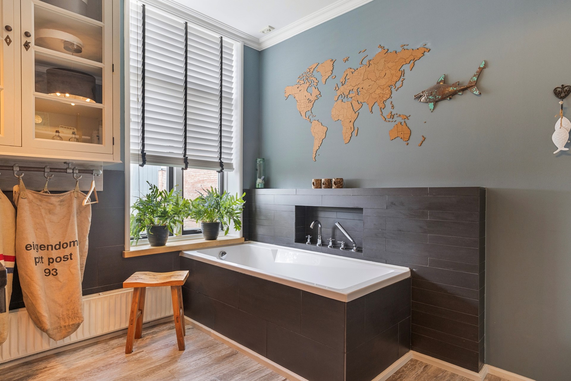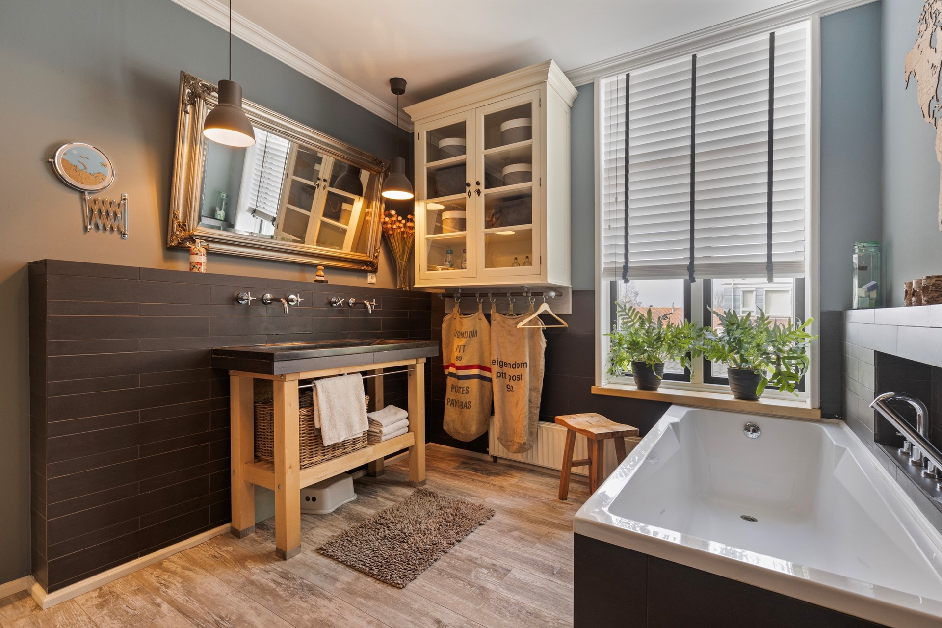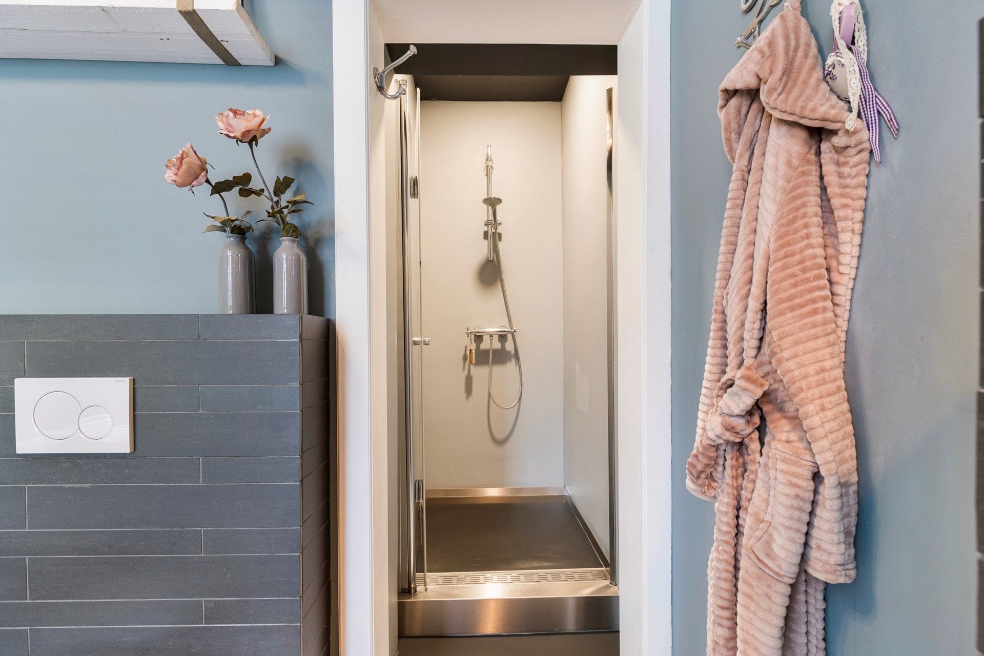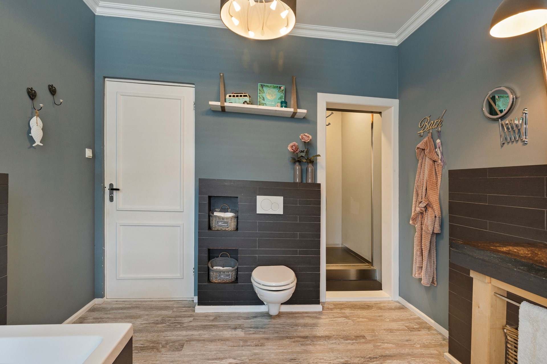 De riante badkamer is afgewerkt met een laminaat vloer, deels betegeld en deels gestucte wanden en een gestuct plafond. De badkamer is voorzien van een 2e toilet, ligbad, douche, wastafelmeubel, radiator en natuurlijke- en mechanische ventilatie. Laat je zorgen wegdrijven in het ligbad, dé plek om volledig te ontspannen en genieten van een moment voor jezelf.