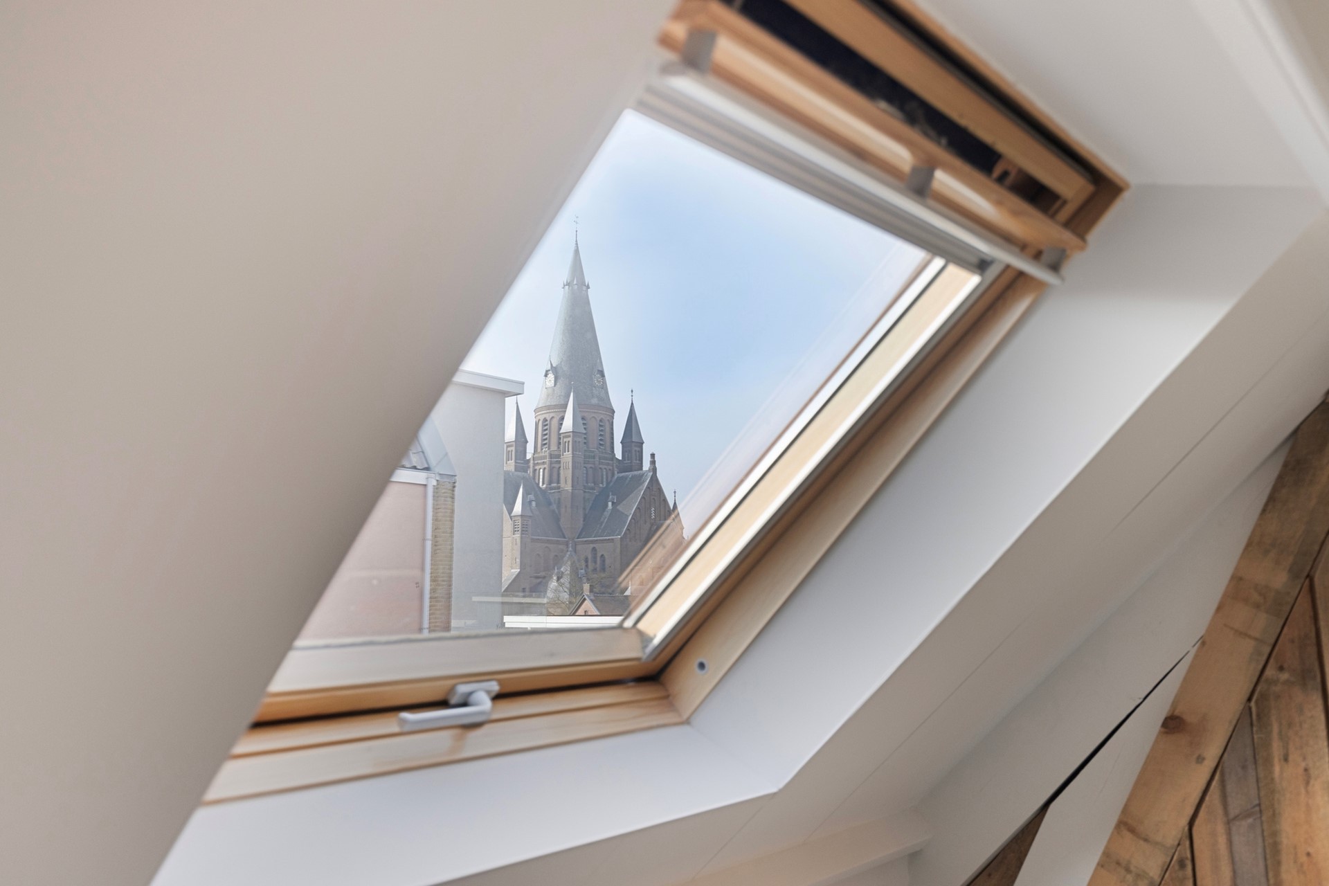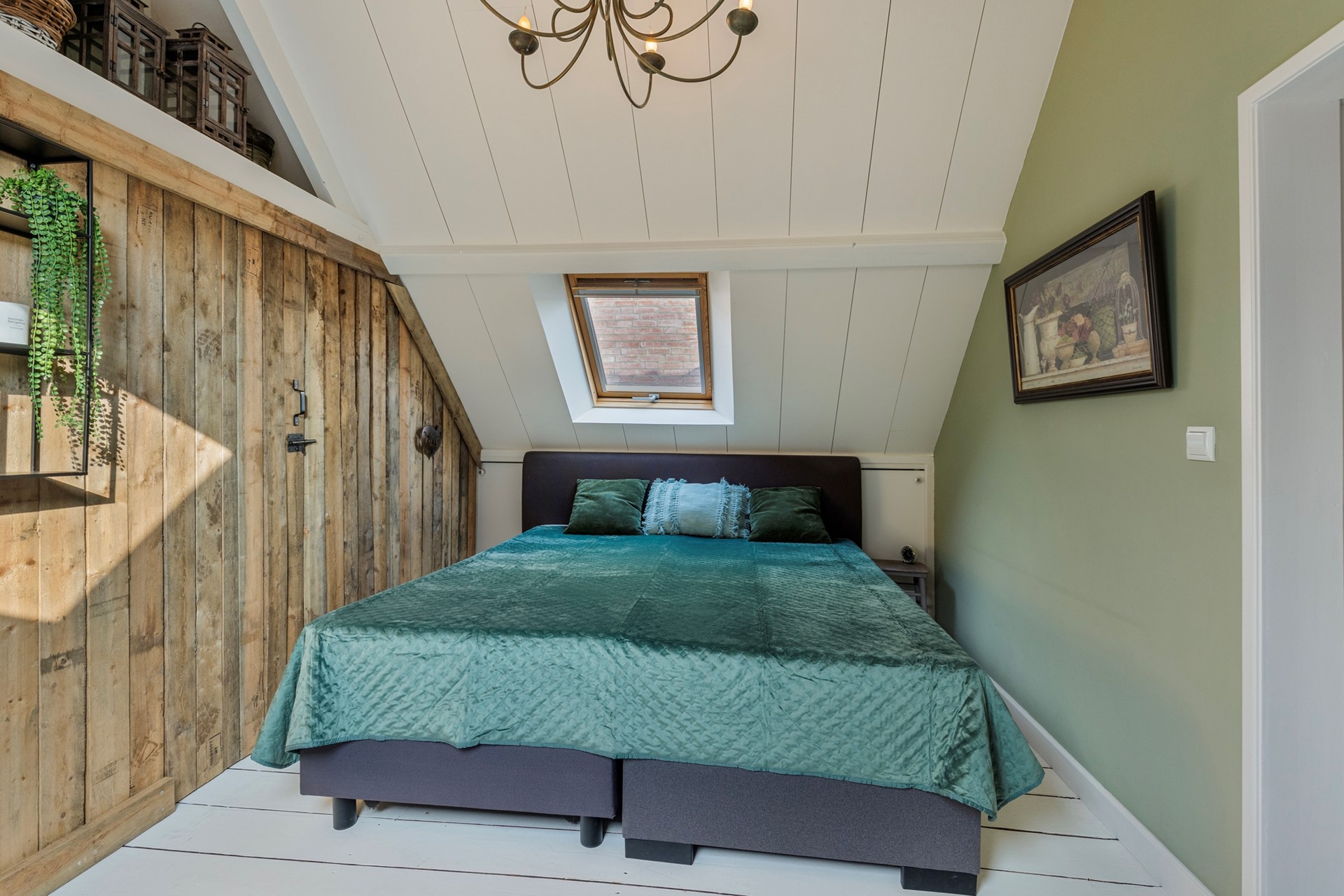Slaapkamer 2 is afgewerkt met een houten vloer, gestucte wanden en een houten balken plafond. De slaapkamer is voorzien van knieschotkasten, twee dakramen en biedt toegang tot de inloopkast.