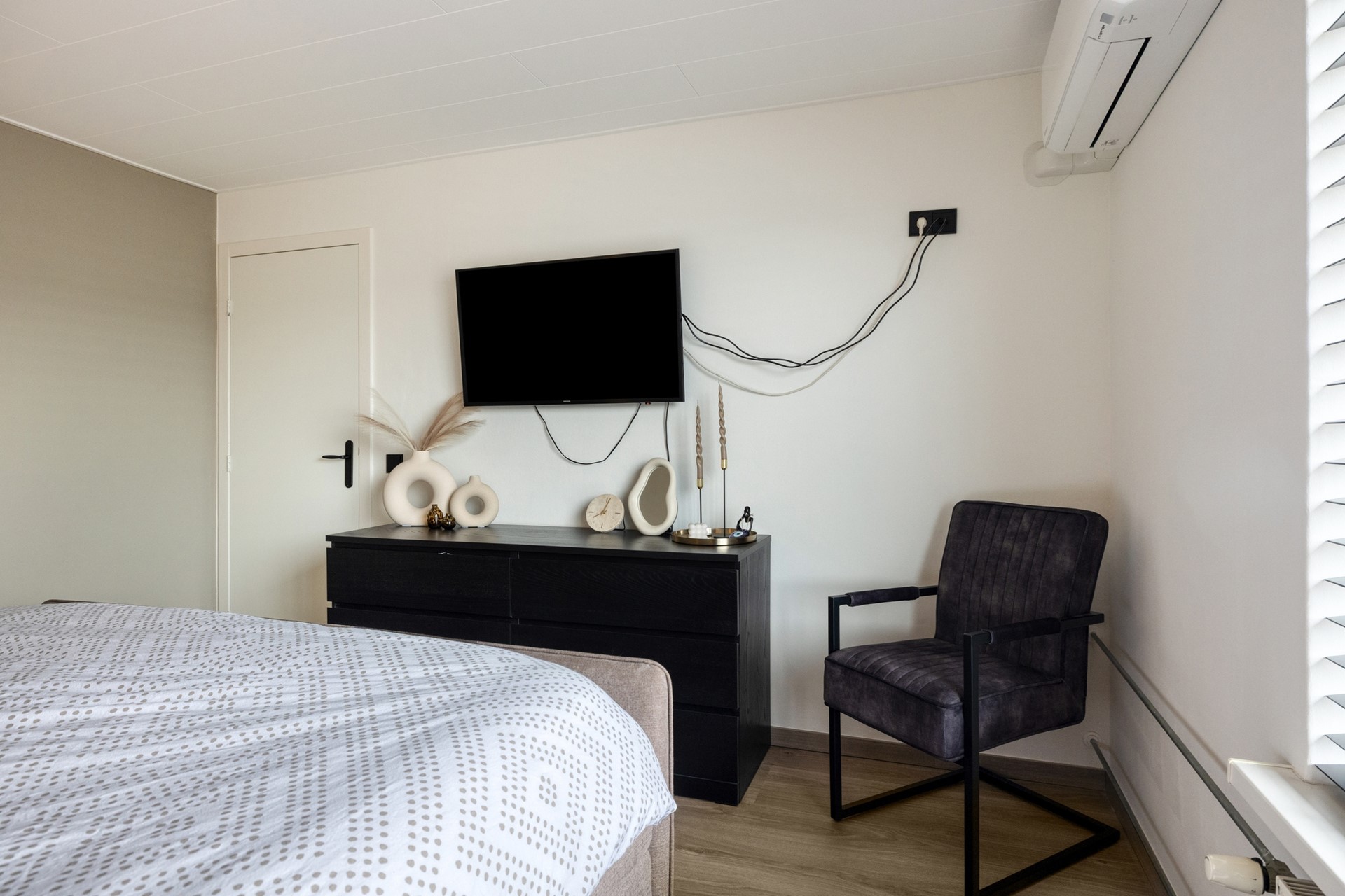 Slaapkamer 1 is afgewerkt met een laminaat vloer, gestucte wanden en plafondplaten. De slaapkamer is voorzien van airconditioning.