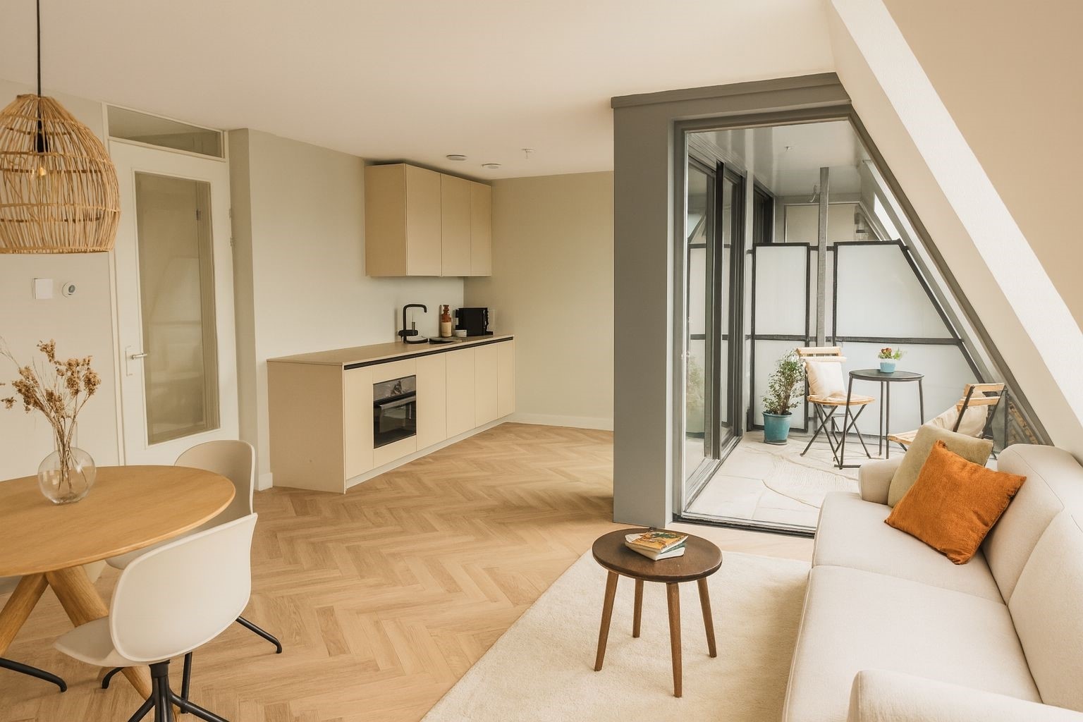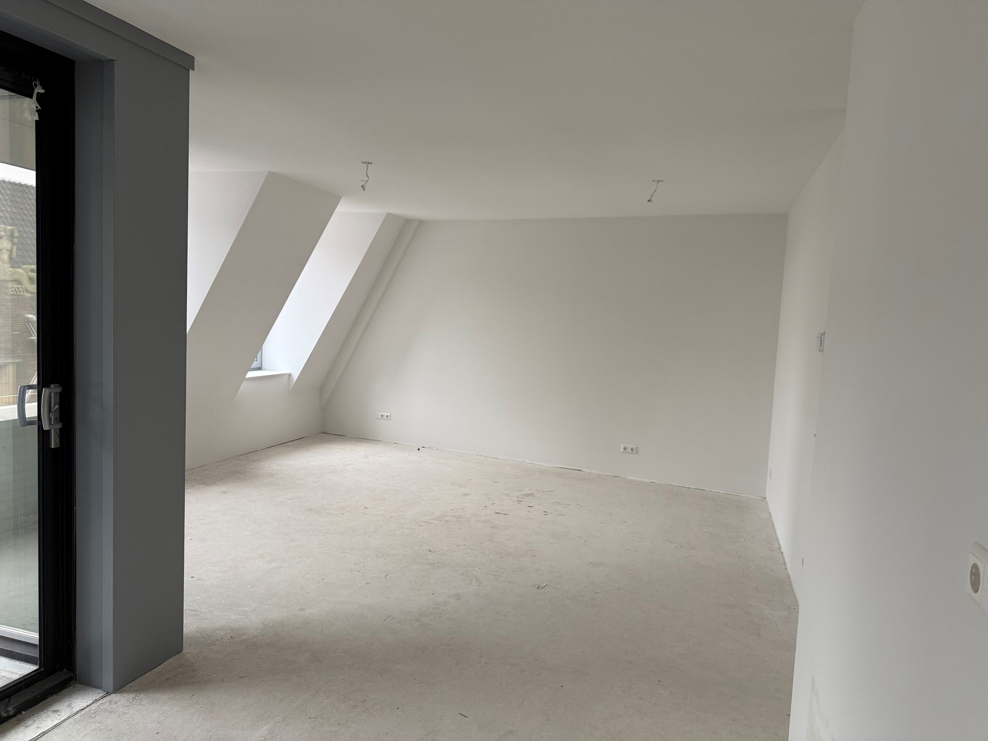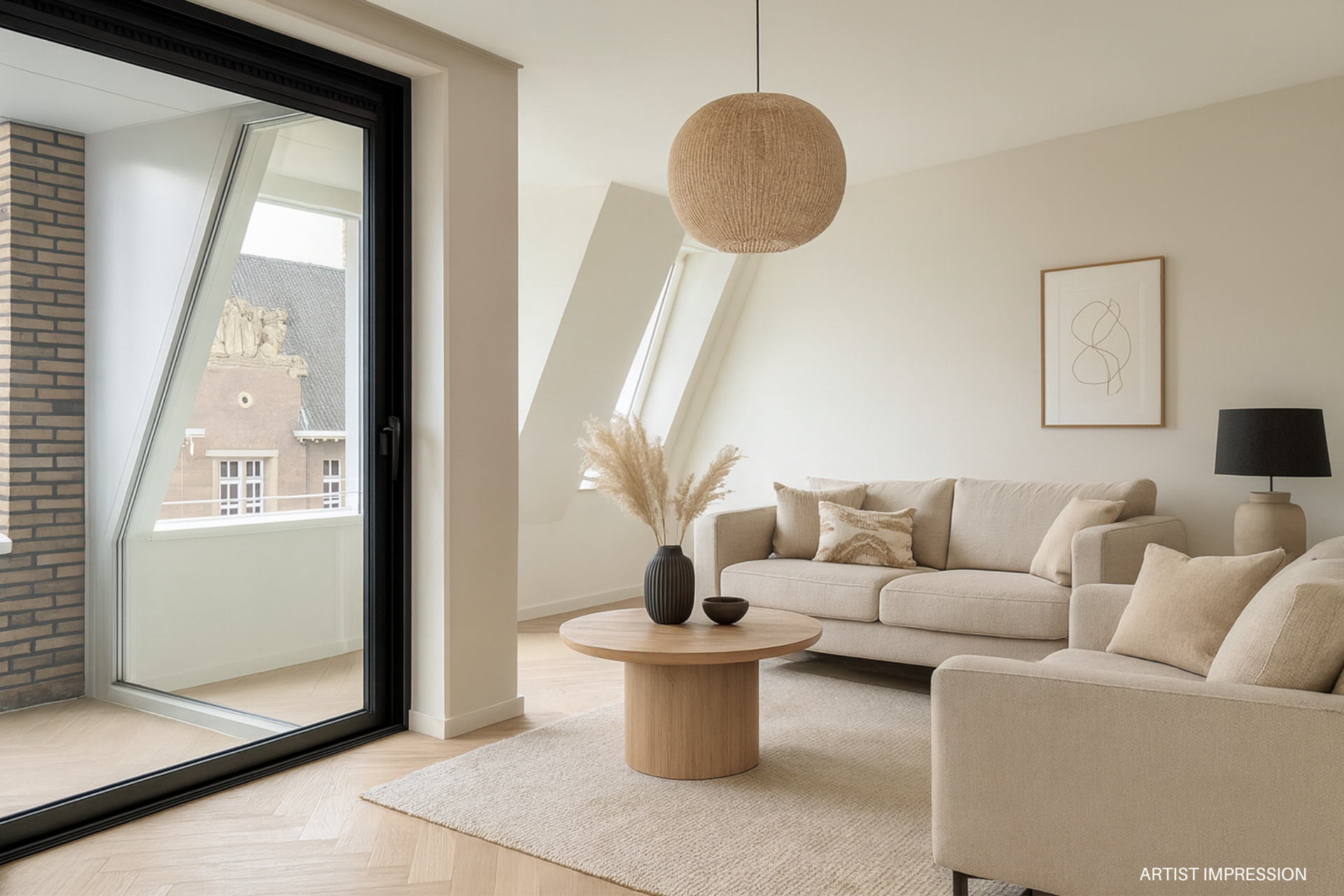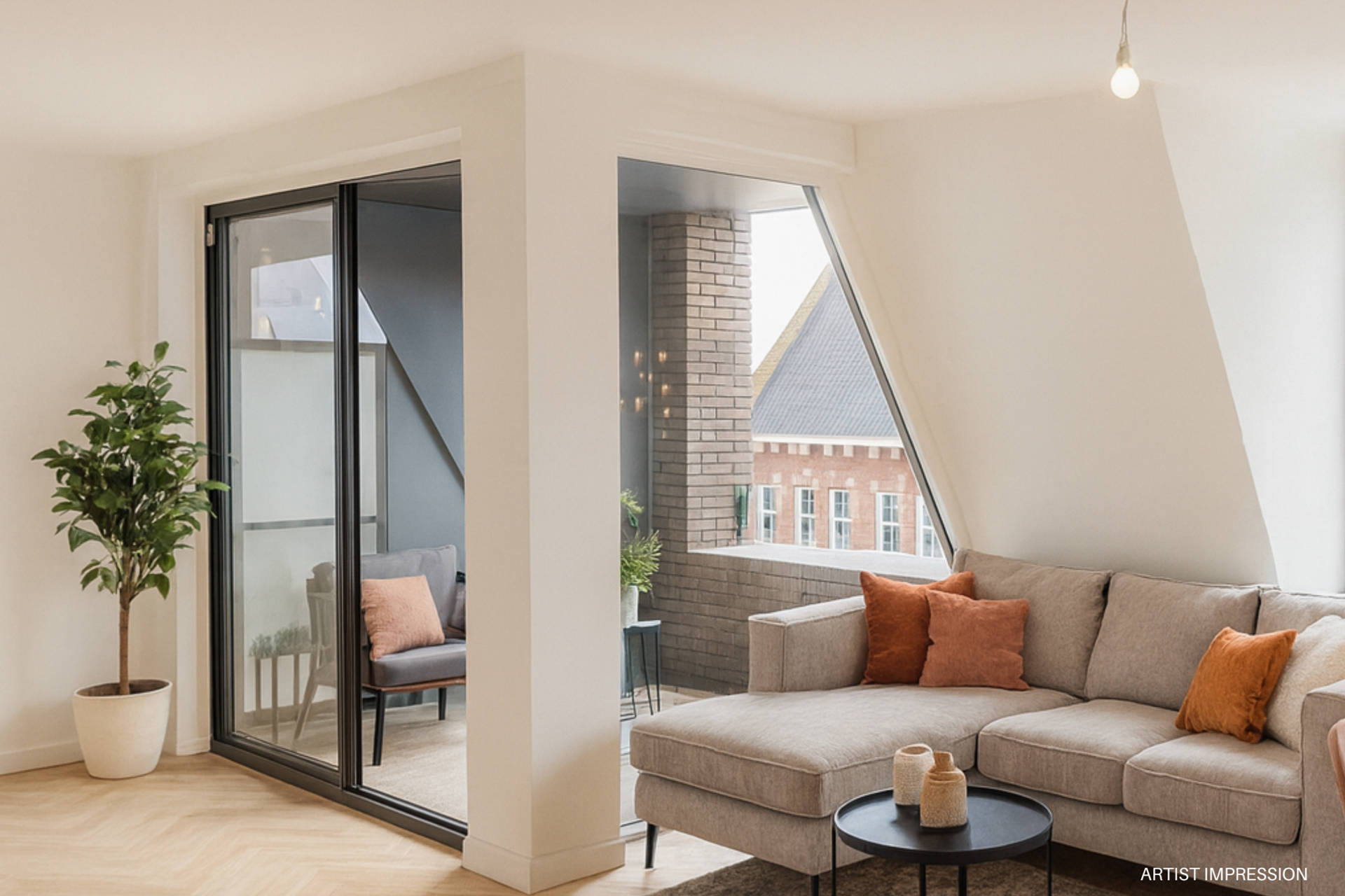 De living geeft ruimte voor een moderne open keuken en een lichte woonkamer. Het appartement wordt zonder keuken aangeboden, de afbeeldingen betreffen een impressie.