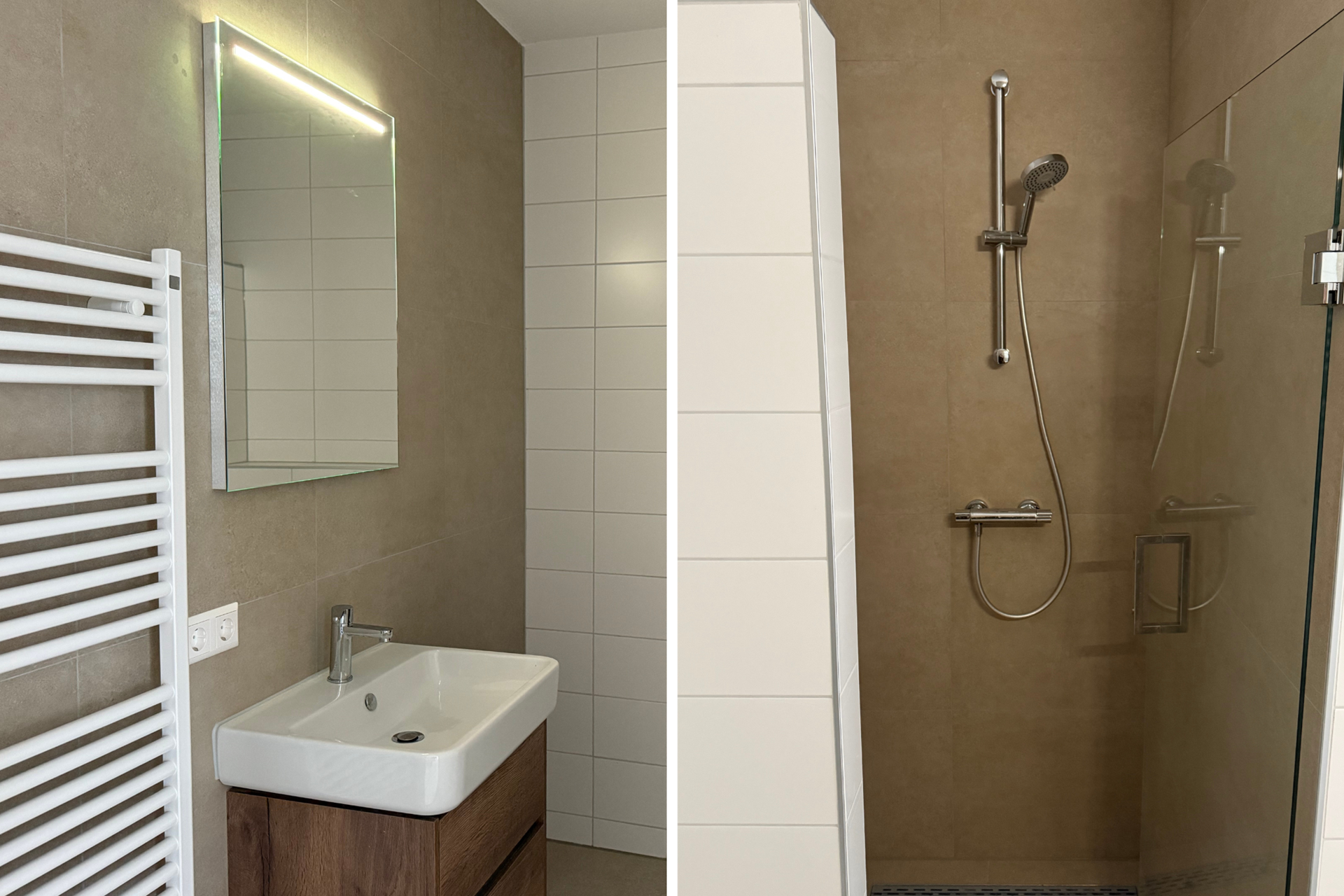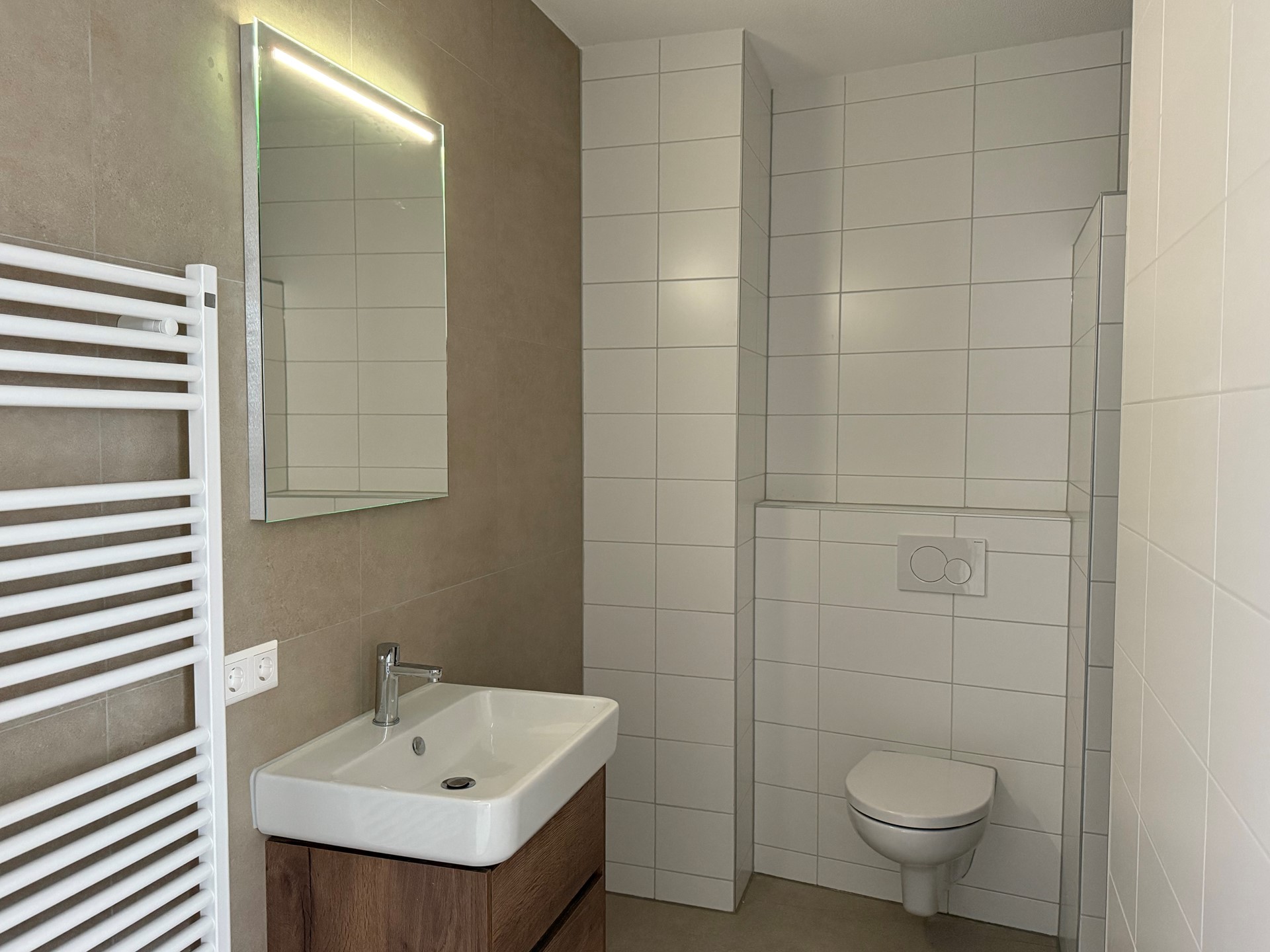 De badkamer is voorzien van een wastafelmeubel met spiegel, toilet en riante inloopdouche.