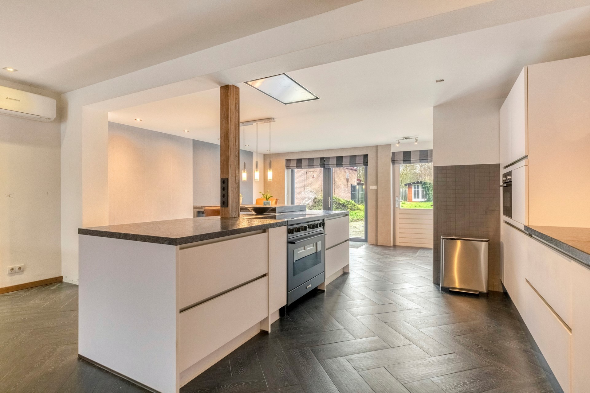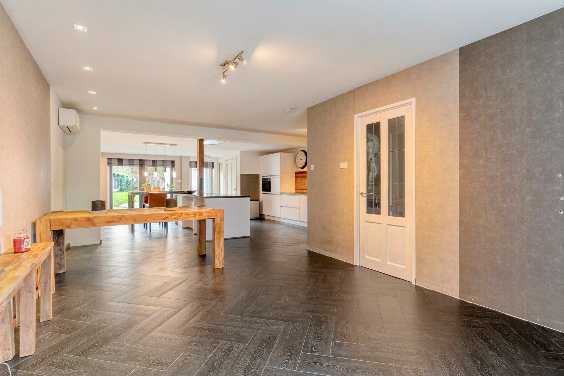 De ruime, uitgebouwde woonkamer beschikt over veel lichtinval door de riante raampartijen. De woonkamer is afgewerkt met een betegelde vloer (incl. vloerverwarming) en beschikt tevens over een airconditioning voor optimaal wooncomfort gedurende alle seizoenen. Vanuit de woonkamer is er een directe verbinding met de open keuken.