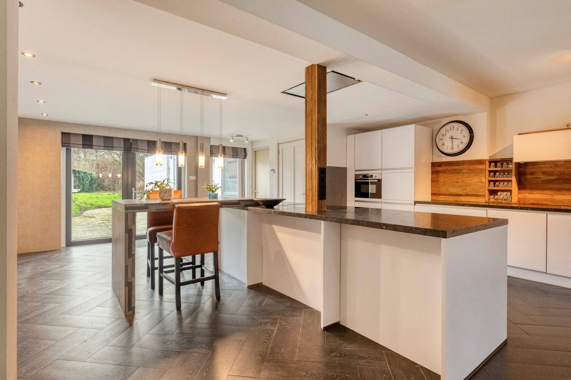 De open woonkeuken is het hart van de woning waar eten, koken en gezelligheid samenkomen! De woonkeuken is afgewerkt met een vloer met vloerverwarming. De recht opgestelde keukeninrichting is voorzien van o.a. onder- en bovenkastjes, spoelbak, combimagnetron, vaatwasser en een kookeiland compleet met een SMEG fornuis inductiekookplaat en afzuiging. Vanuit de keuken is er toegang tot de garage, bergkast en tuin middels openslaande tuindeuren.