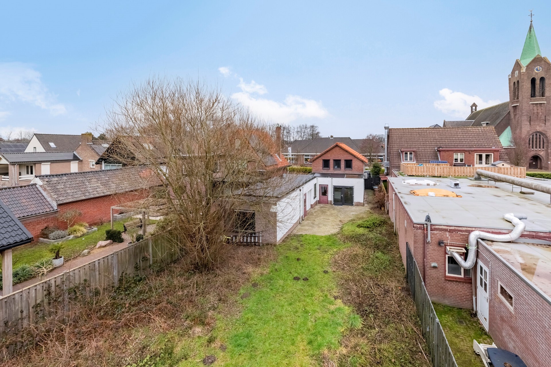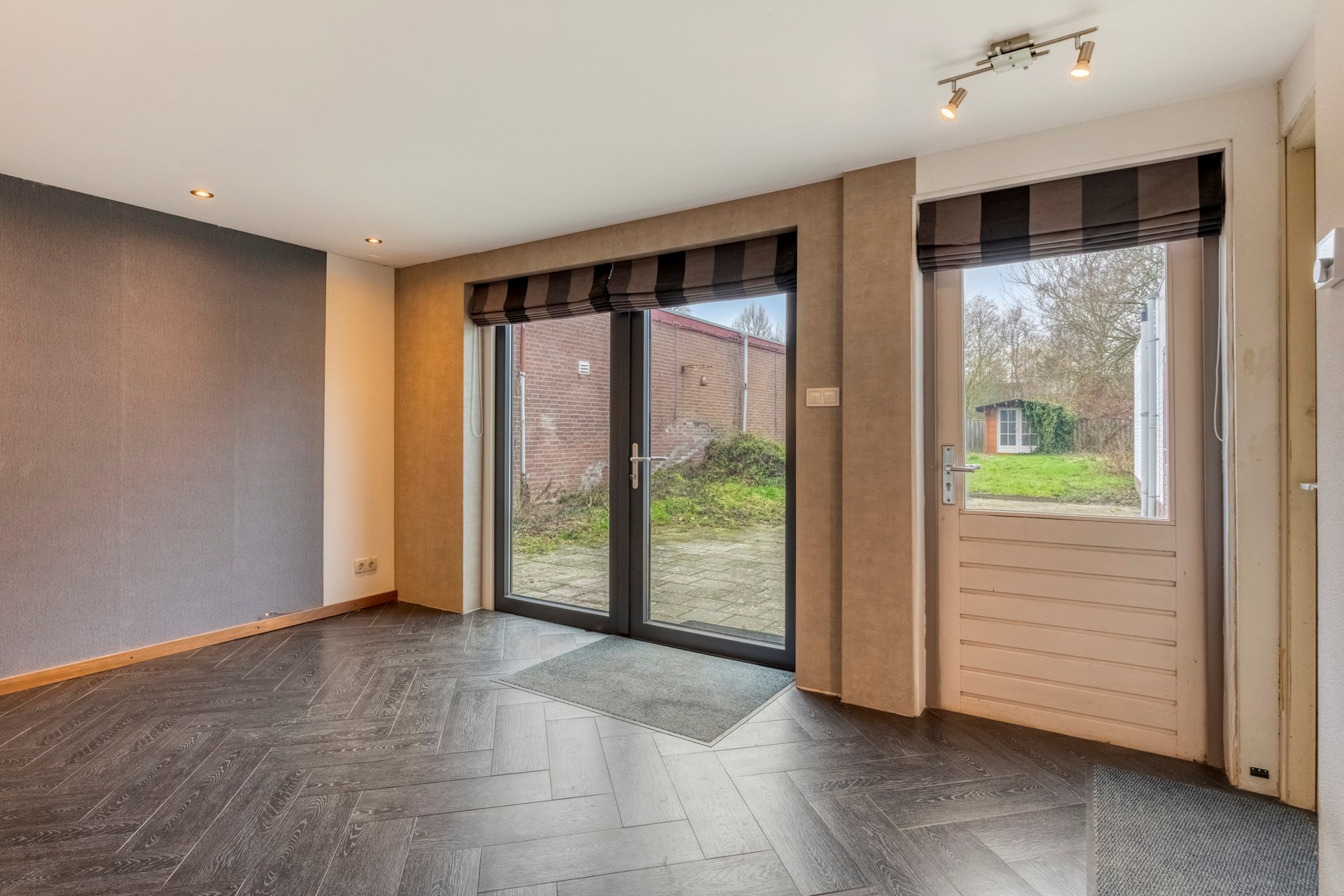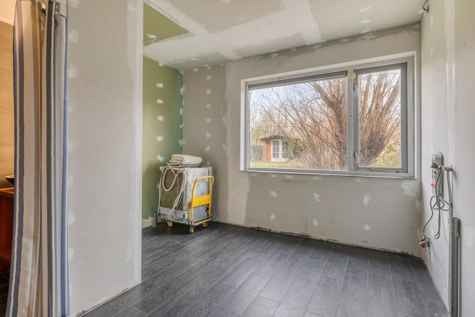 Aan de achterzijde bevindt zich een bewoonbaar te maken gedeelte met een slaapkamer, badkamer, toilet en stookruimte – ideaal voor gasten, een mantelzorgwoning of een werk-/praktijkruimte aan huis. De kamer op de begane grond is afgewerkt met een betegelde vloer voorzien van vloerverwarming en behangklare muren en plafond. De kamer biedt toegang tot een badkamer, separaat toilet voorzien van fonteintje en de stookruimte met de CV-Ketel (Remeha Ace-Matic 40C CW5 2025) .