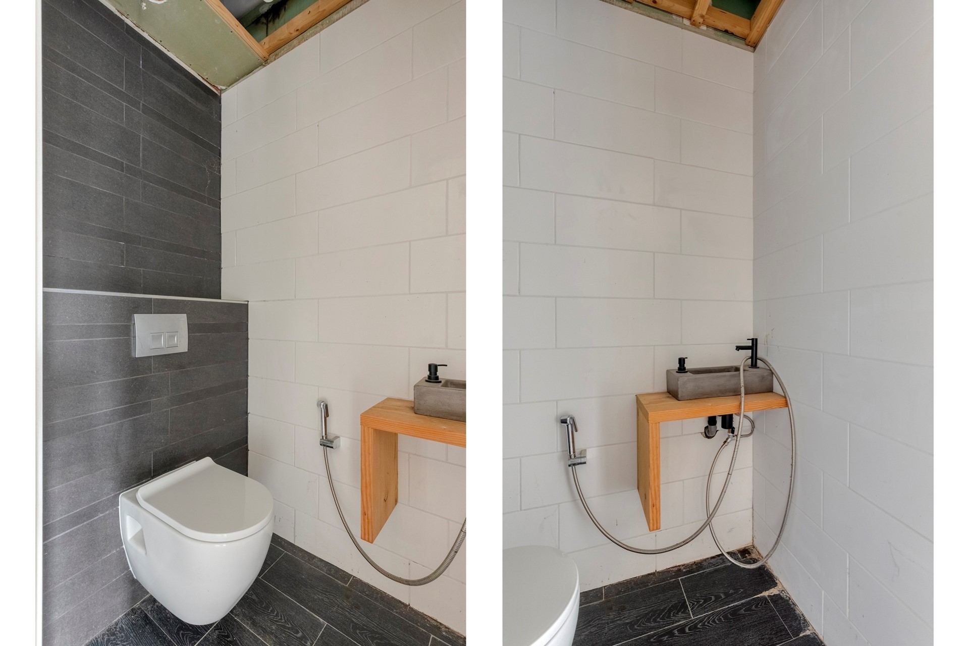 De moderne badkamer (2025) is afgewerkt met een betegelde vloer, betegelde wanden en een spuitwerk plafond. De badkamer is voorzien van een inloopdouche, toilet, wastafelmeubel met twee wastafels, spiegel met verlichting en verwarming en vloer- en wandverwarming.