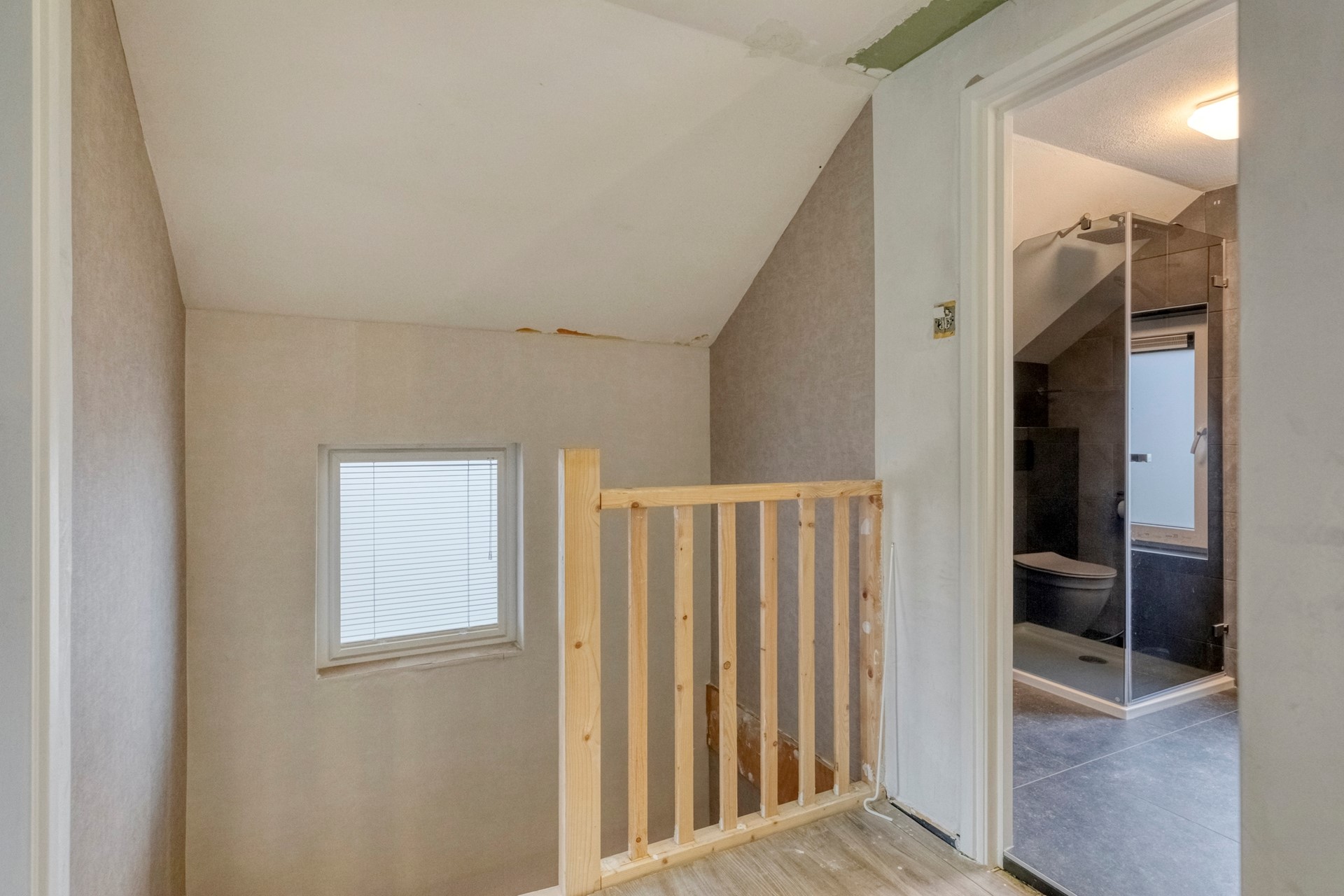 Middels de vaste trap (bij de voordeur gesitueerd) bereiken jullie de overloop op de eerste verdieping. De overloop is afgewerkt met vloerbedekking, behangklare wanden en plafond. De overloop biedt toegang tot drie slaapkamers, een bergkast, een badkamer en de bergzolder middels een vlizotrap