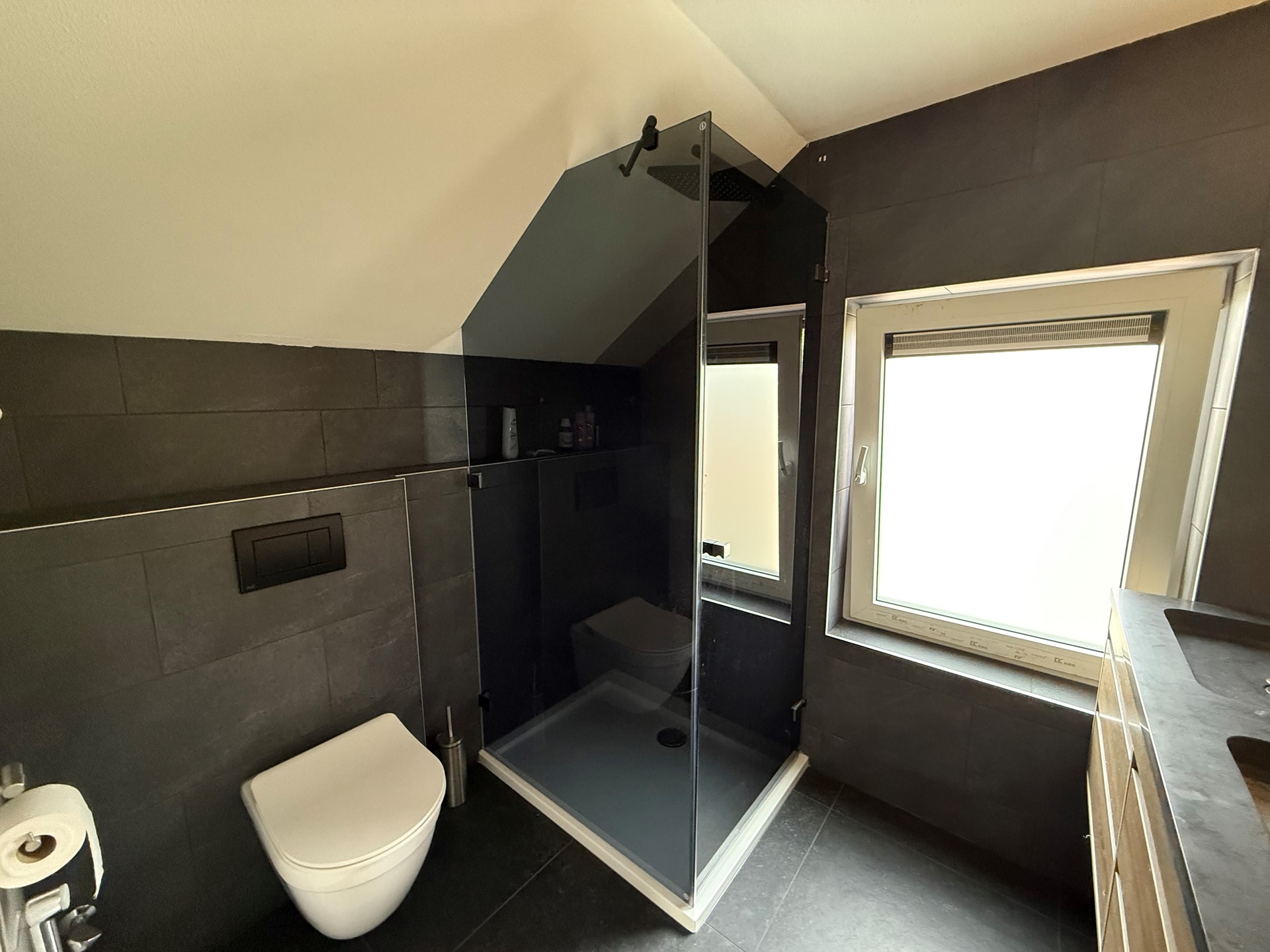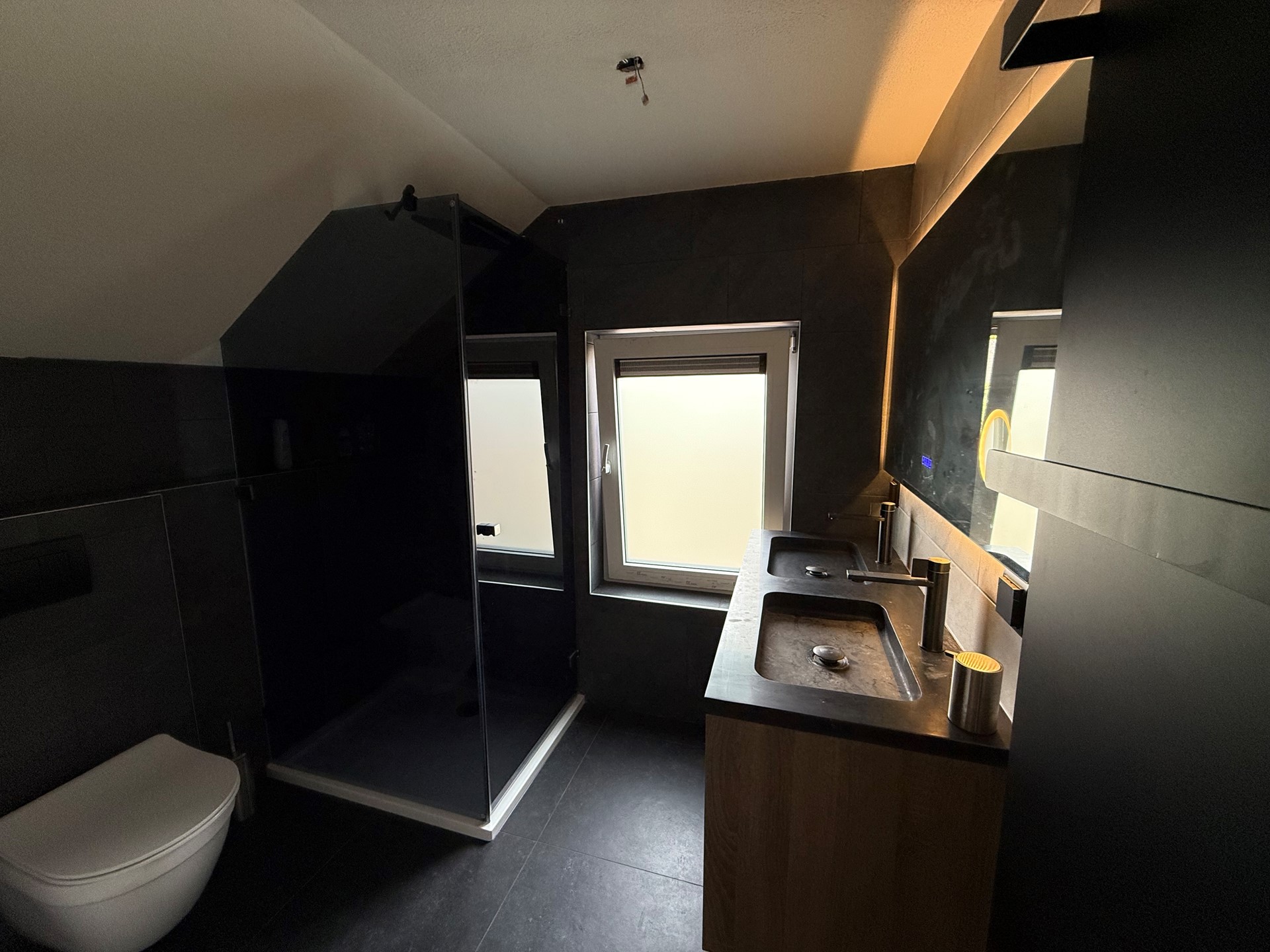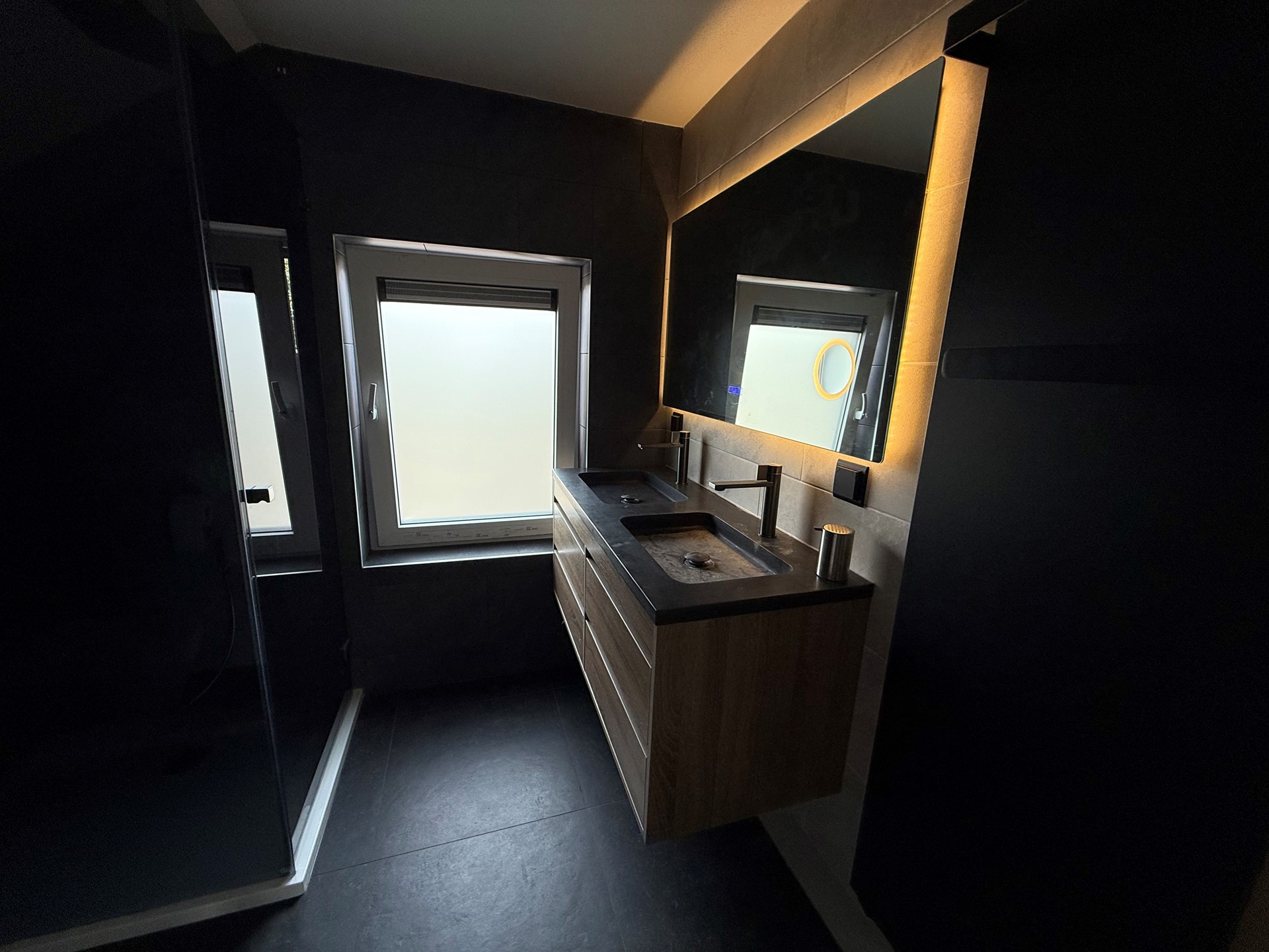 De moderne badkamer (2025) is afgewerkt met een betegelde vloer, betegelde wanden en een spuitwerk plafond. De badkamer is voorzien van een inloopdouche, toilet, wastafelmeubel met twee wastafels, spiegel met verlichting en verwarming en vloer- en wandverwarming.