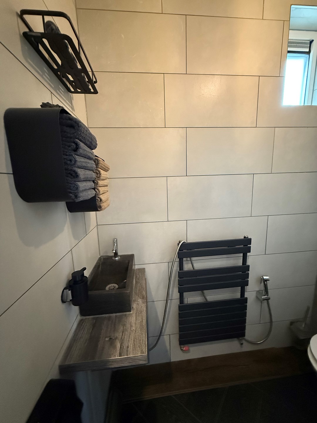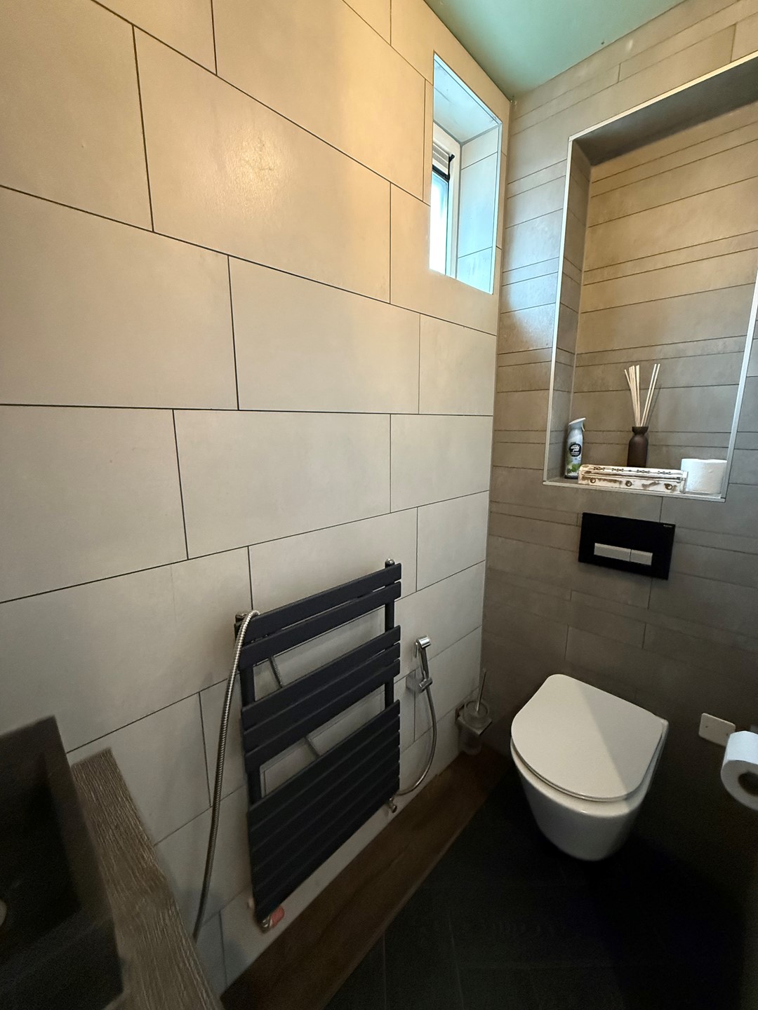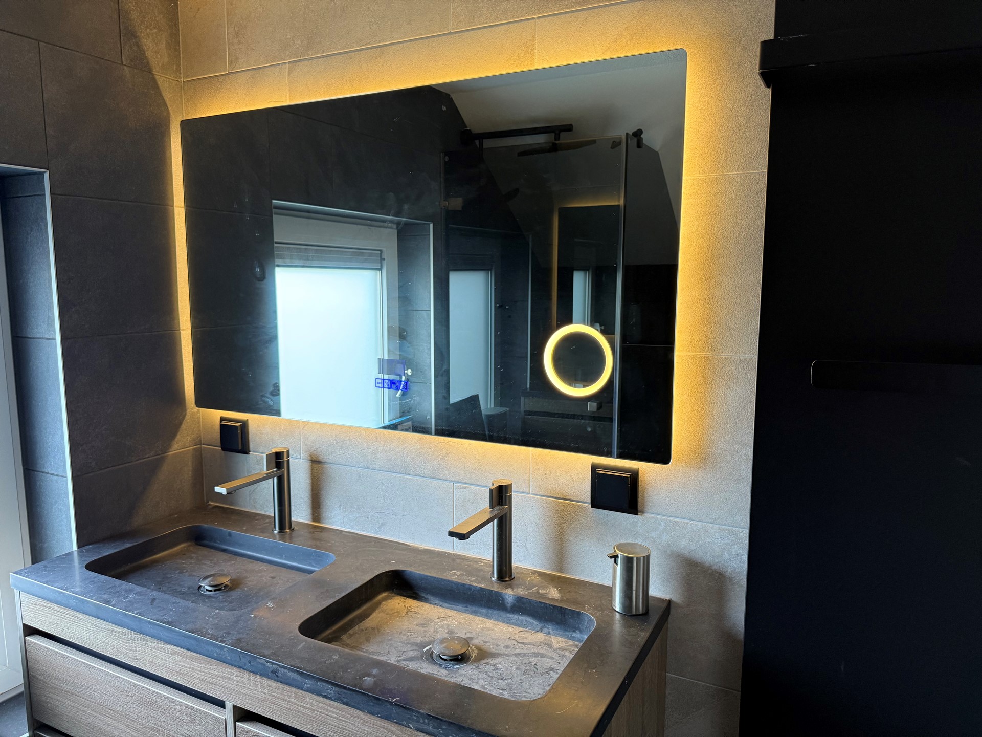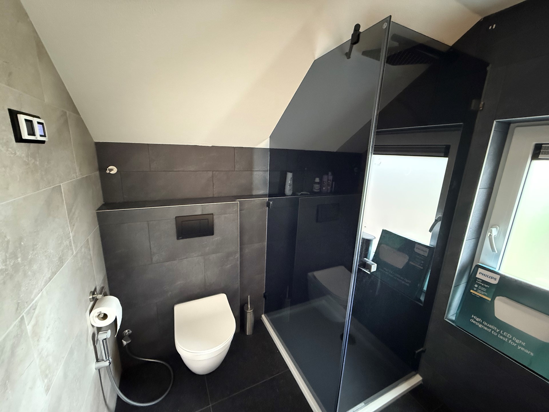 De moderne badkamer (2025) is afgewerkt met een betegelde vloer, betegelde wanden en een spuitwerk plafond. De badkamer is voorzien van een inloopdouche, toilet, wastafelmeubel met twee wastafels, spiegel met verlichting en verwarming en vloer- en wandverwarming.