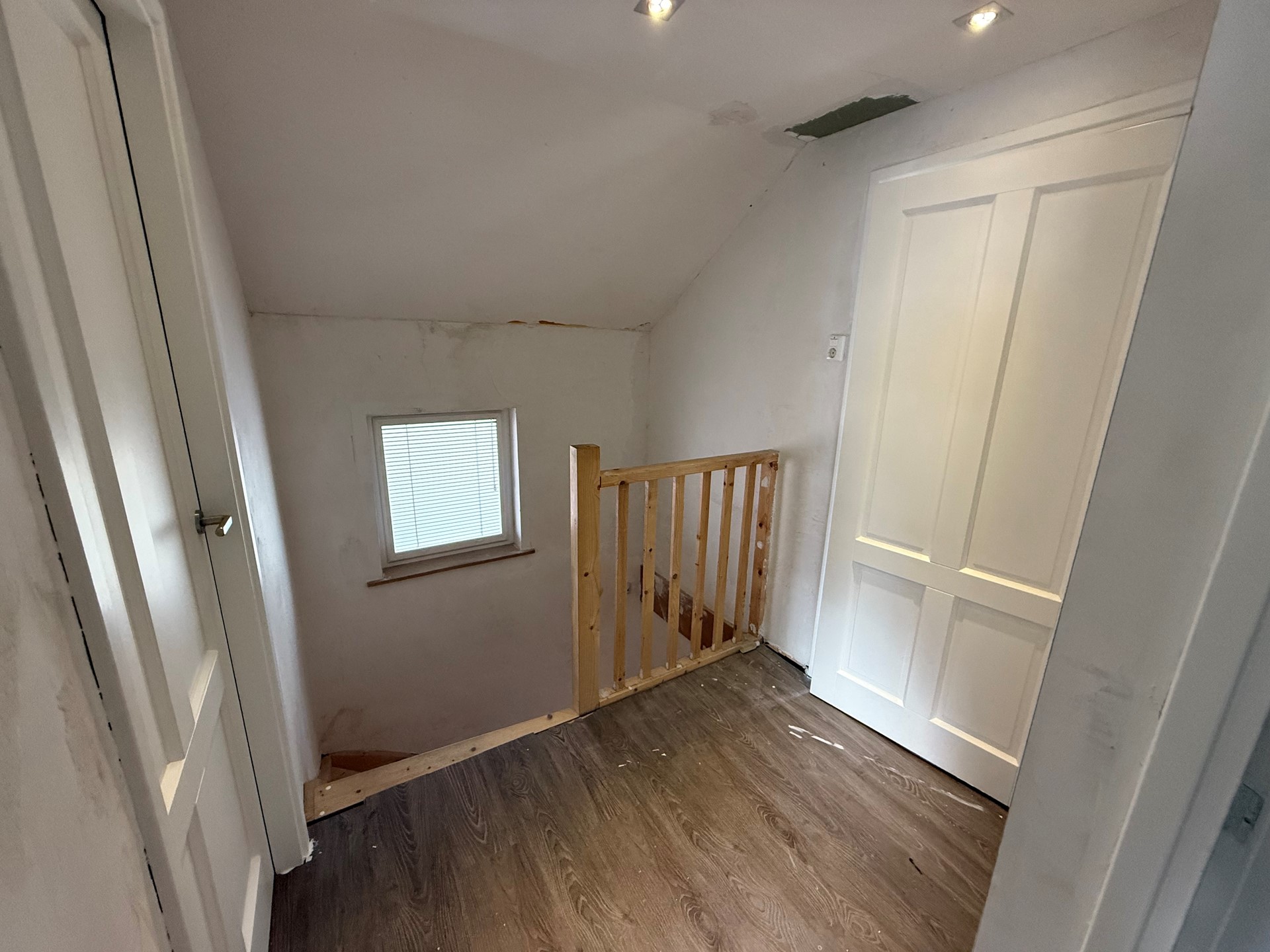 Middels de vaste trap (bij de voordeur gesitueerd) bereiken jullie de overloop op de eerste verdieping. De overloop is afgewerkt met vloerbedekking, behangklare wanden en plafond. De overloop biedt toegang tot drie slaapkamers, een bergkast, een badkamer en de bergzolder middels een vlizotrap