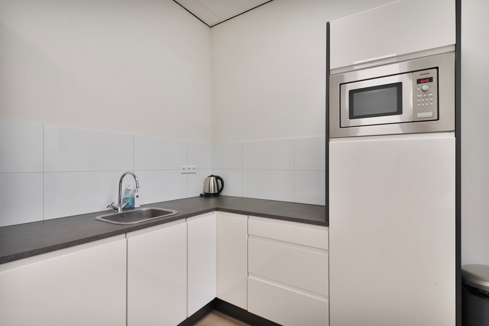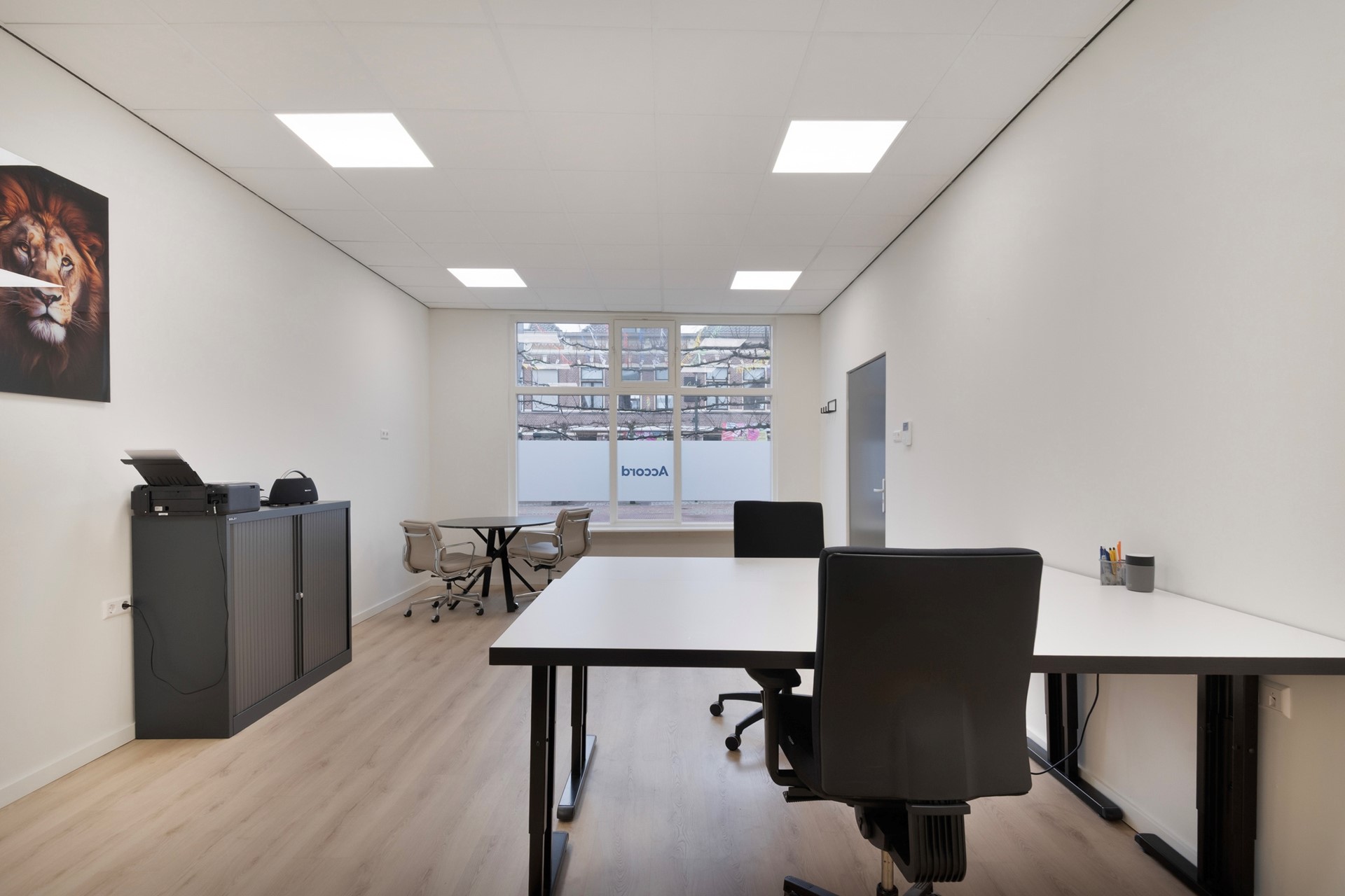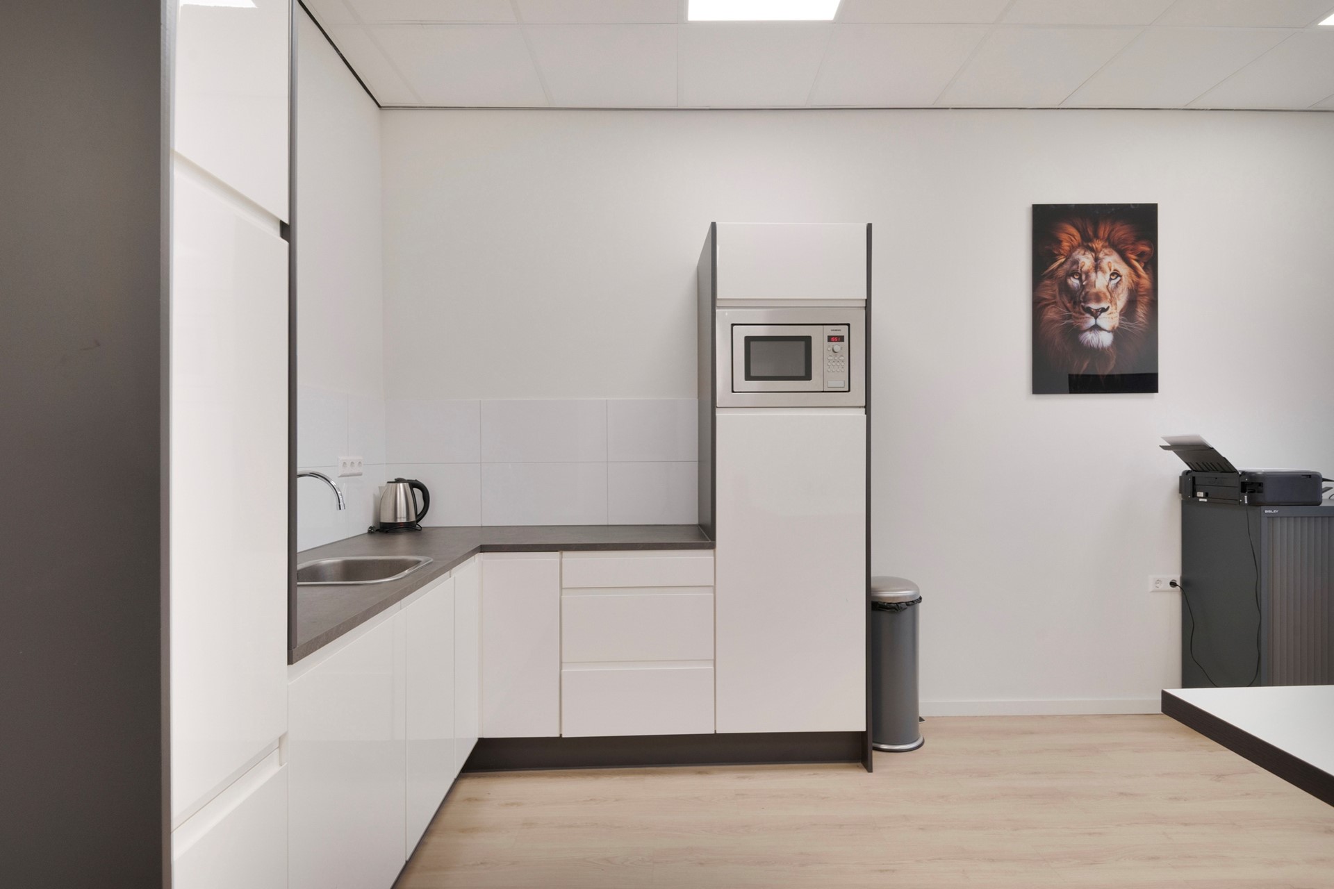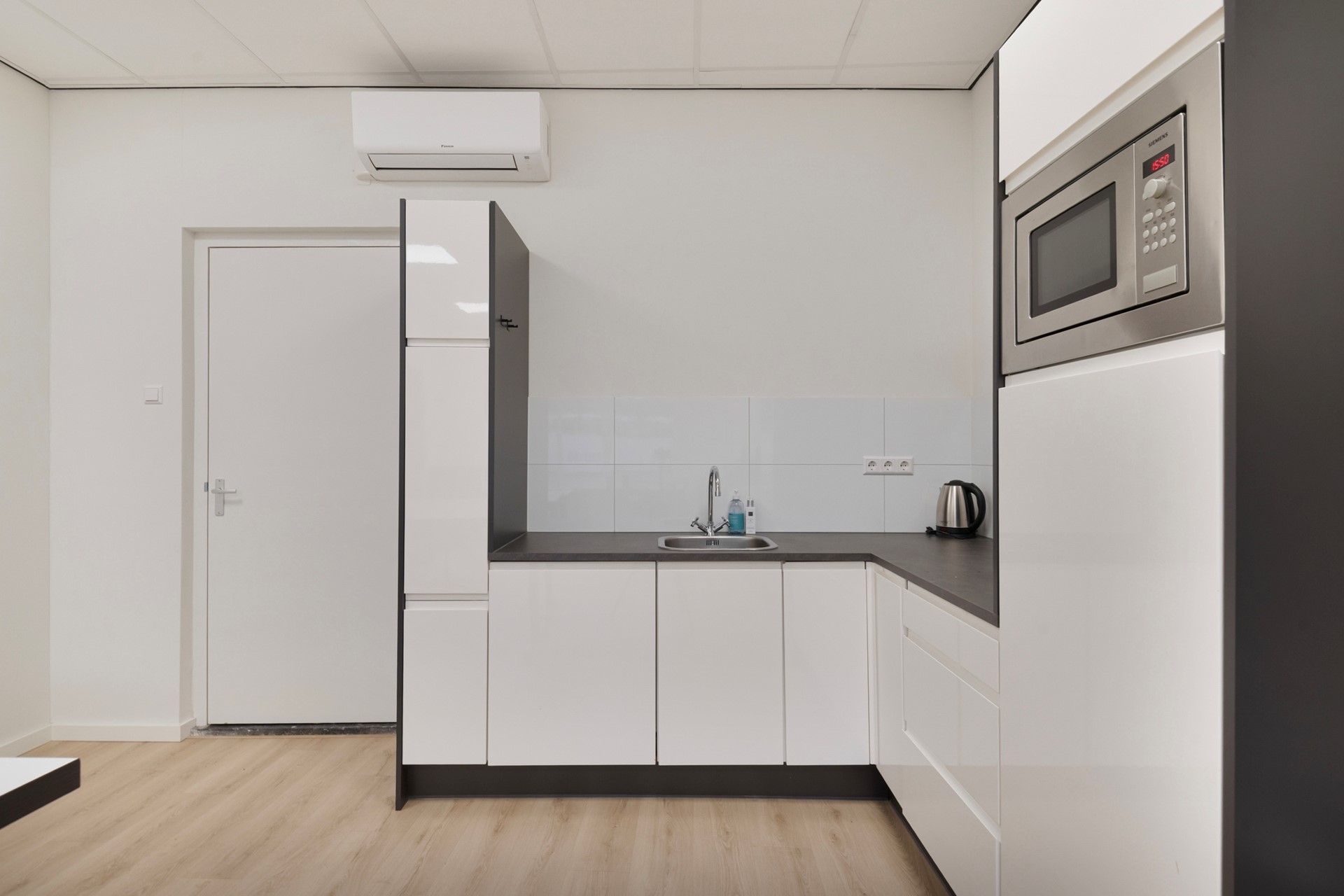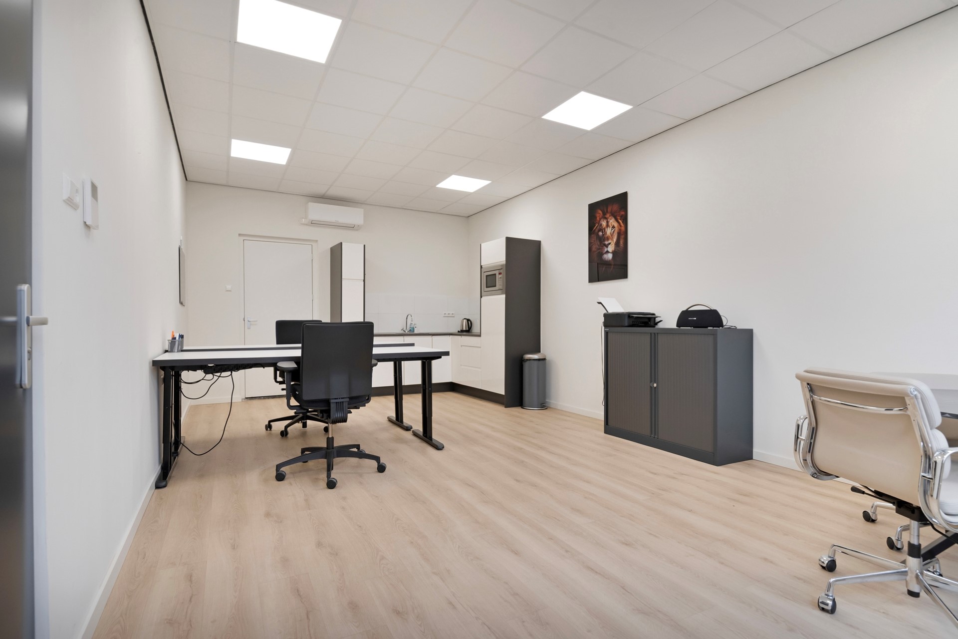 Het kantoor is afgewerkt met een laminaatvloer, gestucte wanden en een systeemplafond incl. geïntegreerde verlichting. Geniet van een optimaal binnenklimaat tijdens het werken door de airconditioning (Daikin, 2024). Het kantoor is voorzien van een bergkast en een in hoek opgestelde keukeninrichting met spoelbak, combimagnetron, vaatwasser, diverse kastruimte, koelkast en spoelbak.