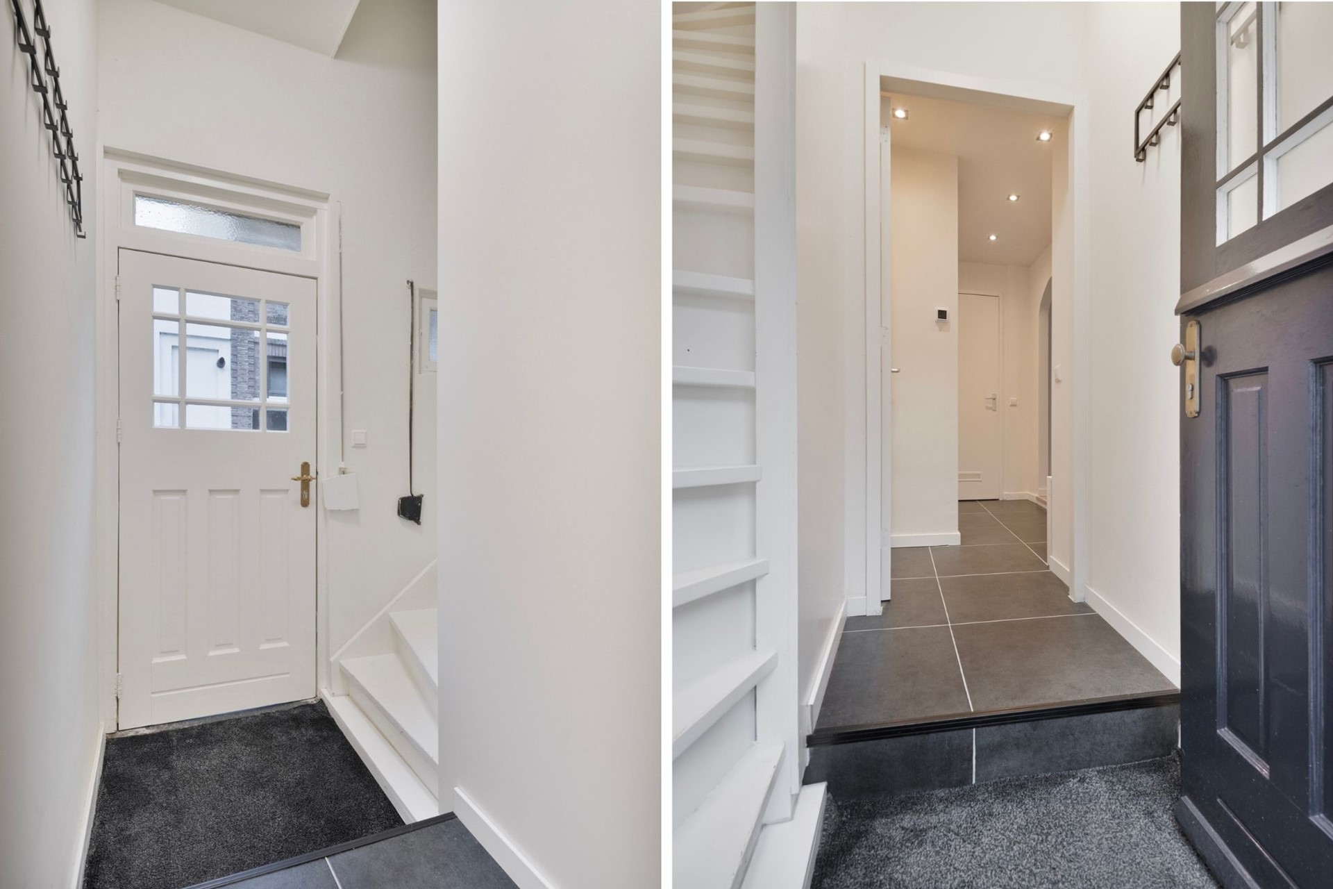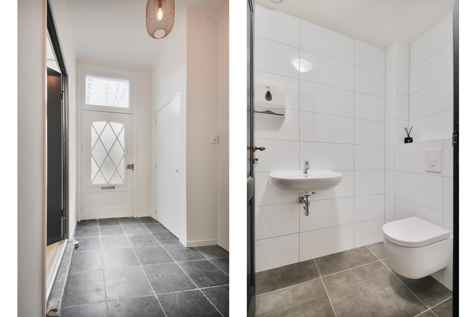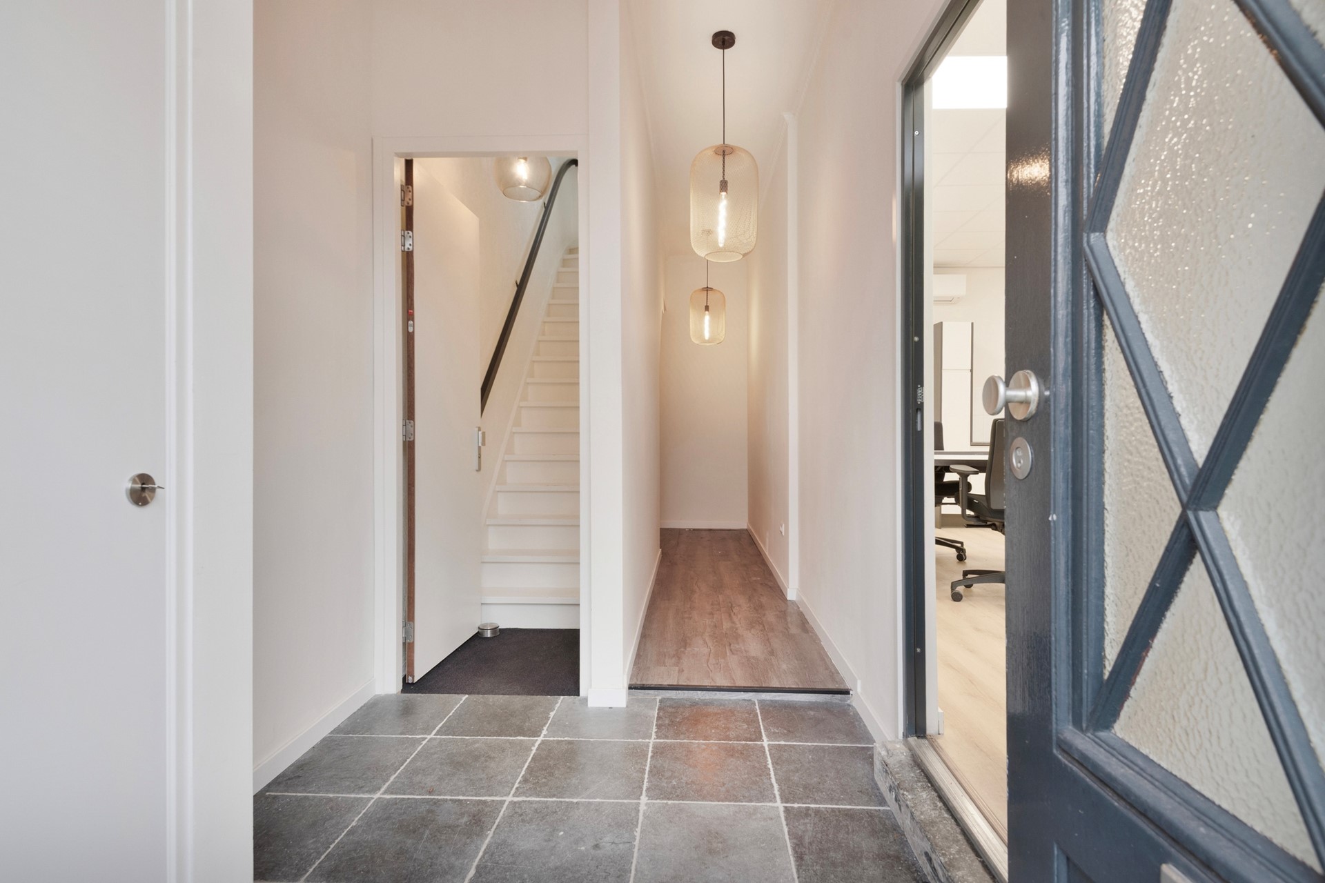 Jullie komen aan in het gezellige centrum van Steenbergen en lopen middels de voordeur het object binnen. De entree is afgewerkt met een deels betegelde en deels laminaatvloer, gestucte wanden en een gestuct plafond. De hal biedt toegang tot het kantoor, betegeld toilet met fonteintje, provisieruimte, meterkast, kelder en eerste verdieping middels een vaste trapopgang.