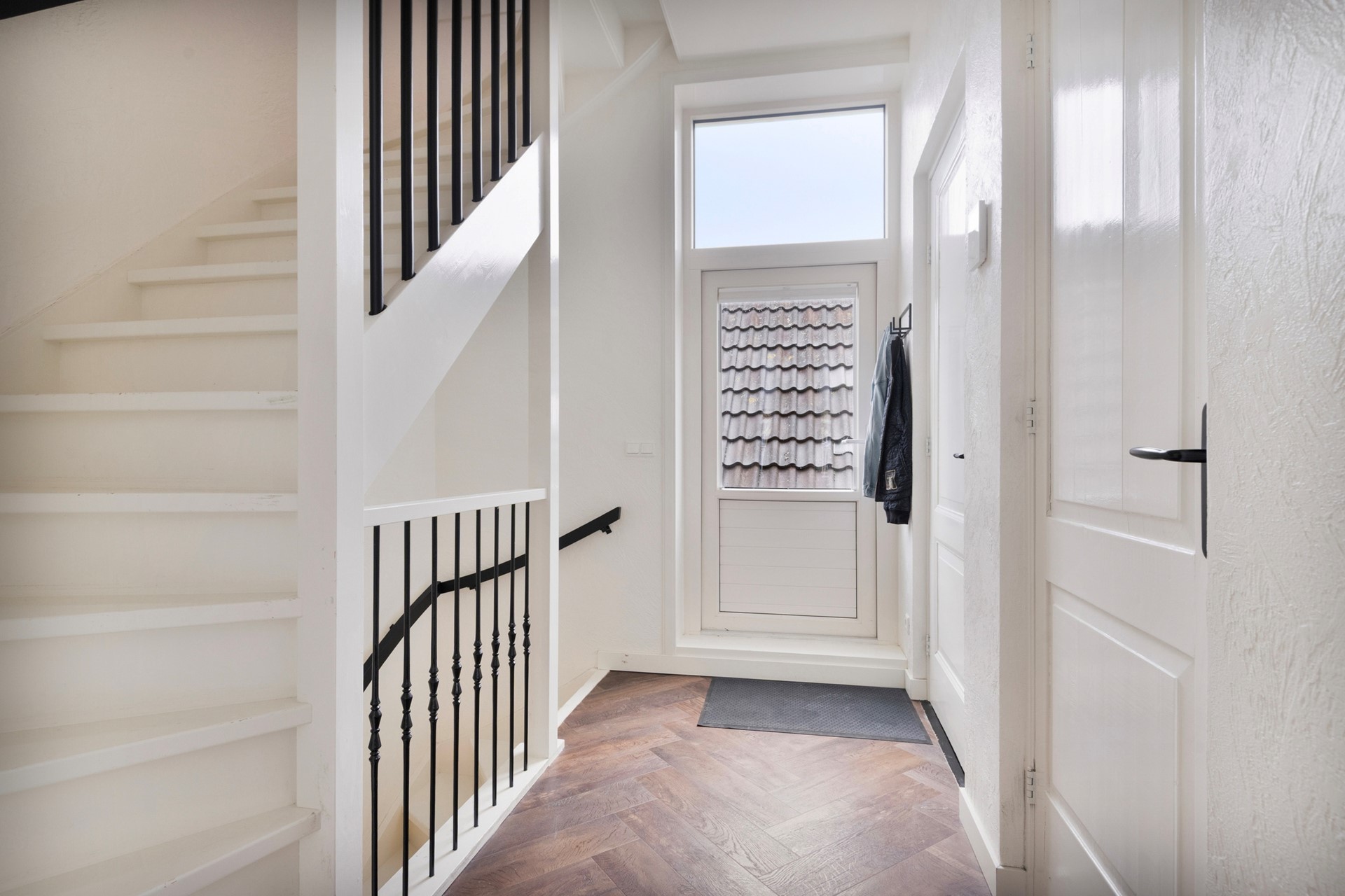 Jullie lopen door de Wijnstraat richting de entree (voorzien van een rolluik) van de achterzijde van dit object. De entree is afgewerkt met een betegelde vloer, gestucte wanden en een gestuct plafond. De entree biedt toegang tot de keuken, wasruimte en eerste verdieping middels een vaste trapopgang.