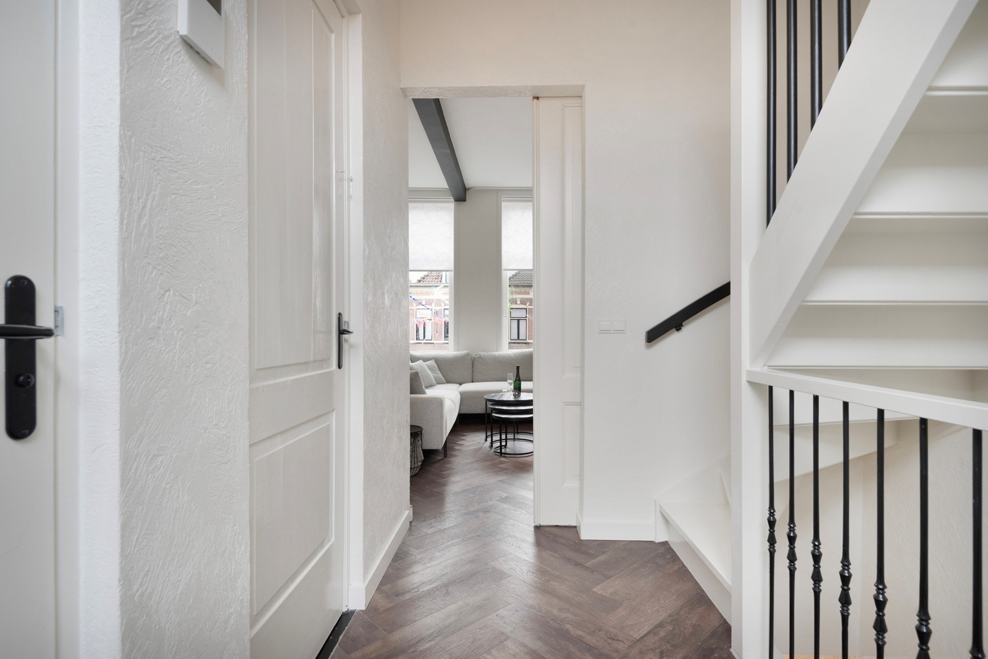 Middels de vaste trapopgang bereiken jullie de overloop op de eerste verdieping van de voorzijde van dit object. De overloop is afgewerkt met een in visgraat gelegde PVC-vloer, sierpleister wanden en een gestuct plafond. De overloop biedt toegang tot de living met open keuken, technische ruimte (incl. aansluiting witgoed, CV-Ketel (Nefit, 2022), MV-unit), badkamer, gezamenlijk dakterras en tweede verdieping middels een vaste trapopgang.