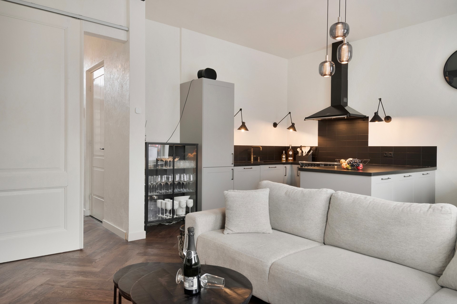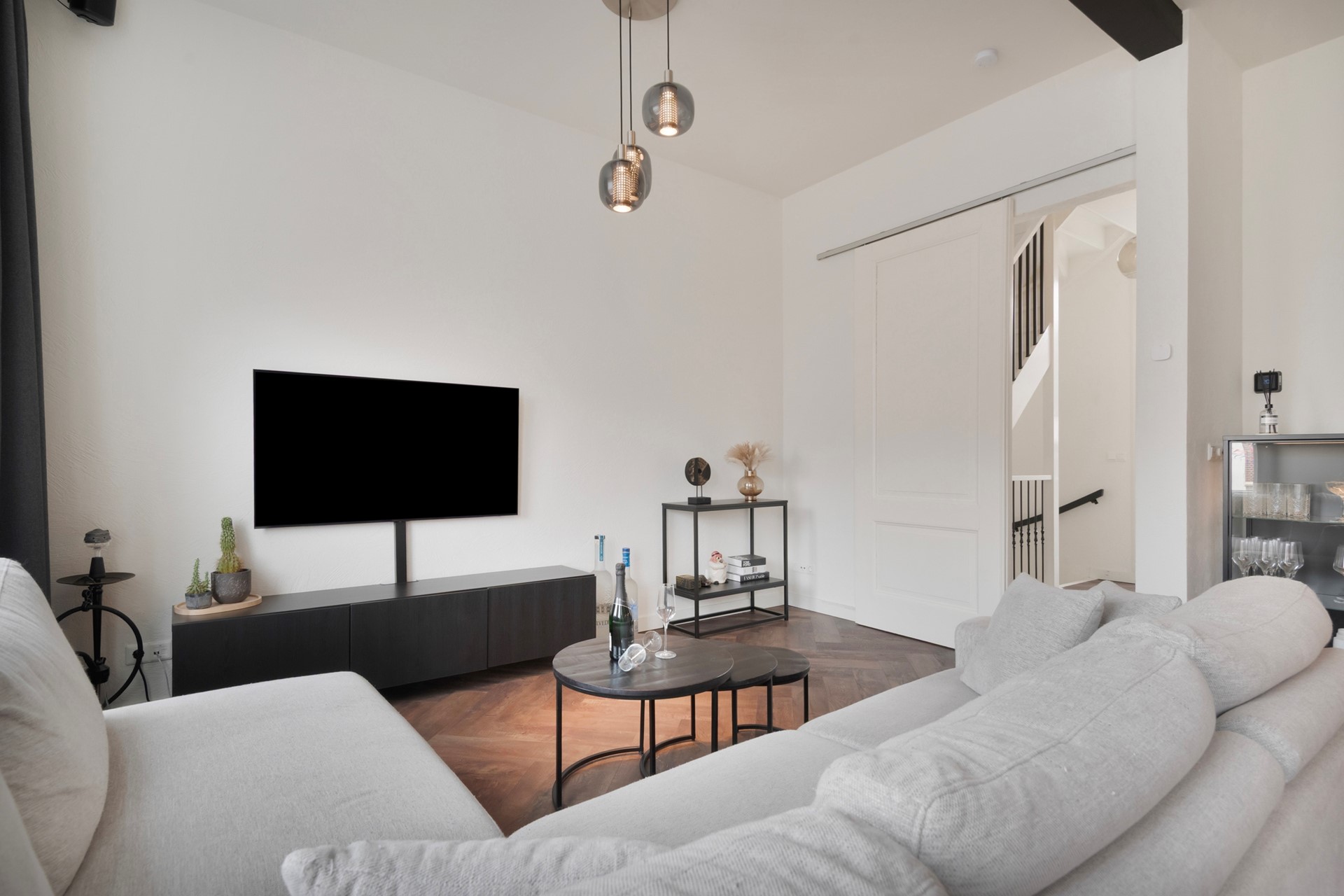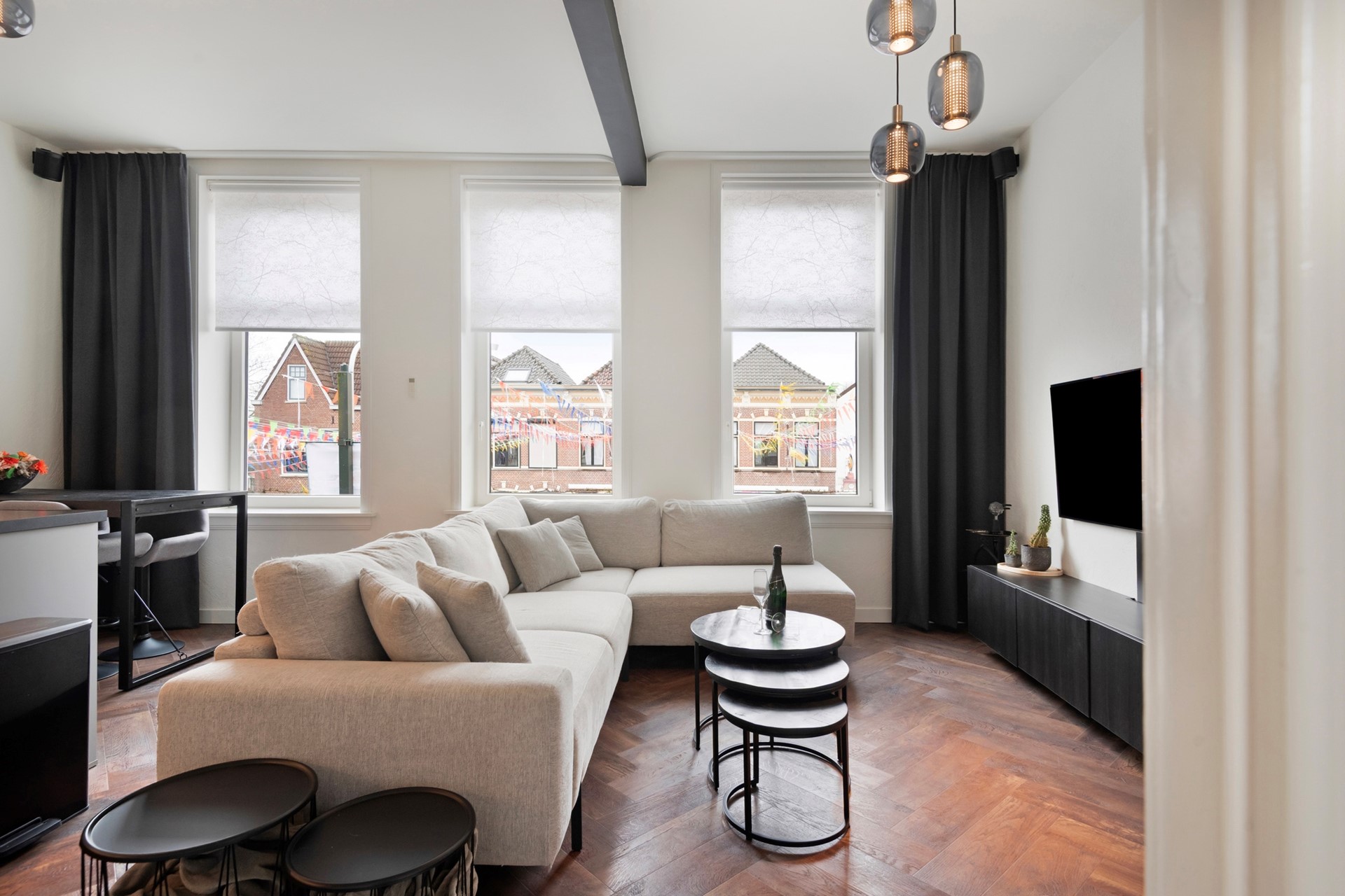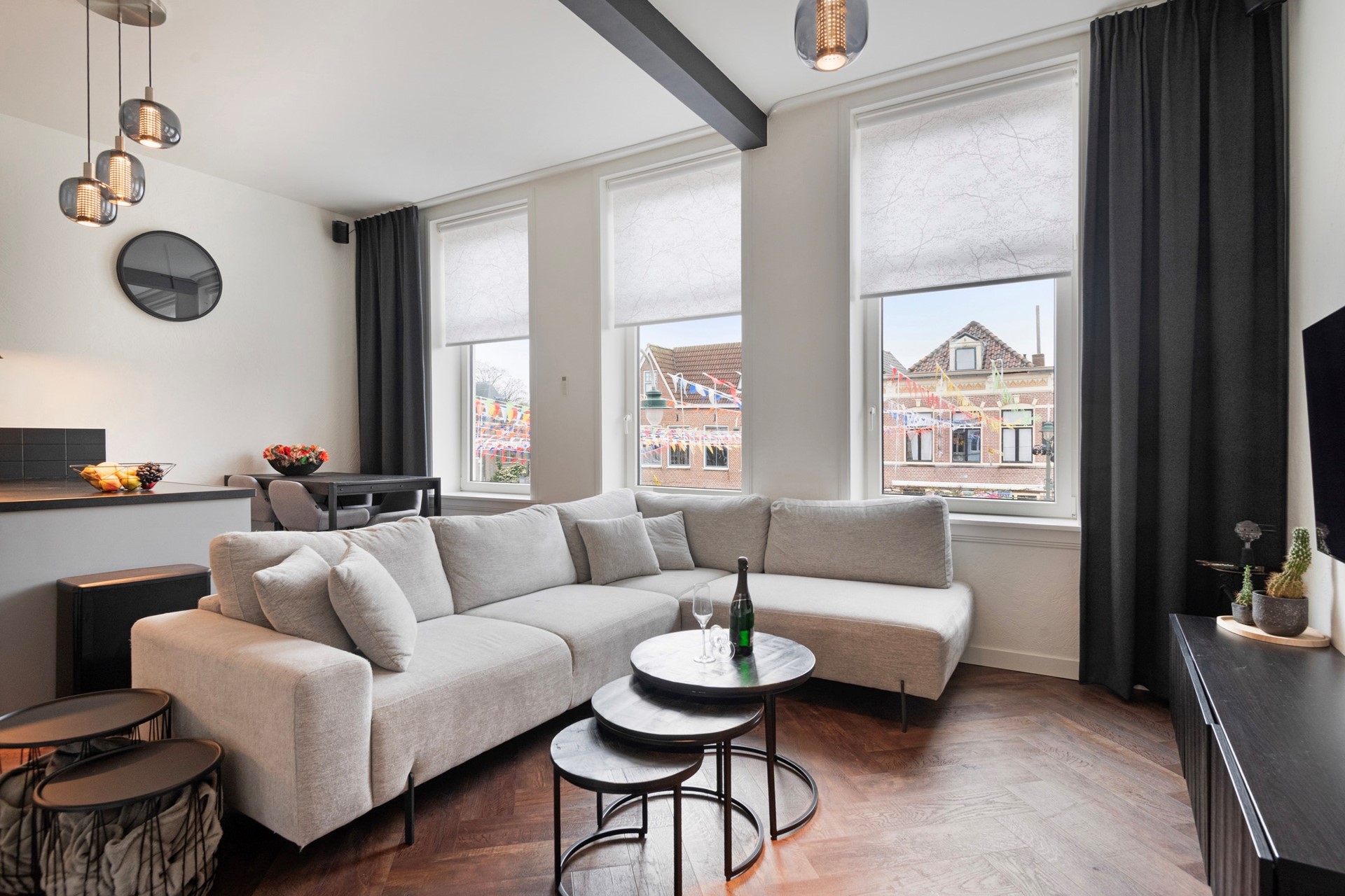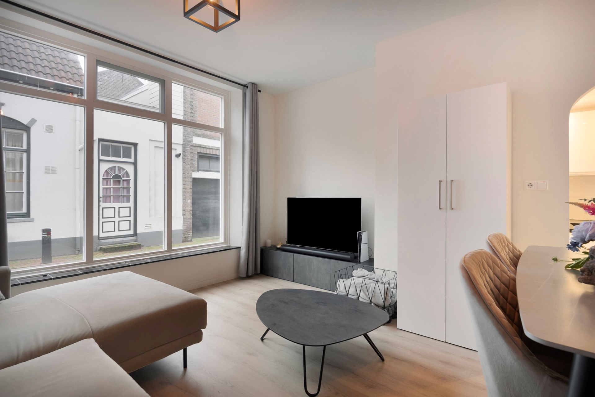 Sfeer en comfort komen samen in deze stijlvolle living met moderne open keuken! De woonkamer is afgewerkt met een in visgraat gelegde PVC-vloer (incl. vloerverwarming), sierpleister wanden en een gestuct plafond. vanuit de woonkamer heb je een uniek uitzicht over de markt van Steenbergen!