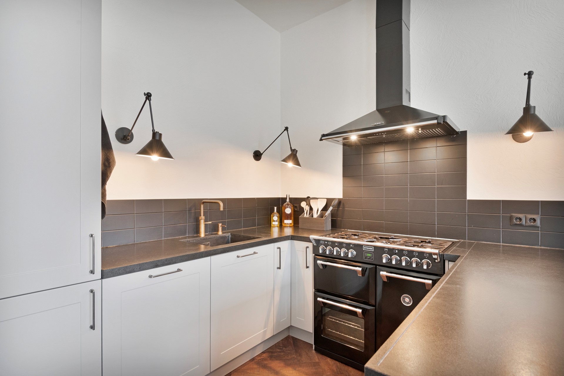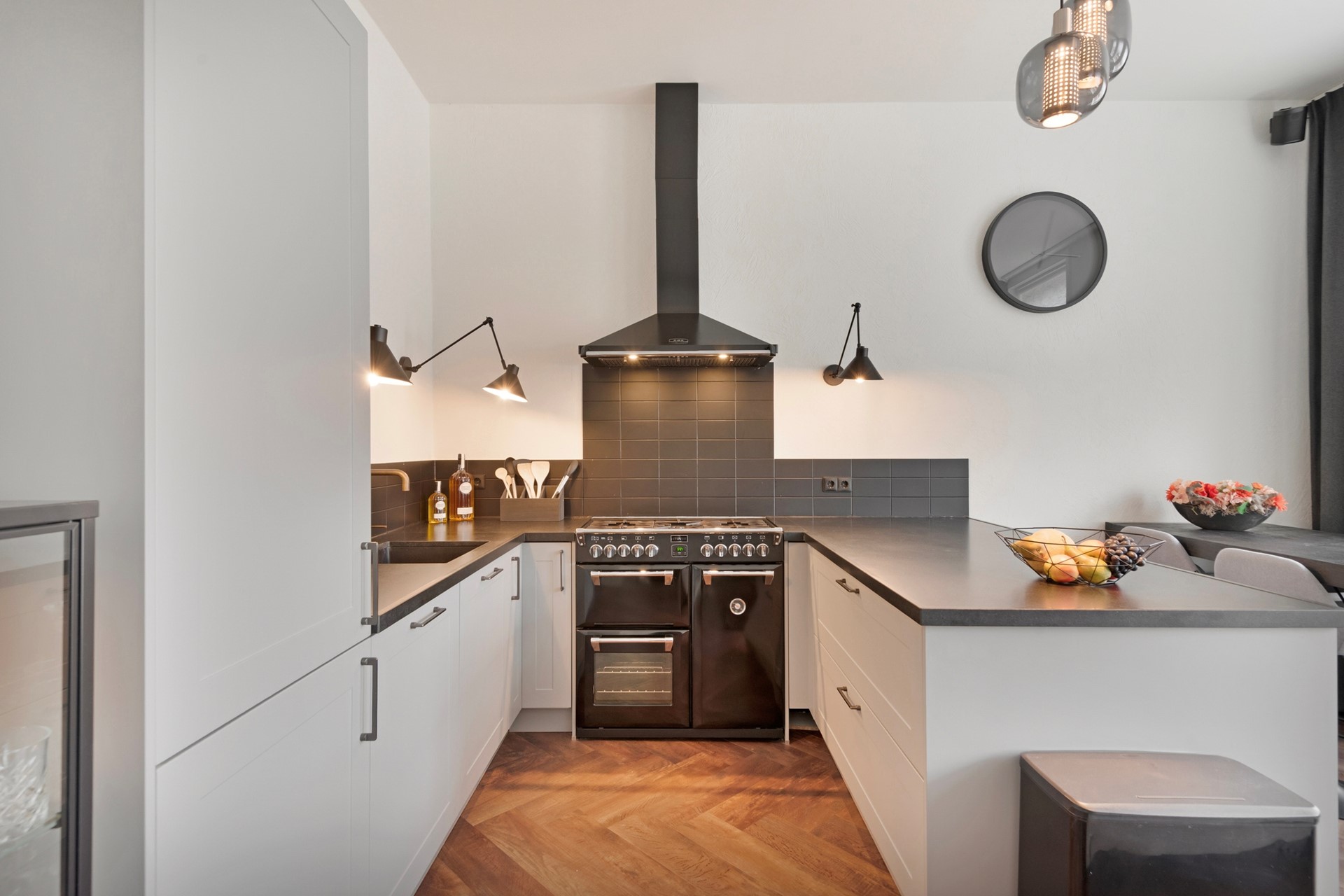 Koken is een feestje in de luxe keuken met riant fornuis, Quooker en volop werkruimte. De open keuken is afgewerkt met een in visgraat gelegde PVC-vloer (incl. vloerverwarming), sierpleister wanden en een gestuct plafond. De in U-vorm opgestelde keukeninrichting is voorzien van een riant gasfornuis met 3 ovens (STOVES), spoelbak (incl. Quooker en zeeppomp), vaatwasser, koelkast, vriezer, kastruimte en afzuigkap.