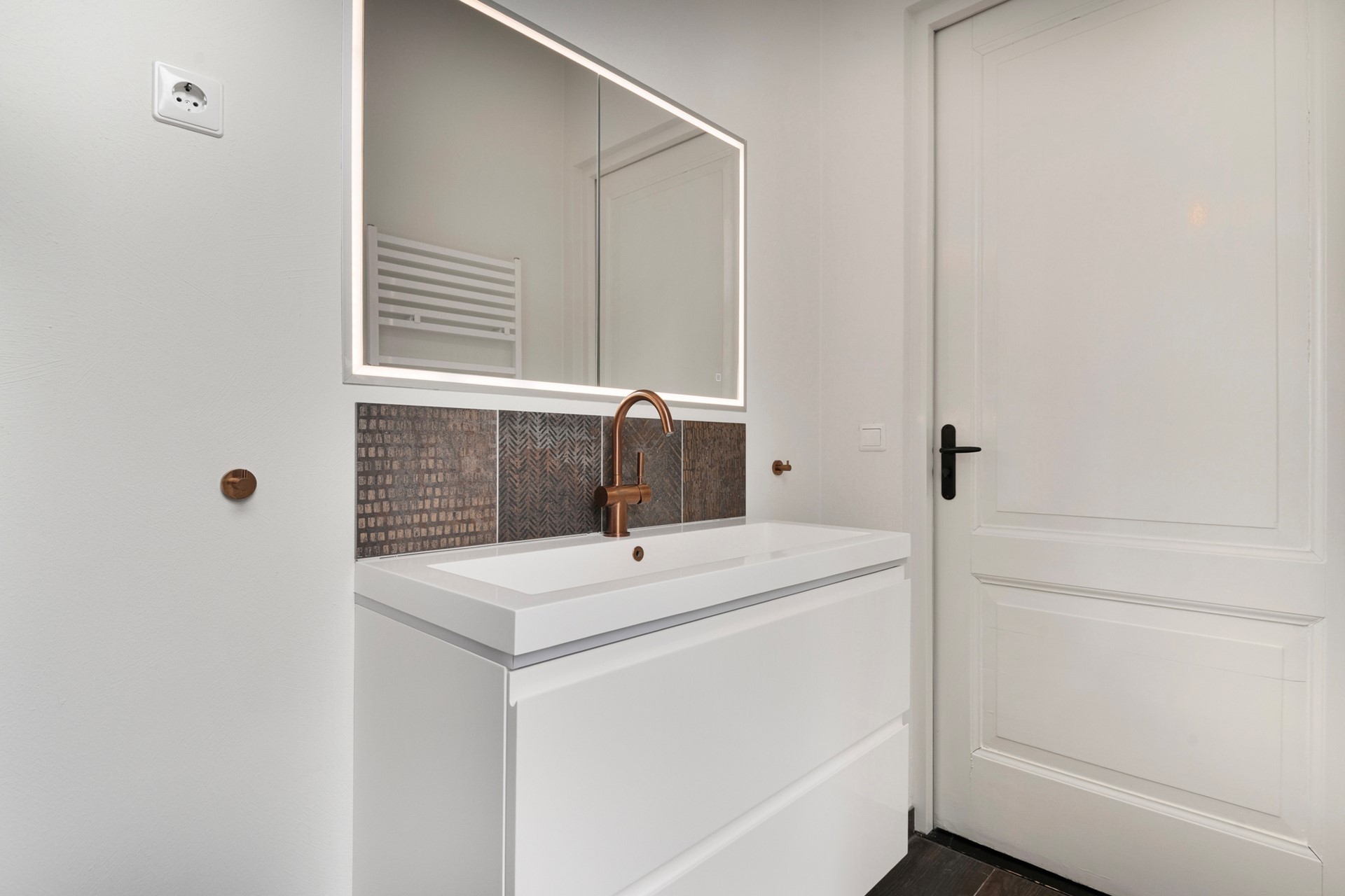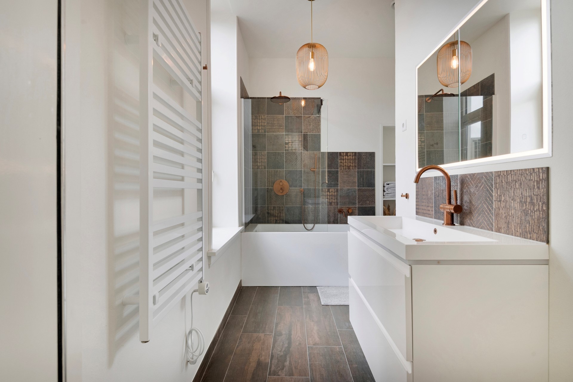 Pure luxe! Deze luxe badkamer is een ware eyecatcher met hoogwaardige materialen en een stijlvolle afwerking. De moderne badkamer is afgewerkt met een keramisch parketvloer, deels betegelde wanden en een gestuct plafond. De badkamer is voorzien van een ligbad, wastafelmeubel, design radiator en ligbad.