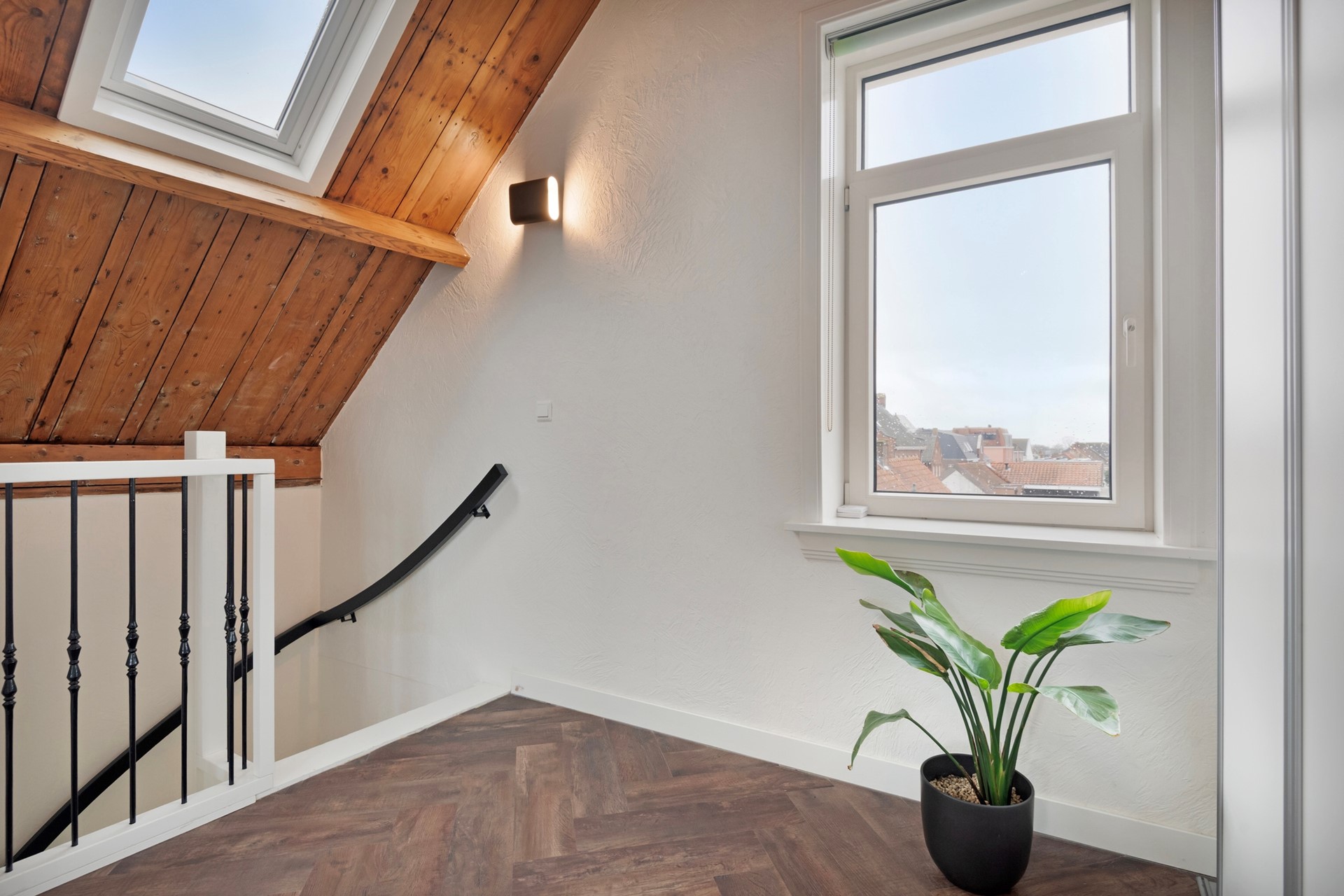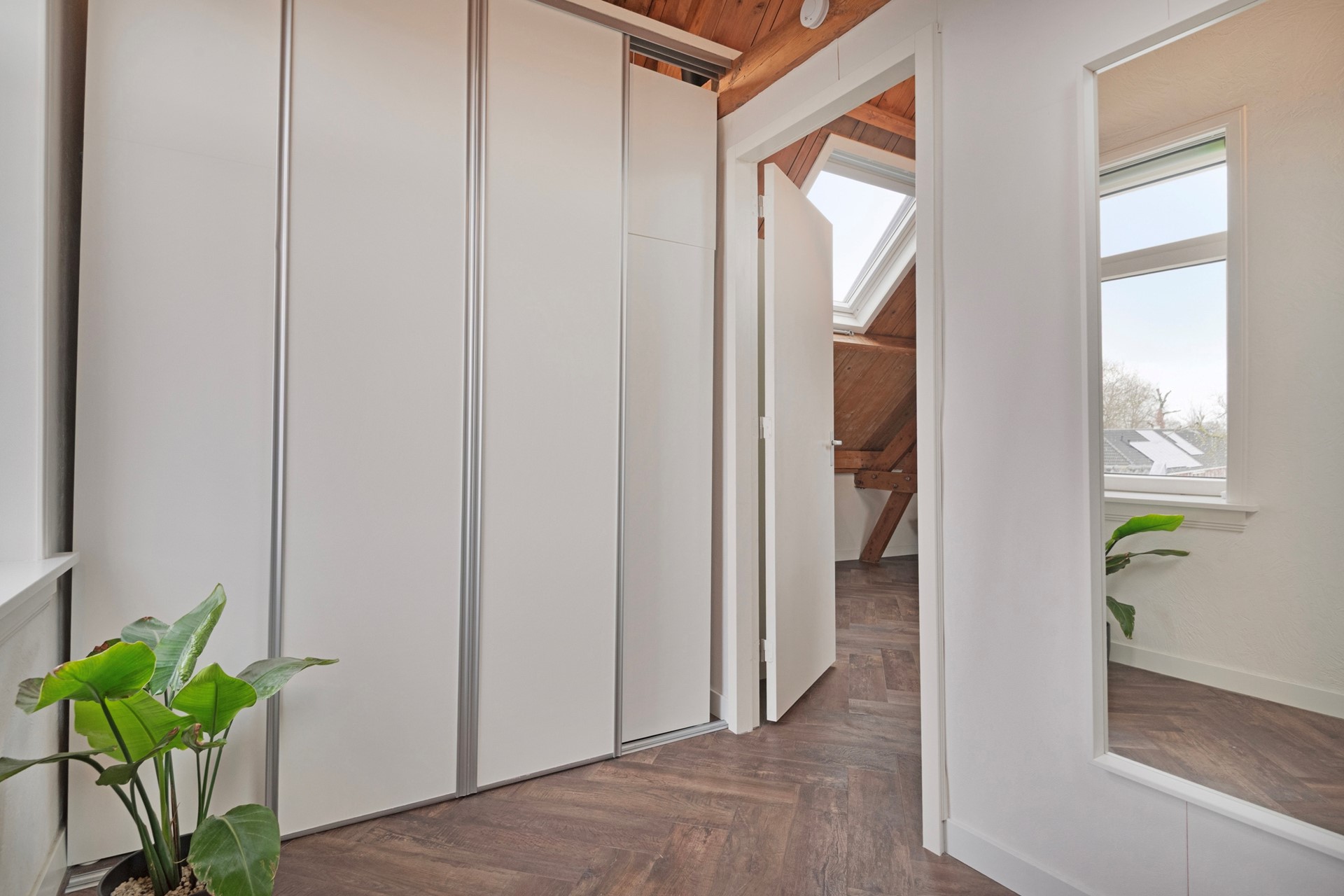 Middels de vaste trap op de eerste verdieping bereiken jullie de overloop op de tweede verdieping. De overloop is afgewerkt met een in visgraat gelegde PVC-vloer incl. vloerverwarming, sierpleister wanden en een houten (balken) plafond. De overloop biedt toegang tot de inloopkast en de riante slaapkamer.