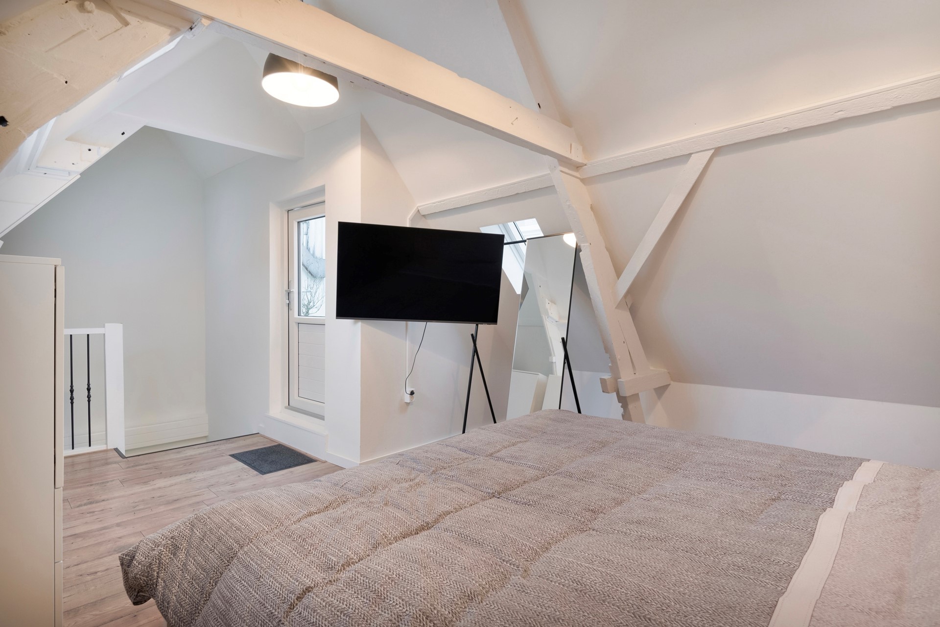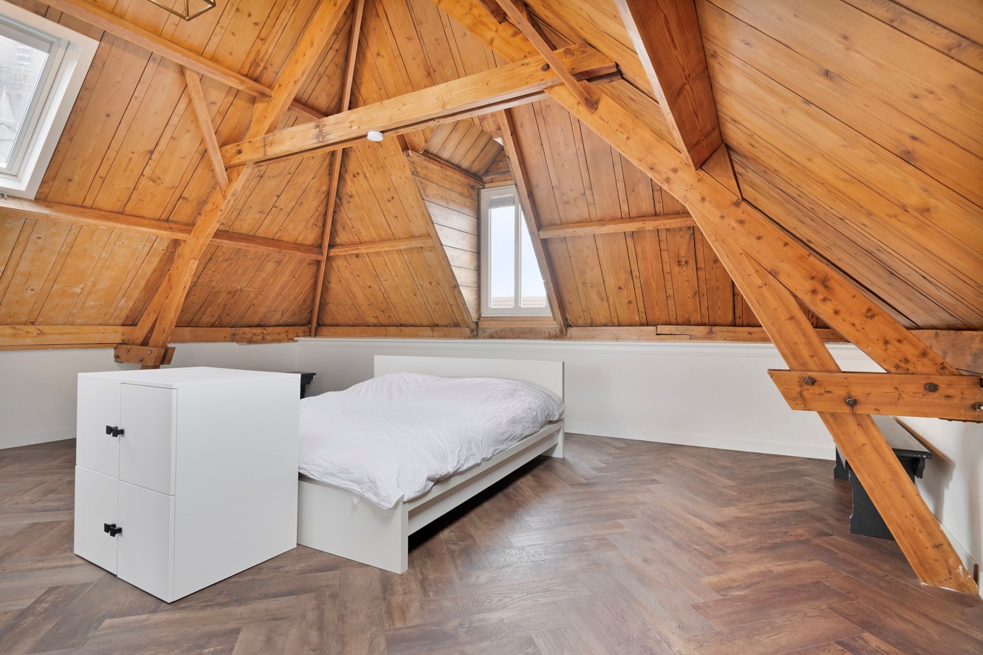 De slaapkamer is afgewerkt met een in visgraat gelegde PVC-vloer incl. vloerverwarming,, sierpleister wanden en een houten (balken) plafond.