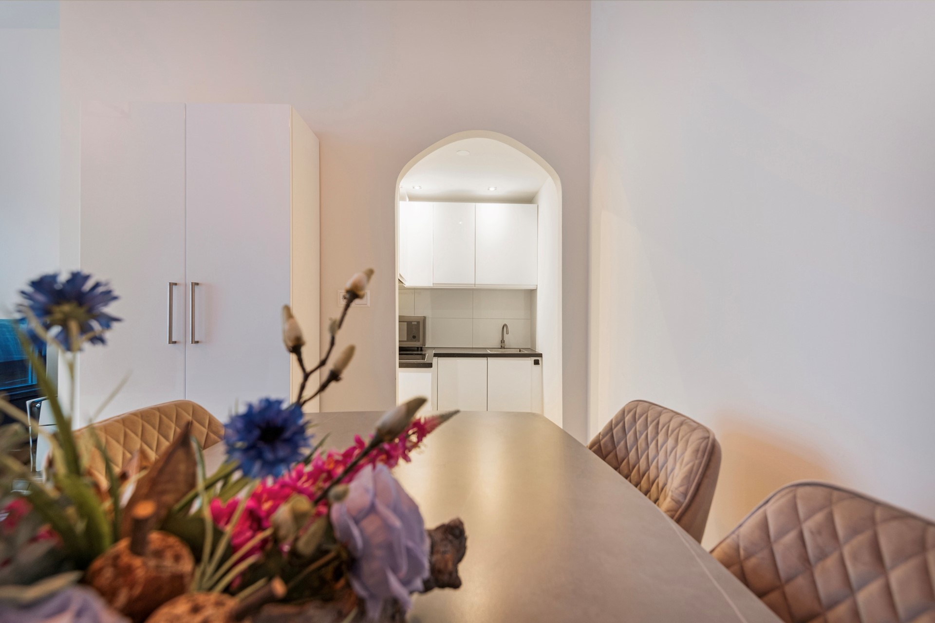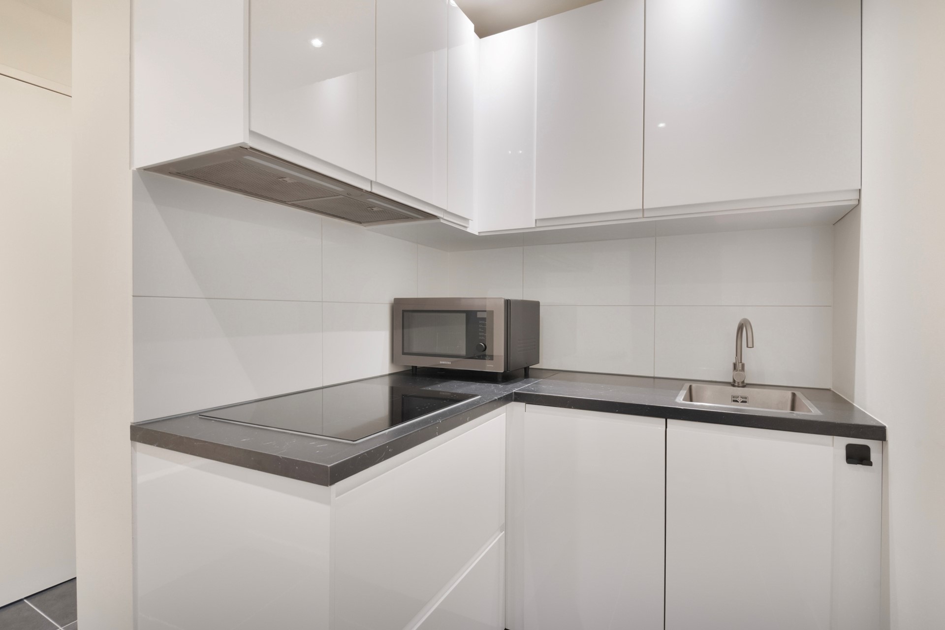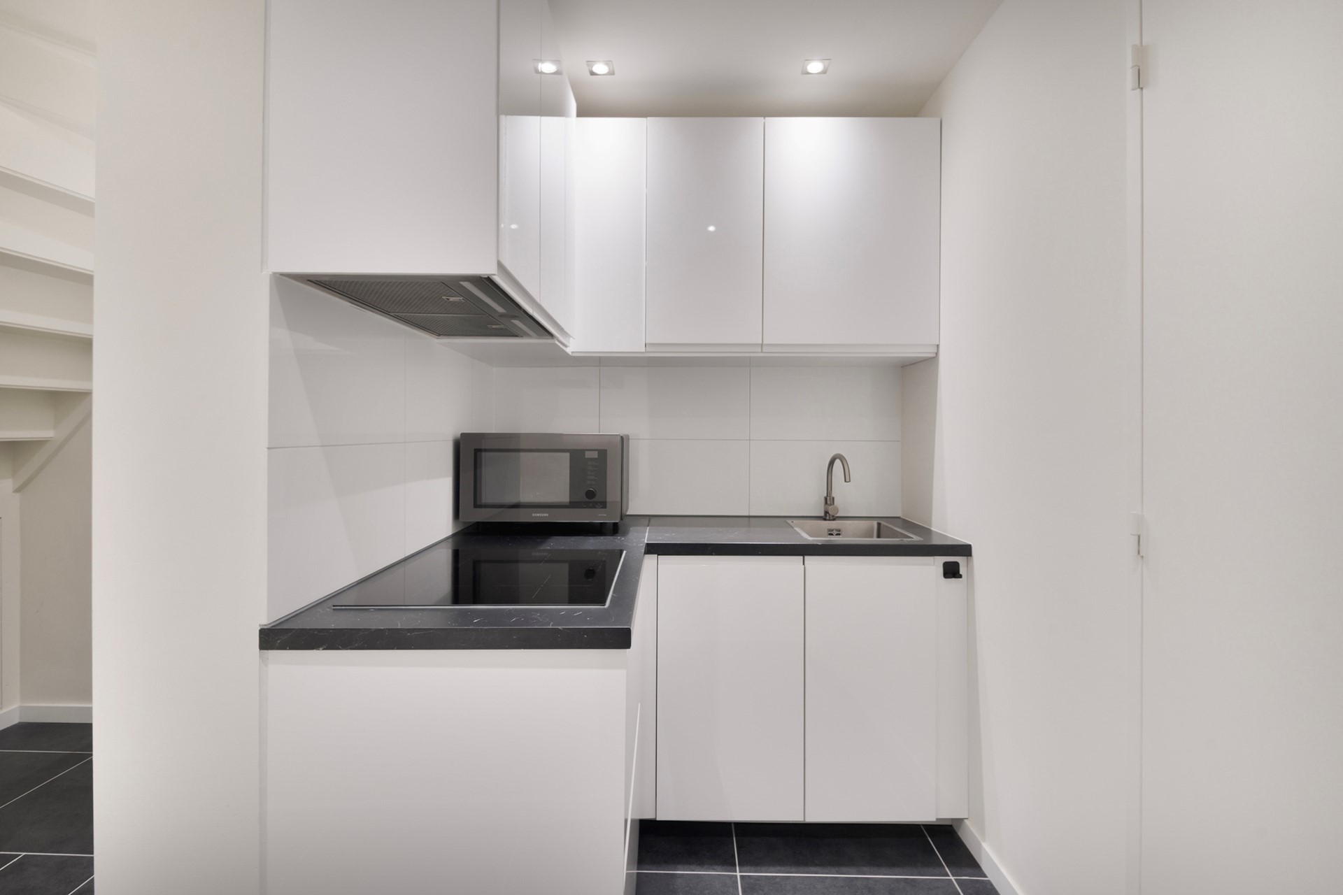 De keuken is afgewerkt met een betegelde vloer, gestucte wanden en een gestuct plafond. De in hoek opgestelde keukeninrichting is voorzien van een inductiekookplaat, vaatwasser, onder- en bovenkastjes, afzuigkap en een spoelbak. De keuken biedt toegang tot de kamer.
