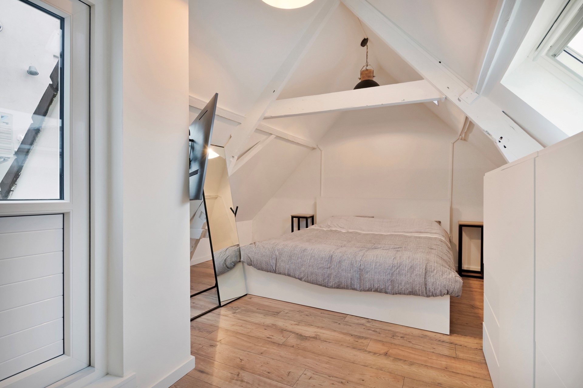 Middels de vaste trap op de begane grond bereiken jullie de slaapkamer op de eerste verdieping. De slaapkamer is afgewerkt met een laminaat vloer, gestucte wanden en een gestuct plafond met balken. De slaapkamer biedt toegang tot het gezamenlijk dakterras.