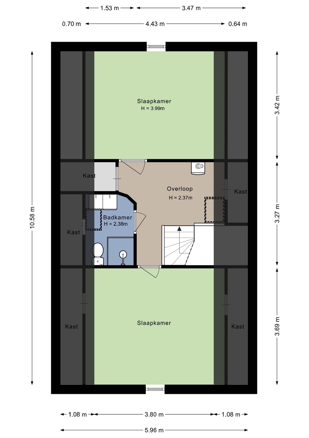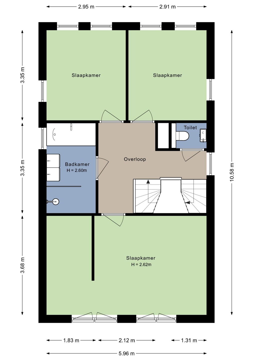 Middels de vaste trap op de begane grond bereiken jullie de overloop op de eerste verdieping. De overloop is afgewerkt met een laminaat vloer, gestucte wanden en een gestuct plafond. De overloop biedt toegang tot 3 slaapkamers, de badkamer, separaat toilet en tweede verdieping middels een vaste trapopgang.