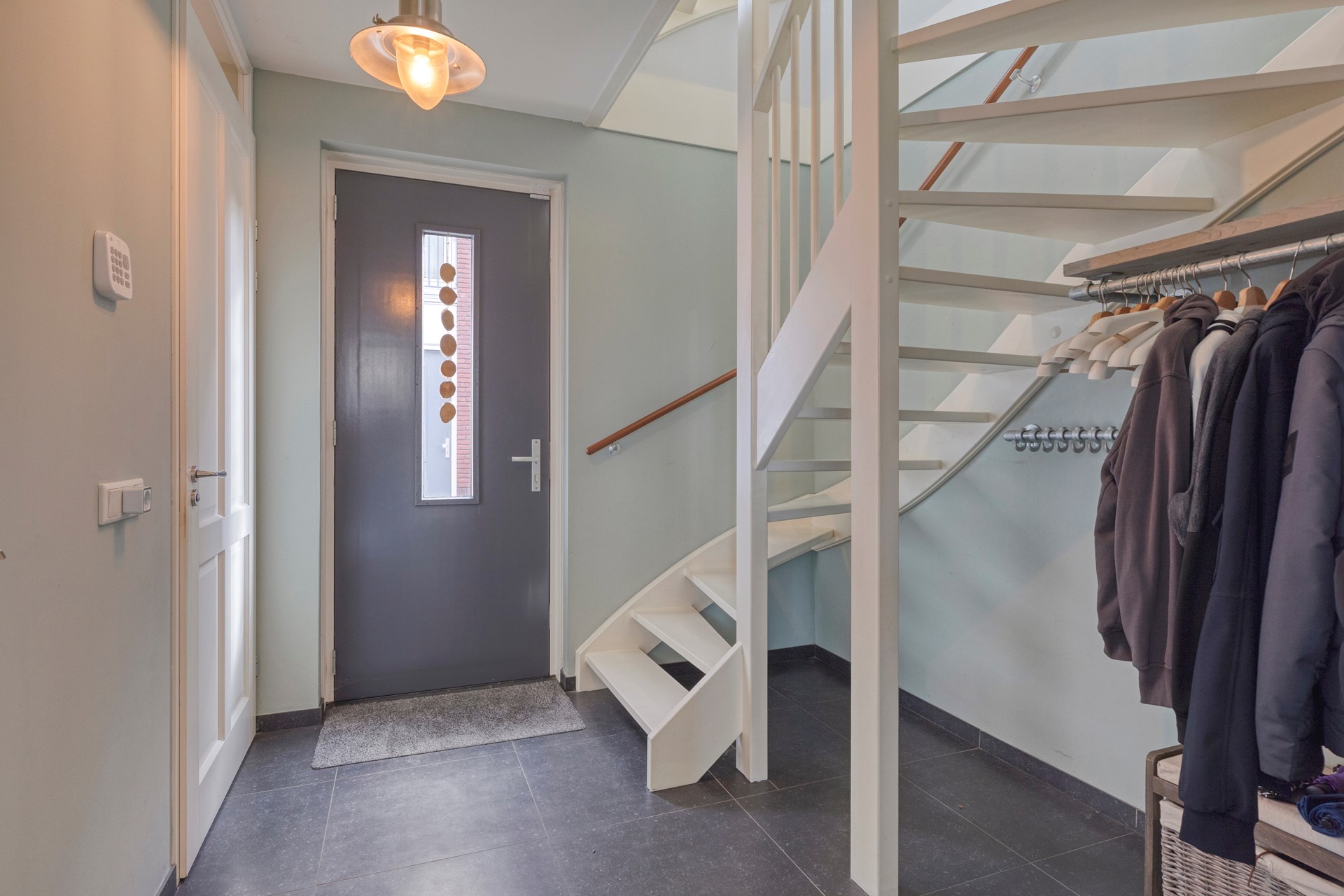 Jullie komen aan in deze geliefde woonwijk, parkeren de auto op de oprit en lopen de woning binnen. De hal c.q. entree is afgewerkt me een betegelde vloer, gesauste wanden en een gestuct plafond. De hal biedt toegang tot de meterkast, woonkamer, betegeld toilet met fonteintje, garderobe en eerste verdieping middels een vaste trapopgang.